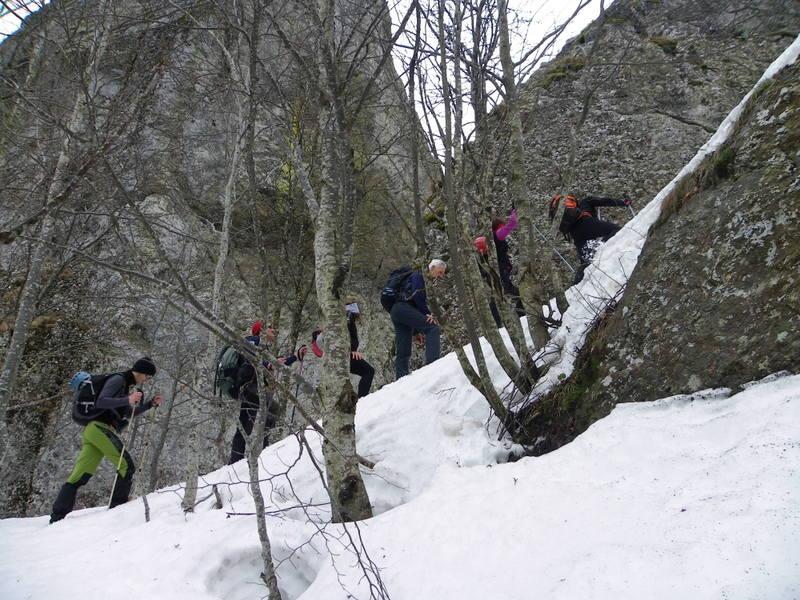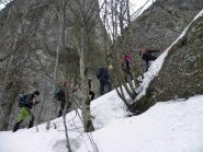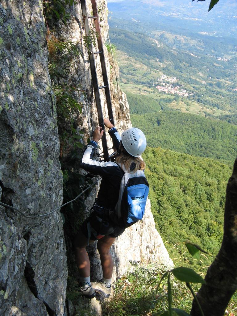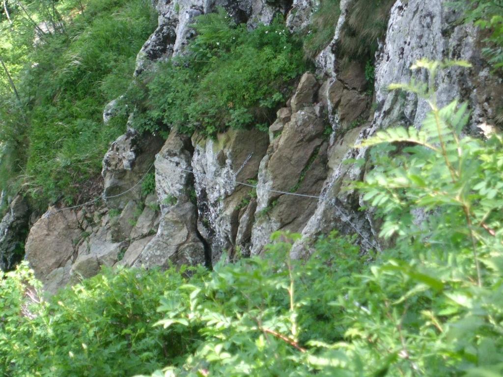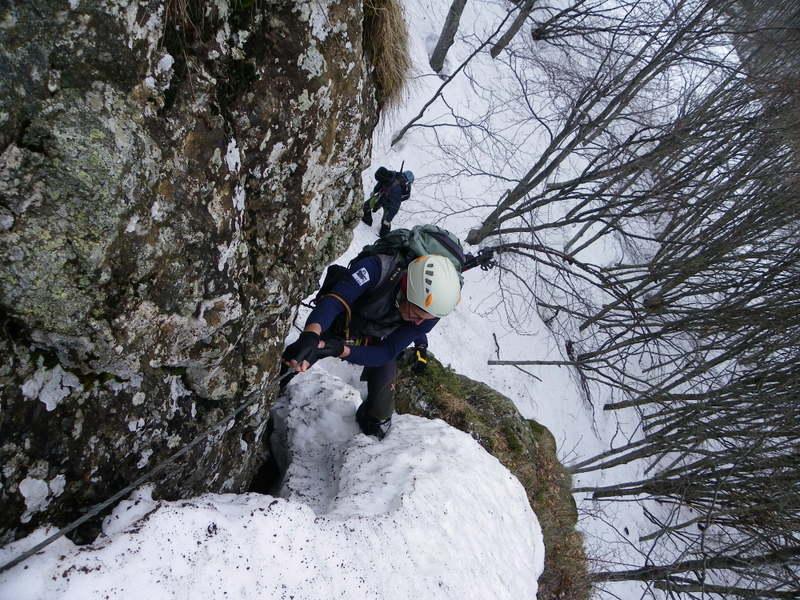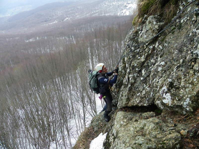 Dopo i primi metri si ha subito un breve traverso, leggermente esposto, che aggira un roccione; si prosegue per alcuni gradoni e passaggi erbosi fino ad incontrare la prima scala del percorso. In successione, si ha uno stretto passaggio ed un altro traverso che precede un tratto verticale dove sono posizionati alcuni gradini in ferro; si incontra la prima via di fuga che si riunisce al sentiero che corre a fianco della ferrata e permette di tornare al bivacco Sacchi o portarsi sotto il monte Bue. Un altro traverso ed un breve tratto di risalita con un successivo traverso portano ai piedi di una scala; si percorre un ultimo traverso e si arriva all’ultima scala, superata la quale si arriva ad un muretto oltre il quale si trova un pianoro, che è anche il punto di arrivo della ferrata. Dal pianoro si vedono il monte Bue, Maggiorasca, il monte Nero, il Ragola.