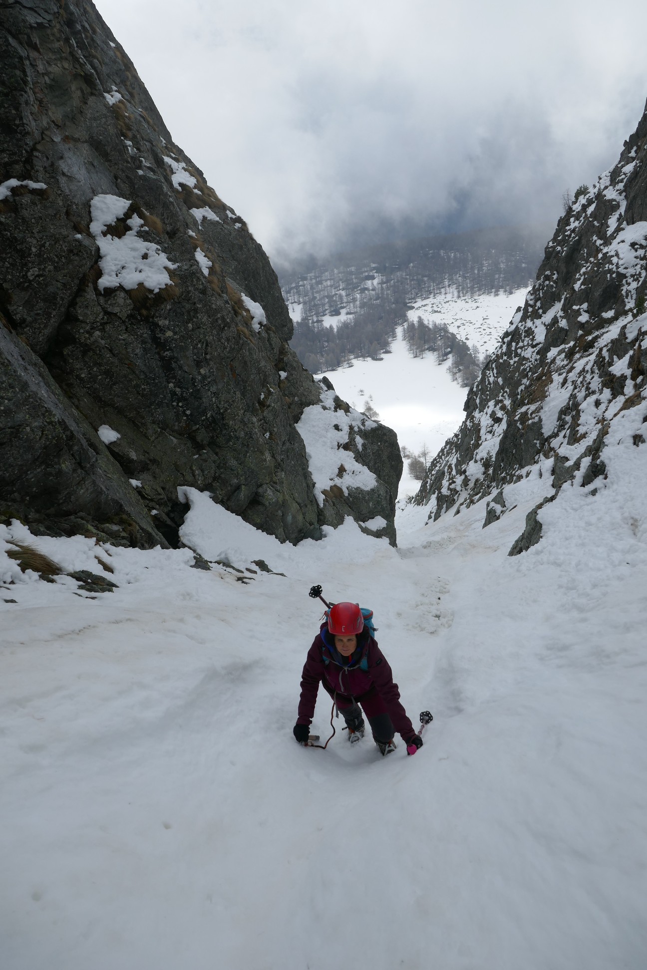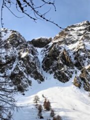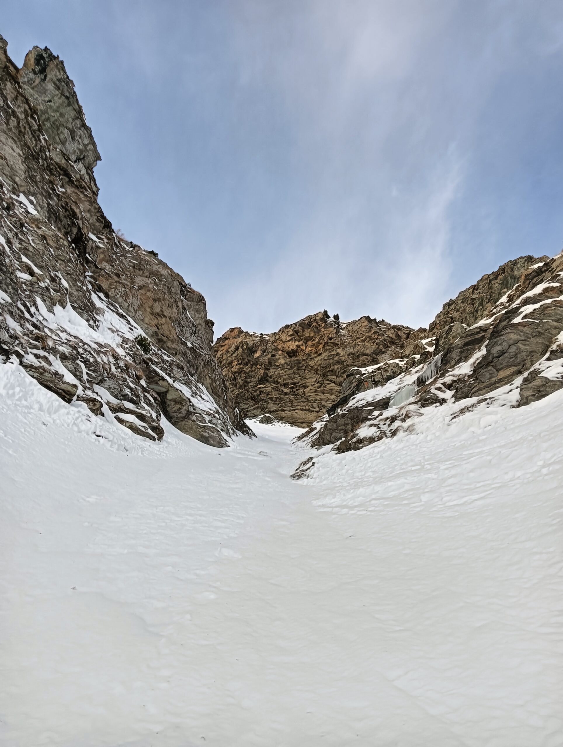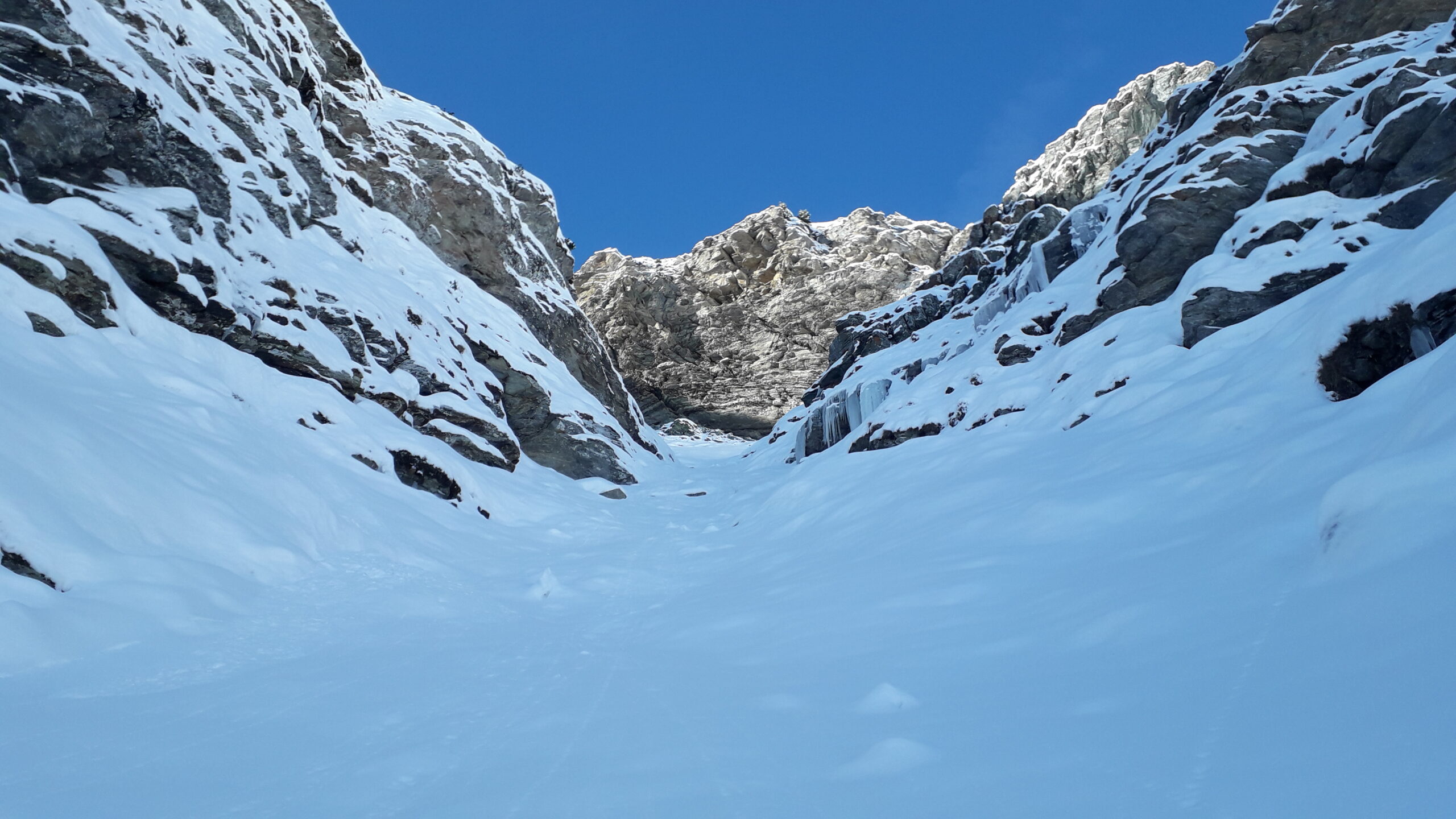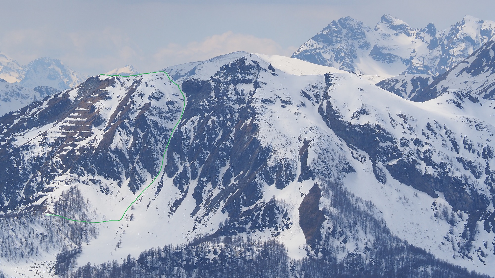 Seguire il canale dritto e incassato tra pareti rocciose (40°-45°). In alto la strada sembra sbarrata da un muro strapiombante, ma il canale lo aggira a sinistra e conduce sulla cresta spartiacque. Di nuovo verso sinistra raggiungere il Col Sud del Mont Méabé per ripido pendio con roccette affioranti. Continuare in cresta facilmente (cornici a E) fino all’anticima con croce del Mont Méabé. Da lì scendere al punto di partenza per sentiero escursionistico. A differenza del canale, il sentiero di solito è presto libero dalla neve in primavera.