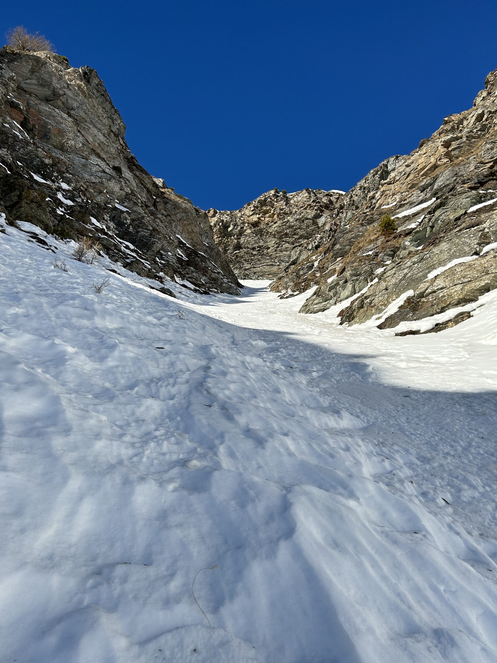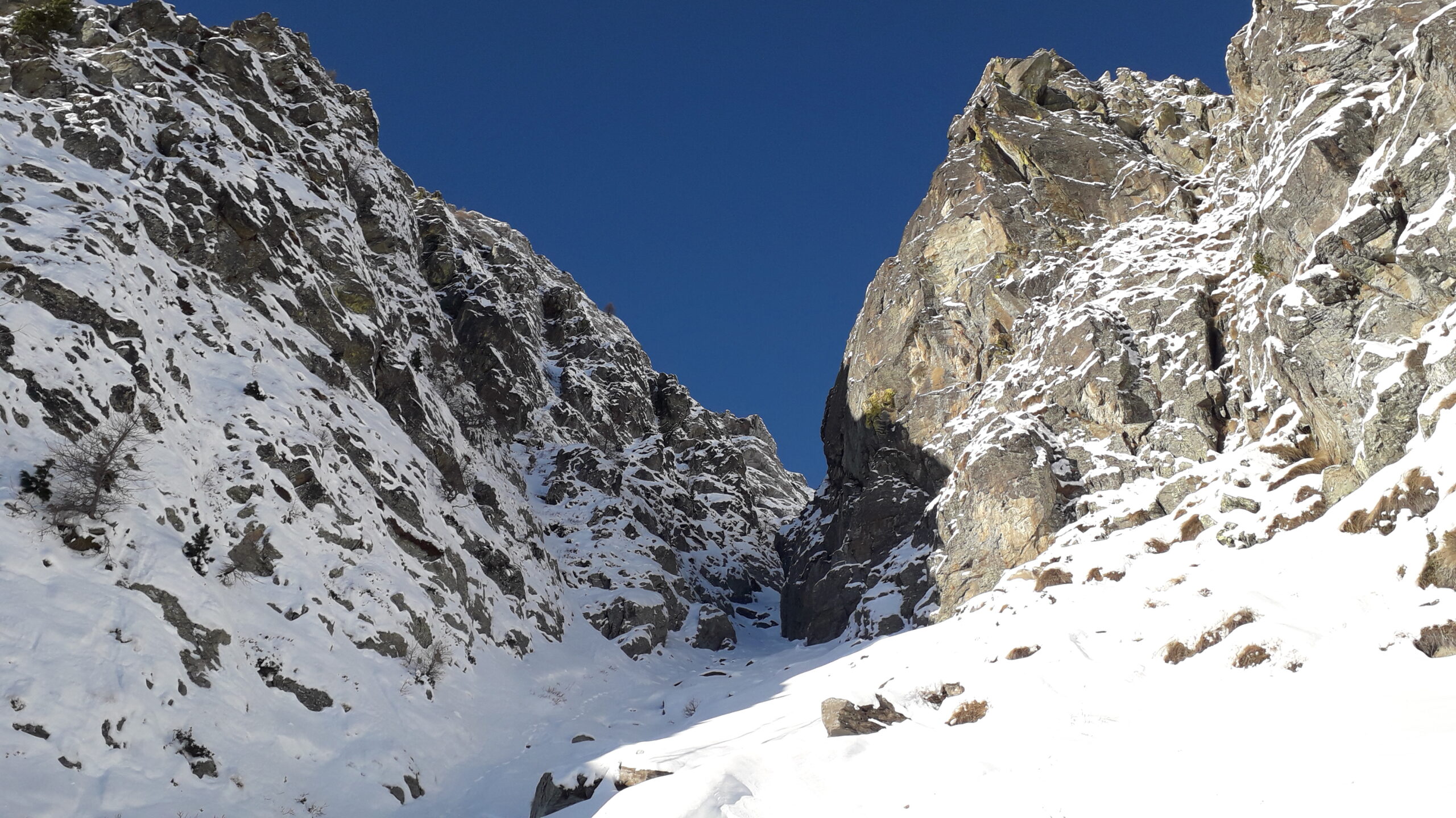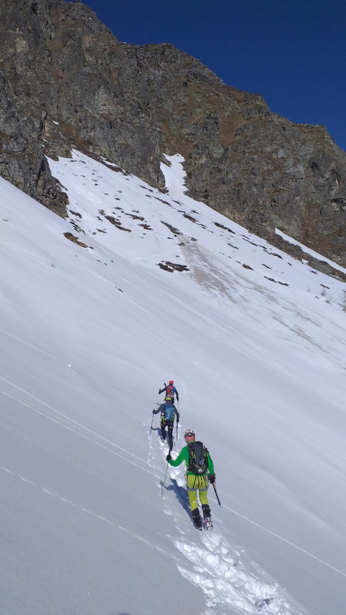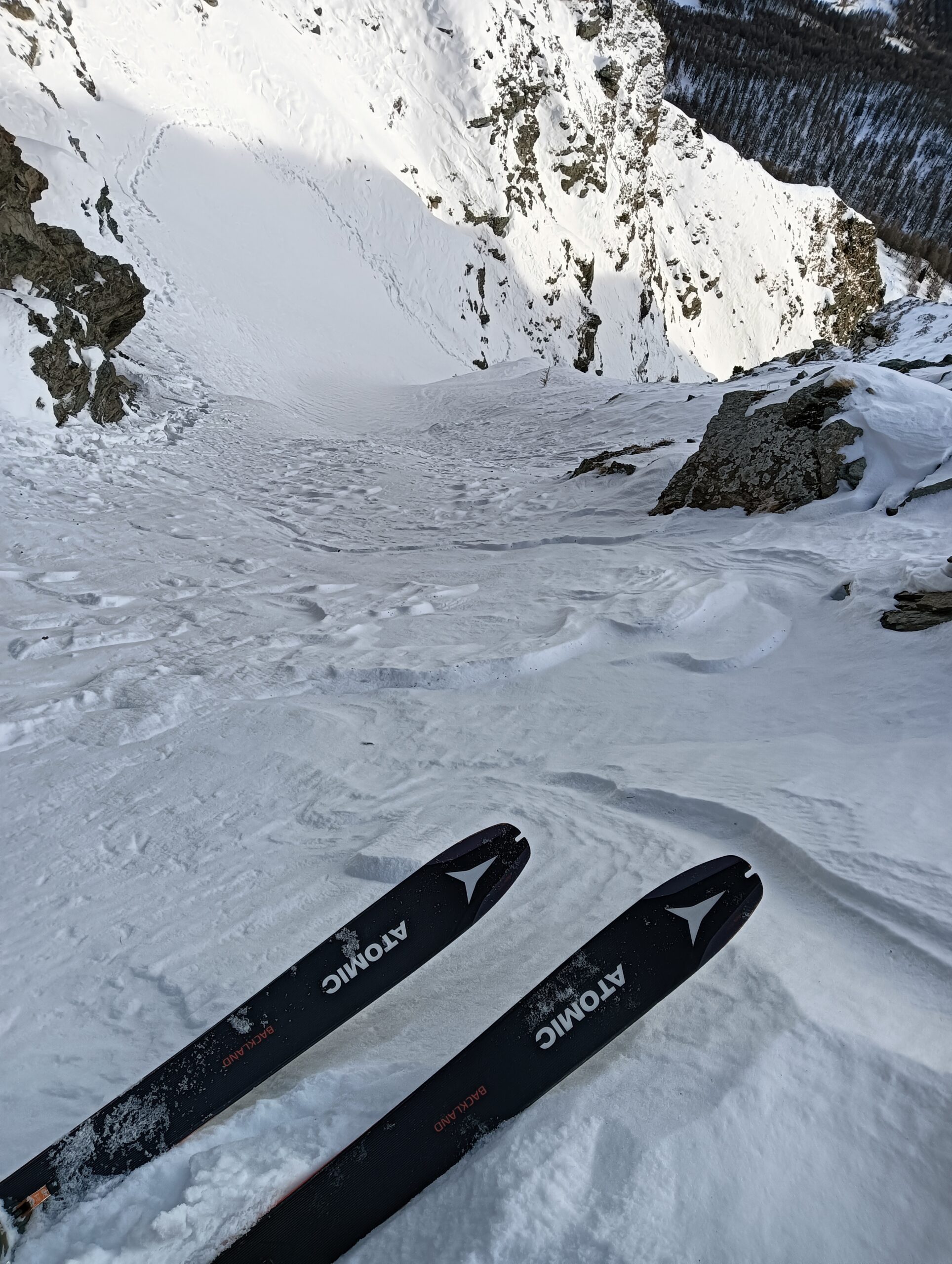 Seguire il canale dritto e incassato tra pareti rocciose (40°-45°). In alto la strada sembra sbarrata da un muro strapiombante, ma il canale lo aggira a sinistra e conduce sulla cresta spartiacque. Di nuovo verso sinistra raggiungere il Col Sud del Mont Méabé per ripido pendio con roccette affioranti. Continuare in cresta facilmente (cornici a E) fino all’anticima con croce del Mont Méabé. Da lì scendere al punto di partenza per sentiero escursionistico. A differenza del canale, il sentiero di solito è presto libero dalla neve in primavera.