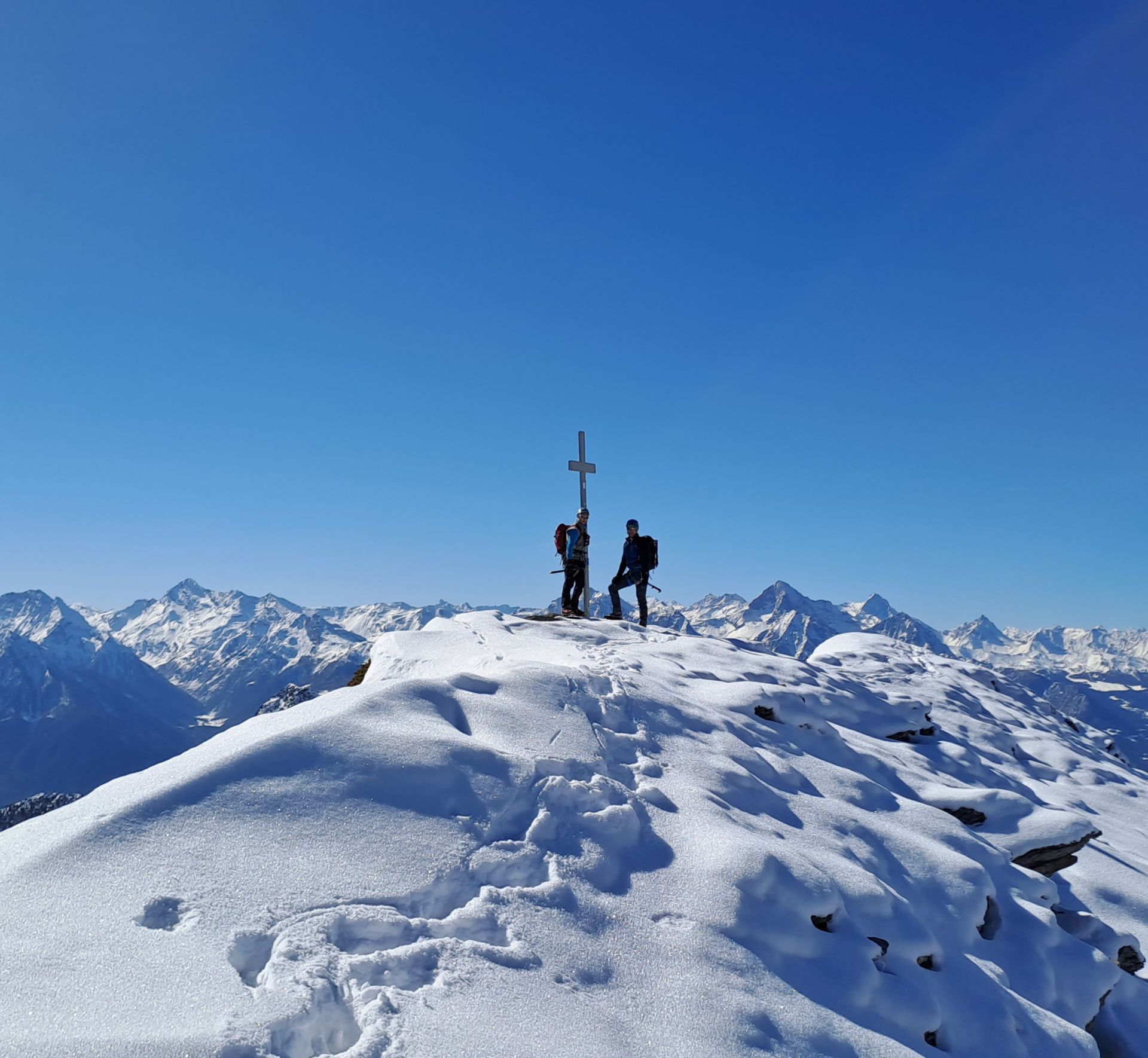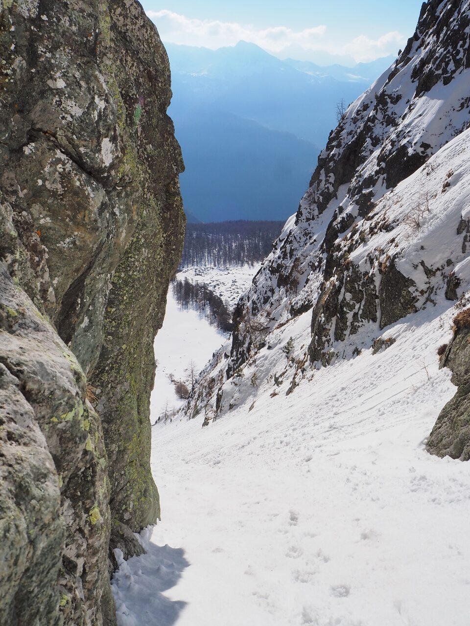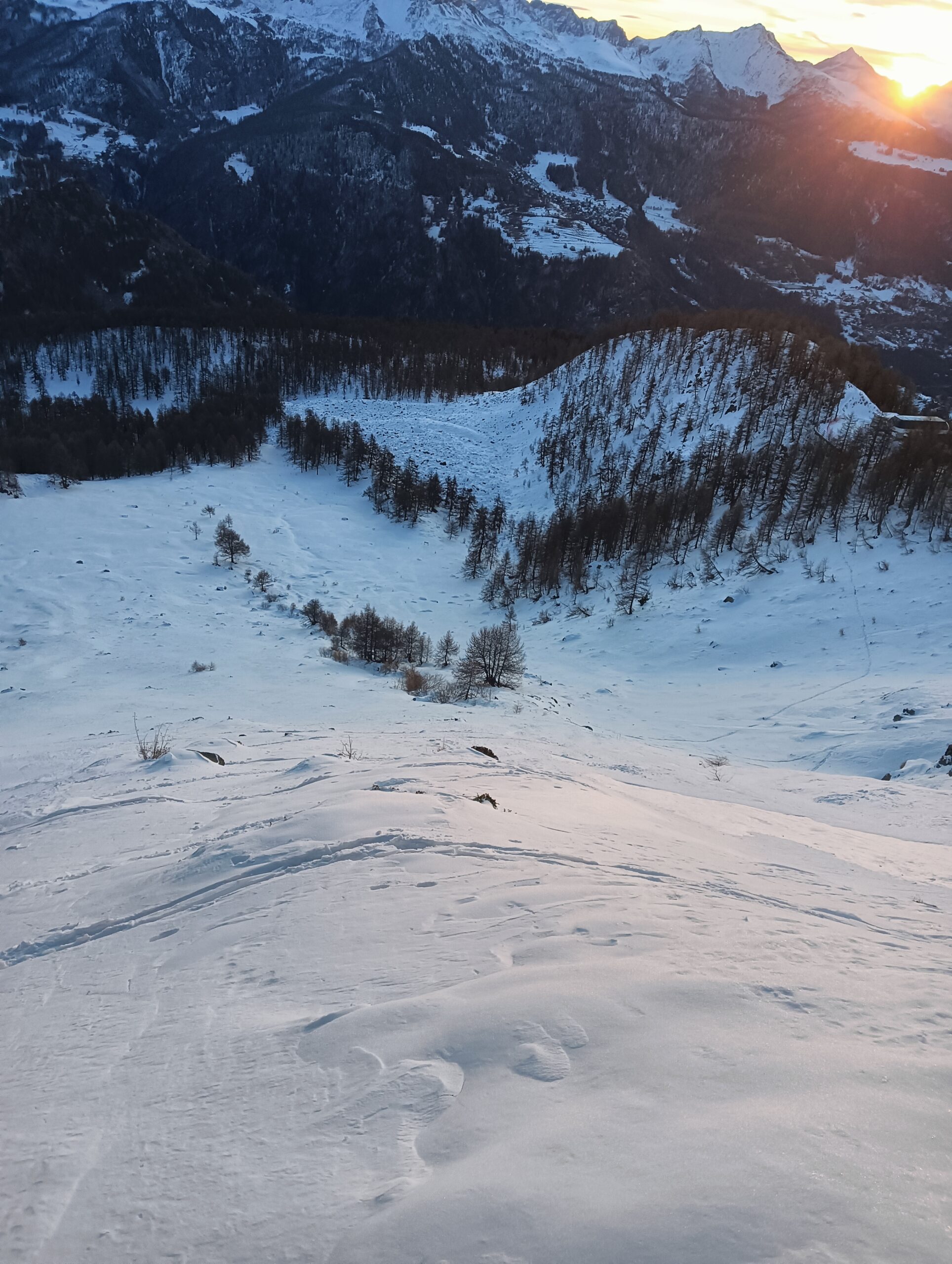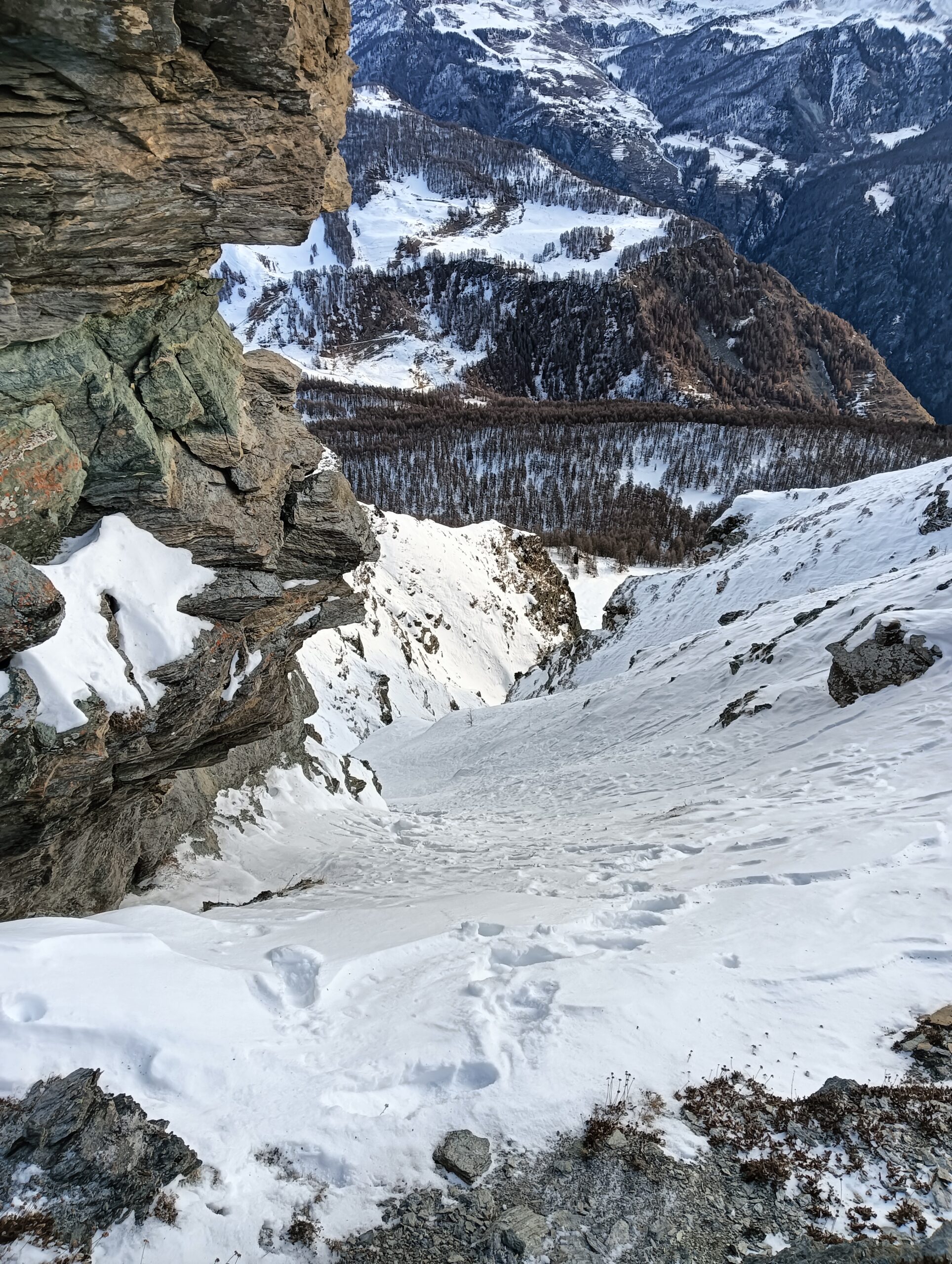 Seguire il canale dritto e incassato tra pareti rocciose (40°-45°). In alto la strada sembra sbarrata da un muro strapiombante, ma il canale lo aggira a sinistra e conduce sulla cresta spartiacque. Di nuovo verso sinistra raggiungere il Col Sud del Mont Méabé per ripido pendio con roccette affioranti. Continuare in cresta facilmente (cornici a E) fino all’anticima con croce del Mont Méabé. Da lì scendere al punto di partenza per sentiero escursionistico. A differenza del canale, il sentiero di solito è presto libero dalla neve in primavera.