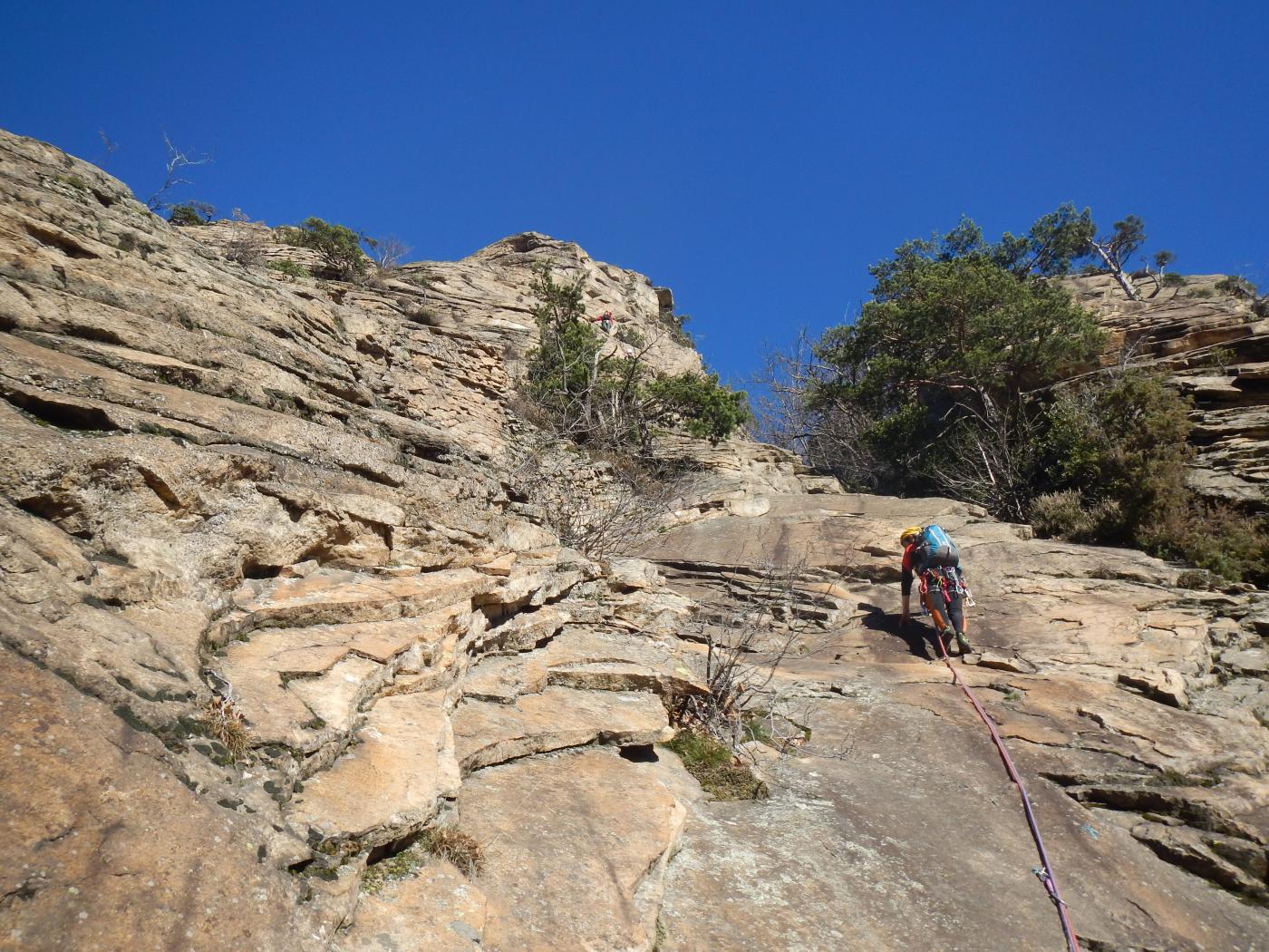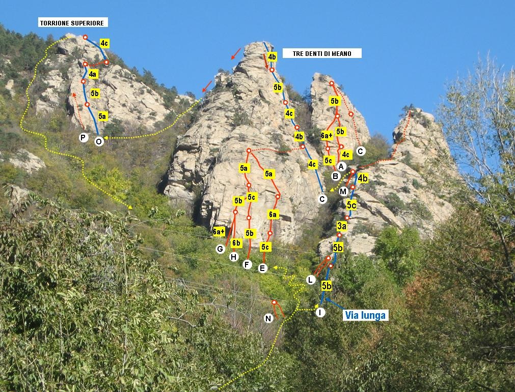 Salire i primi 5 tiri dello spigolo Sud – Ovest del Dente Orientale, scendere in doppia (25 m) su MILLENIUM BUG e proseguire sulla via MICHELIN – BATTU’ al Dente Occidentale.