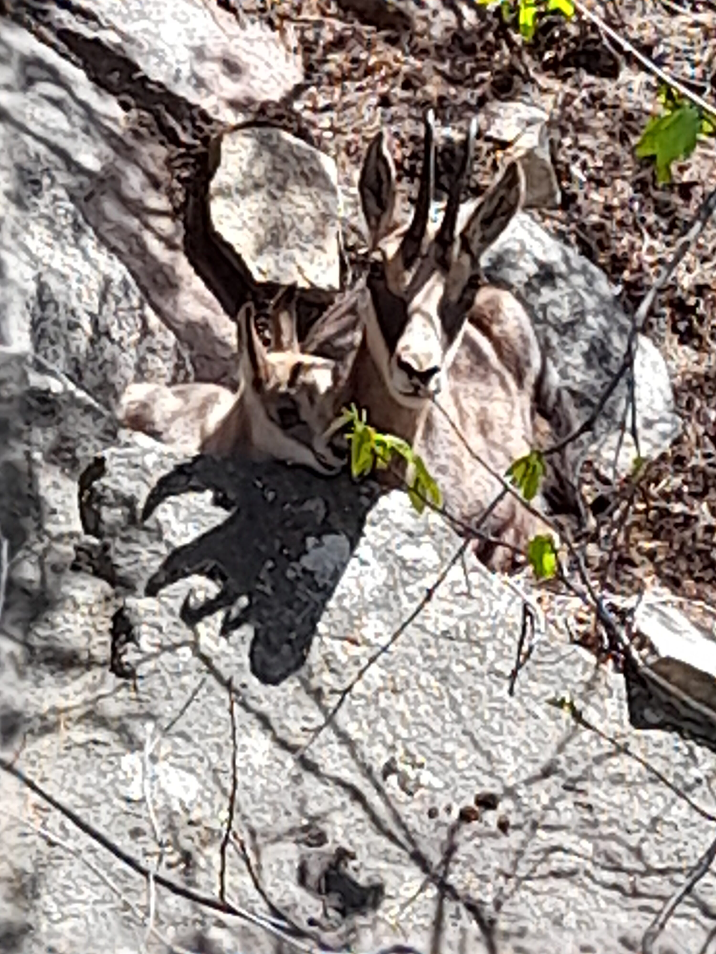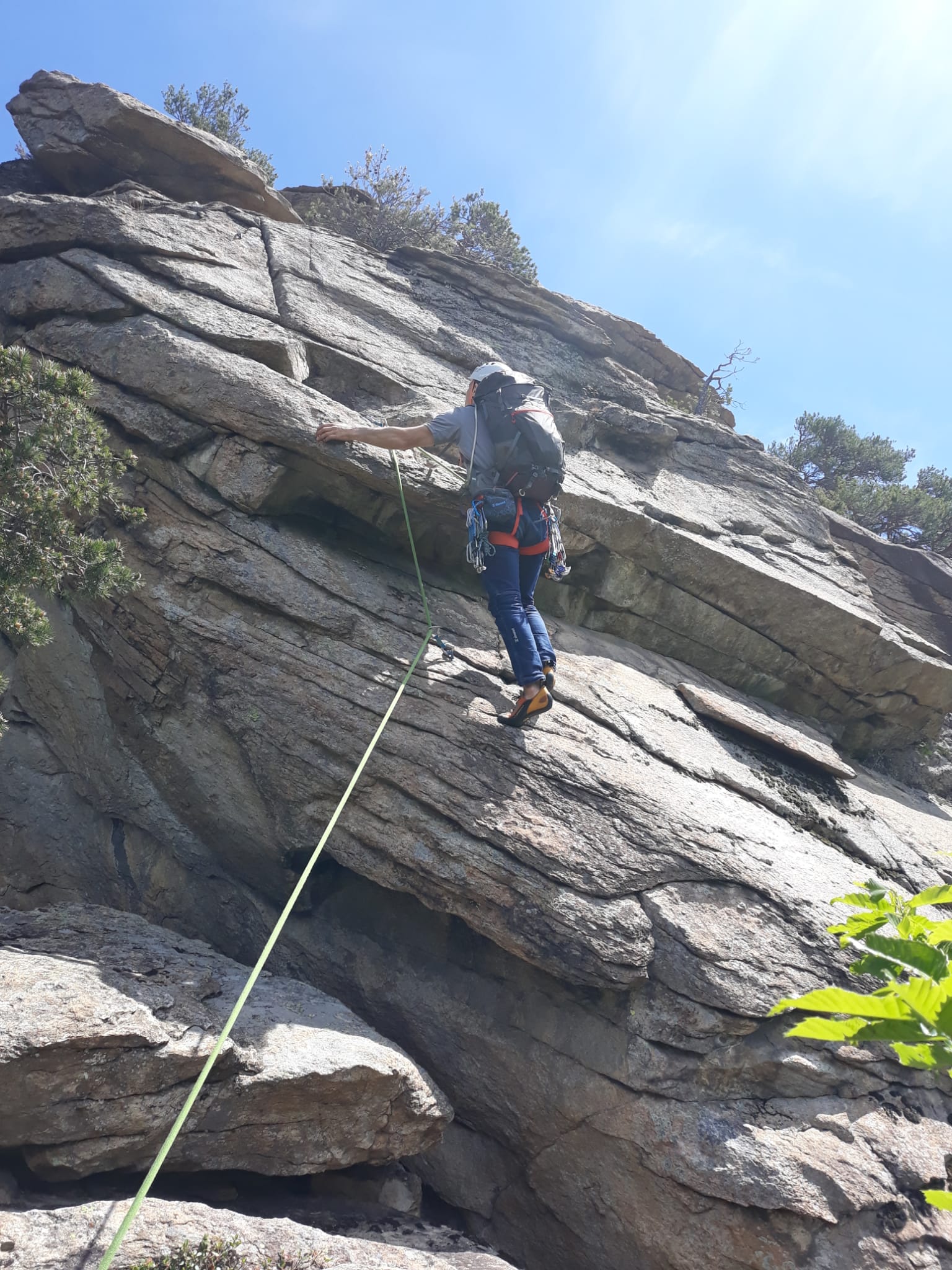 Bella via dal sapore alpinistico, i gradi rispecchiano fedelmente la gradatura come da relazione Gulliver. La spittatura lunga ma ben posizionata consente (solo se lo si vuole) di far pratica con friends, nuts e fettucce senza correre particolari rischi. Data l’esposizione a sud della via il periodo è al limite per non soffrire troppo caldo. Oggi piacevole fuori programma con l’incontro di mamma camoscio e il suo cucciolo, fortunatamente non li abbiamo disturbati.