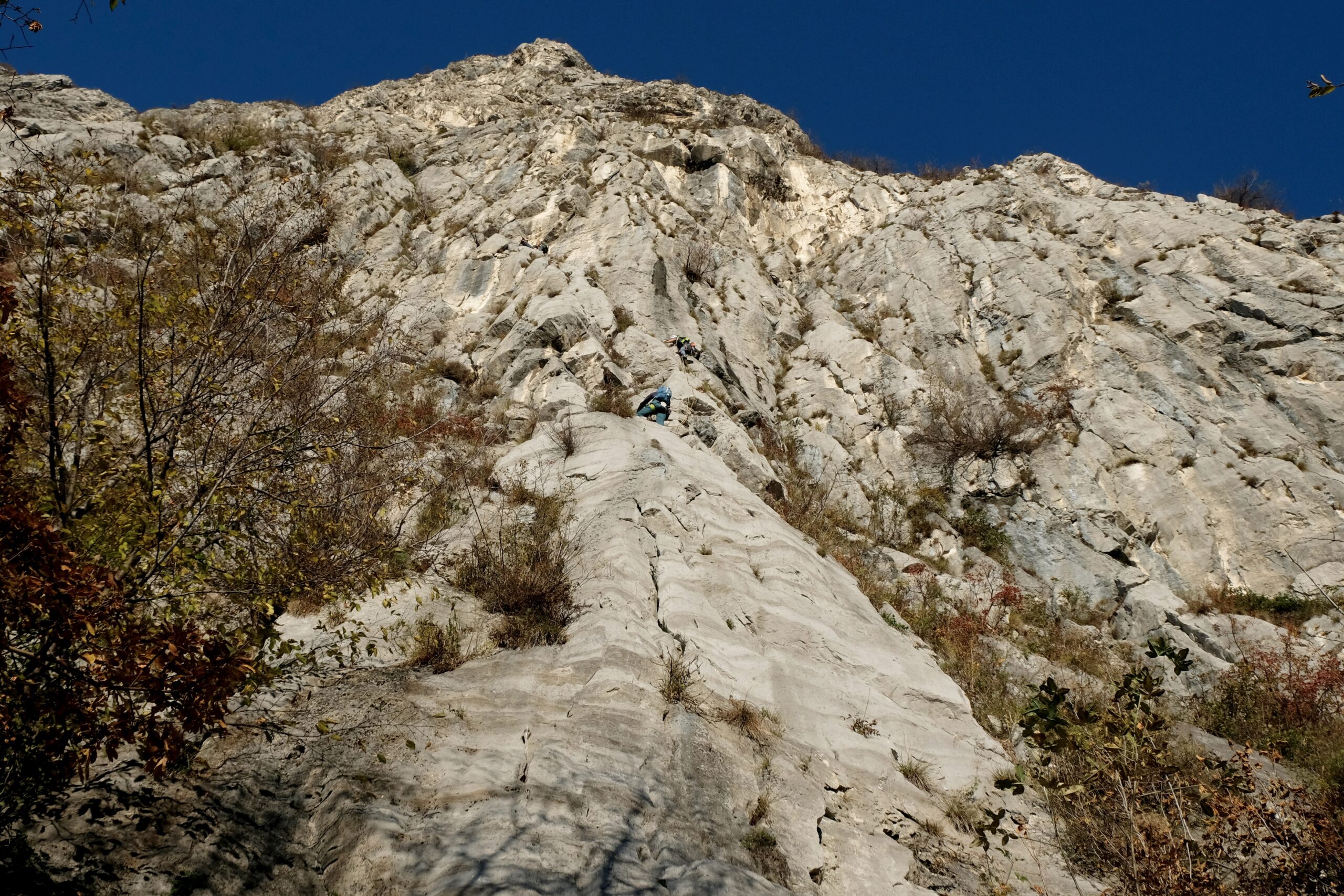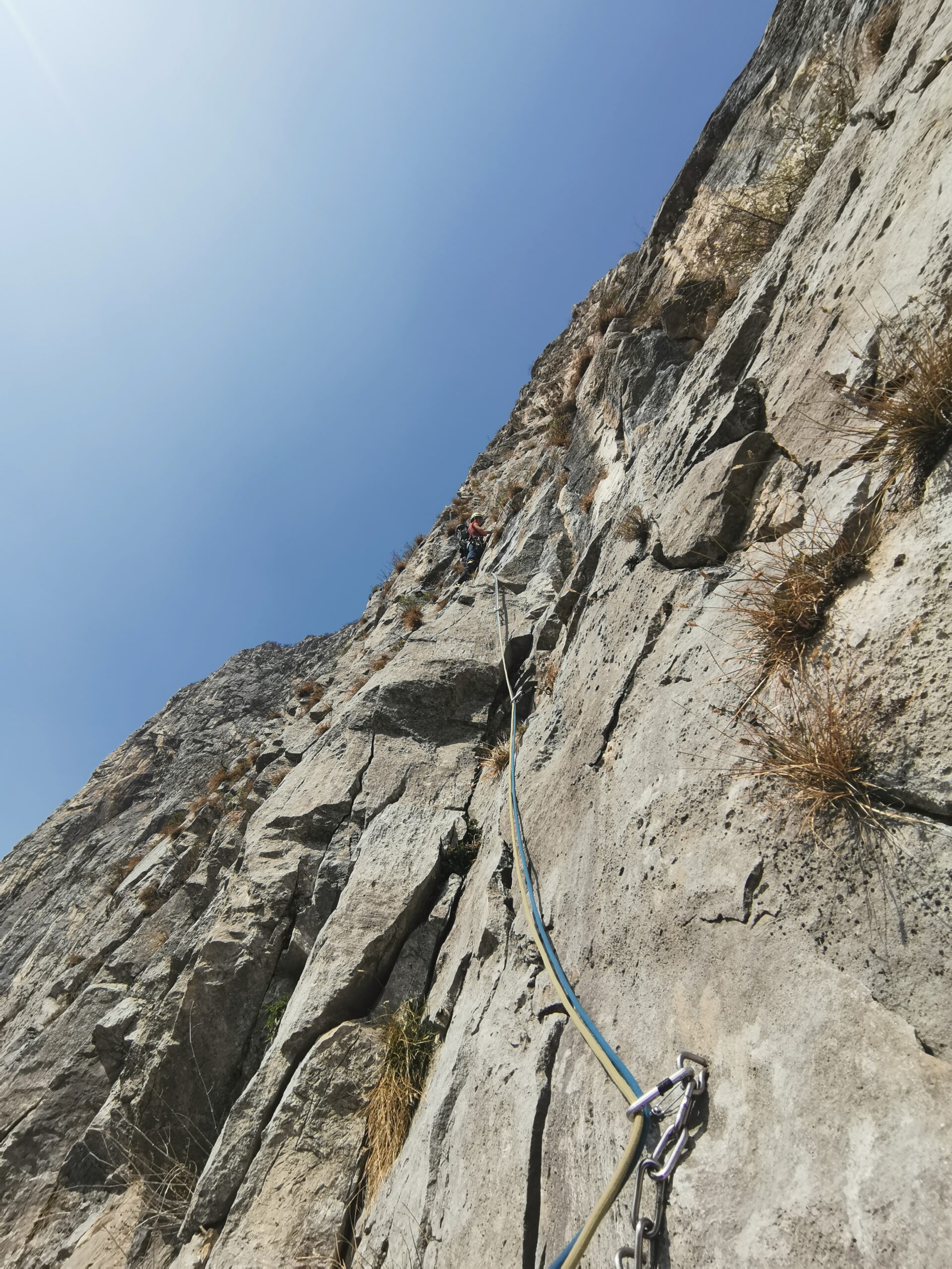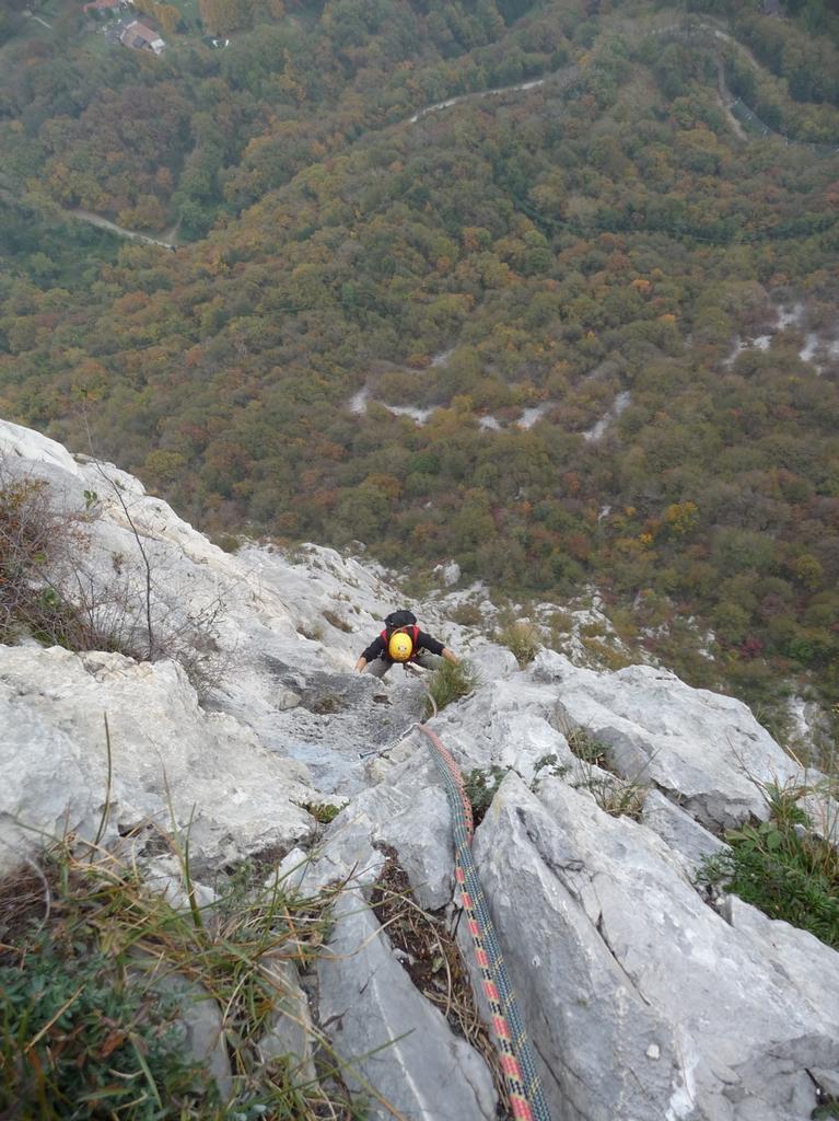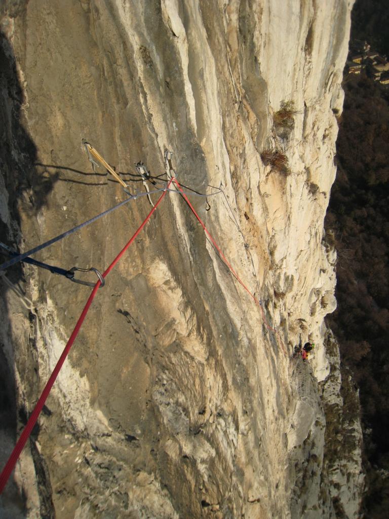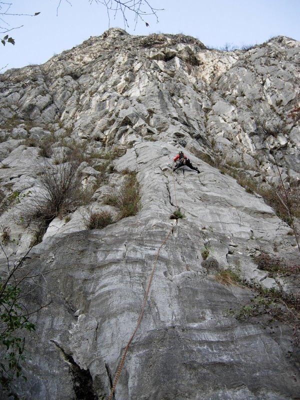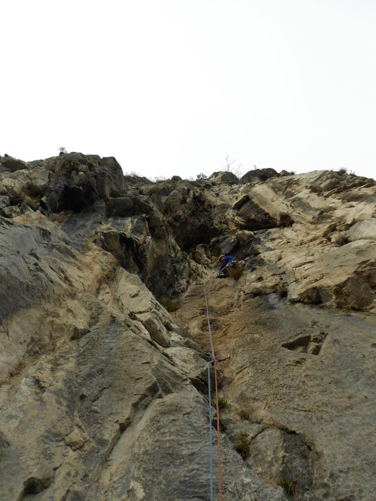 - L3: salire nel diedrino sopra lo spuntone e superare un primo strapiombino (più facile se preso sul lato sinistro) e subito dopo un altro strapiombino; proseguire poi verso sinistra fino ad incontrare 2 chiodi vecchi che indicano di attraversare una placca esposta. Terminato il traverso salire qualche metro fino alla sosta. 6a