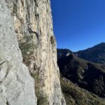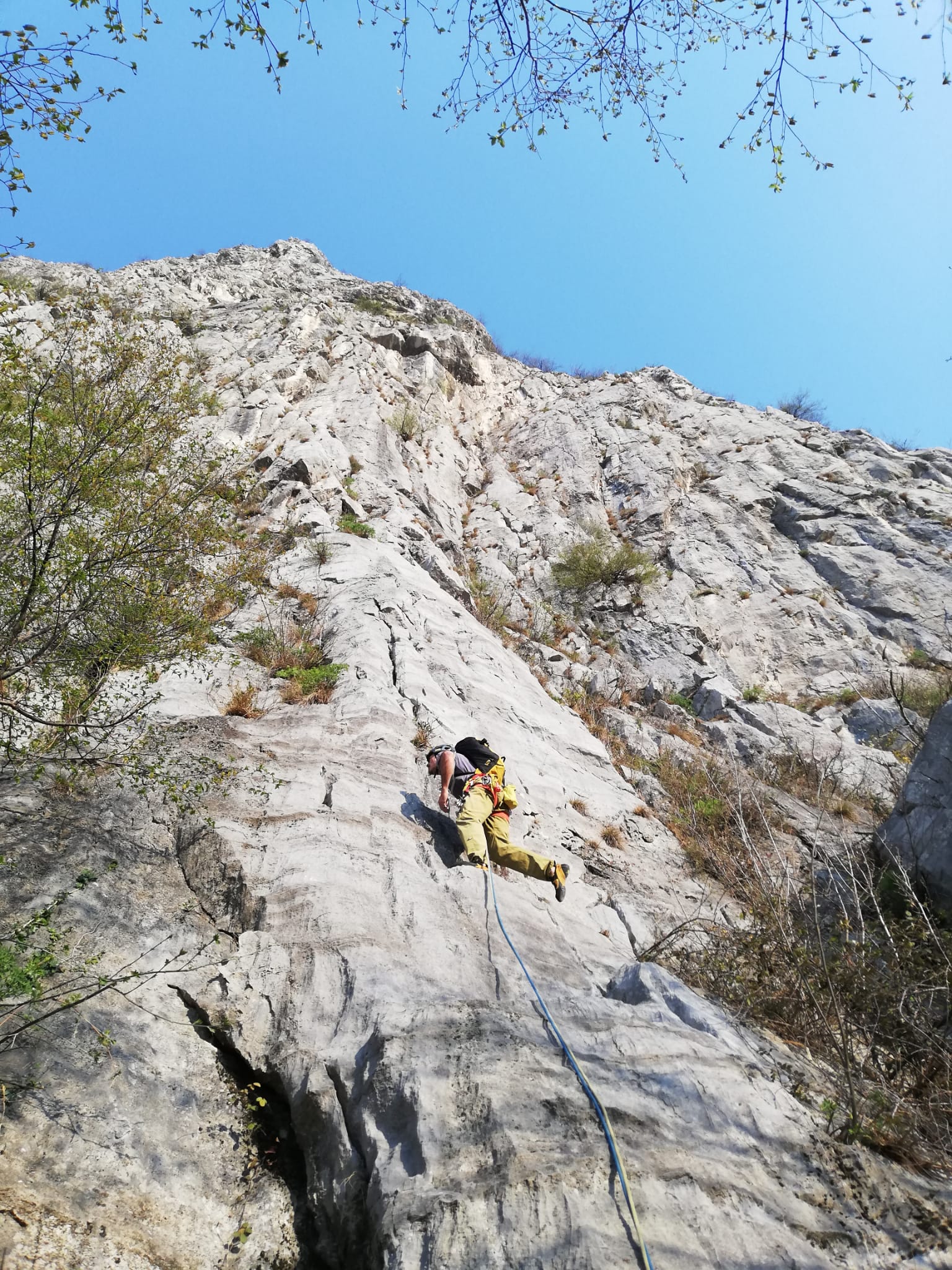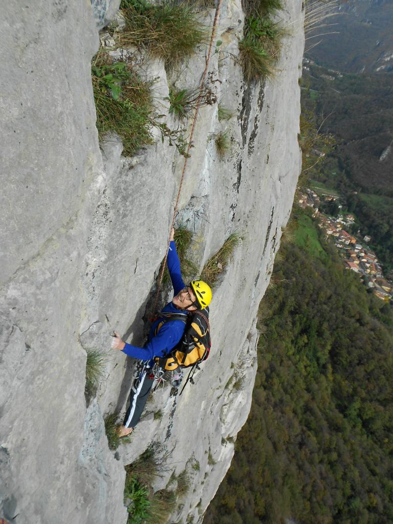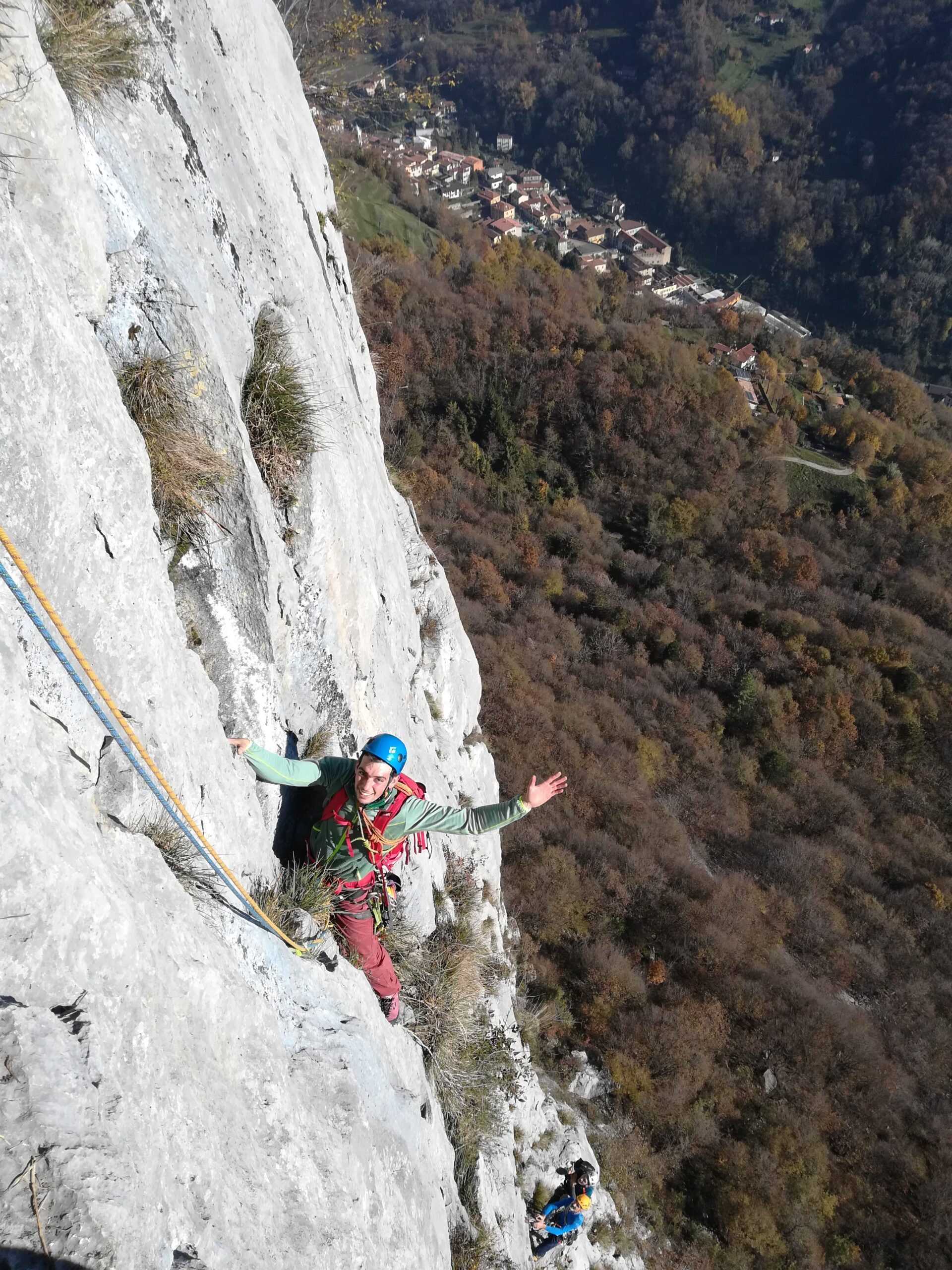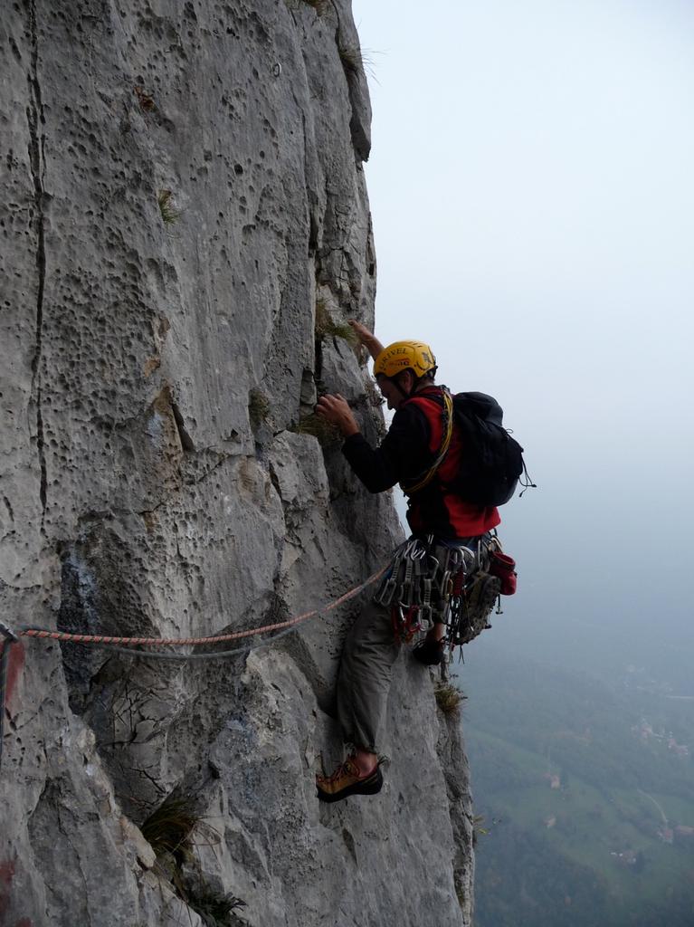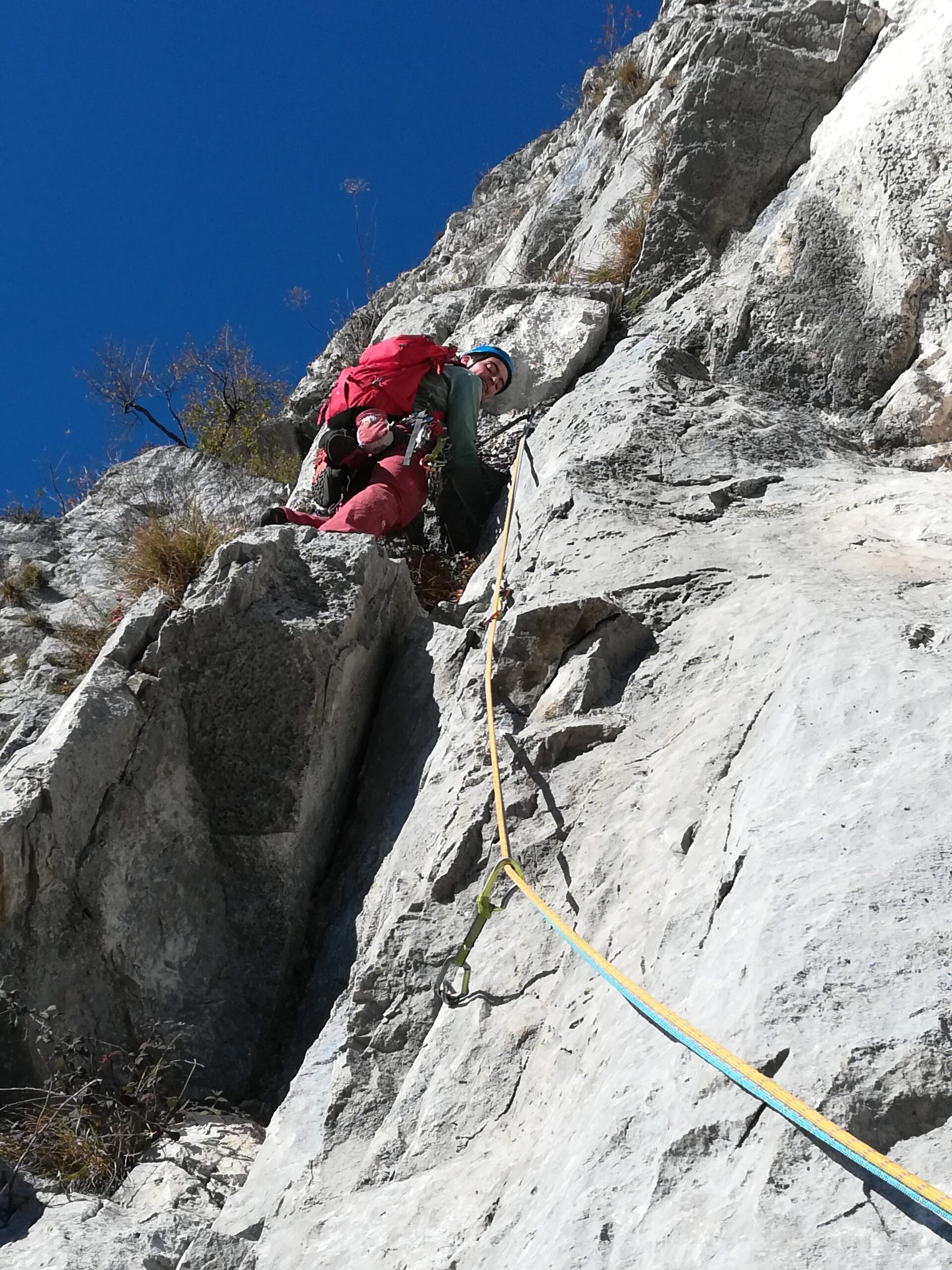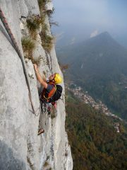 - L9: tiro lungo su roccia un po’ instabile. Salire dritto per l’ostico diedrino e uscire verso sx. Quindi salire in verticale un pilastro di una ventina di metri, raggiungere un chiodo con testa grossa in un muretto, aggirare questo muro a dx e risalire il diedro ascendente da dx a sx fino al suo termine. Arrivare ad un bel terrazzino dove si sosta comodamente. 5b