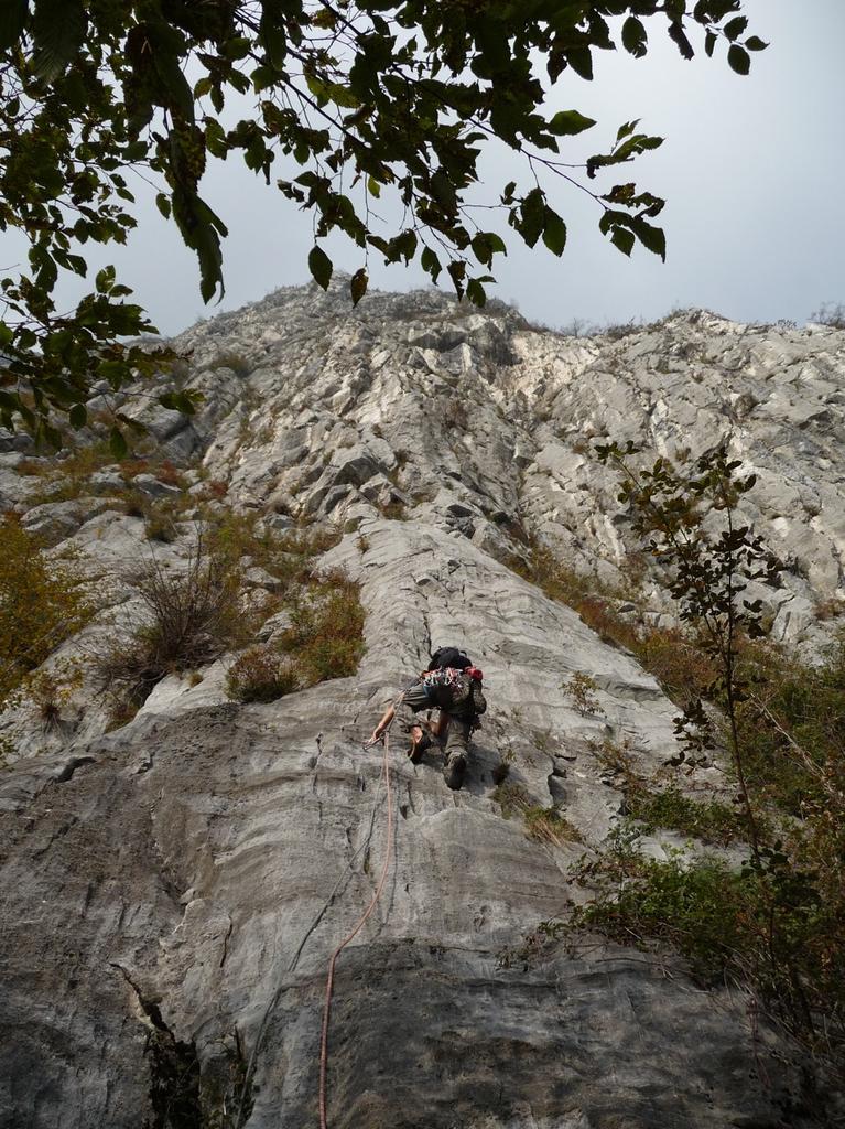 - L11: diedrino svasato a dx e proseguire poi, più facilmente, sulla cresta fino al sentiero di discesa. Sosta su albero 5a