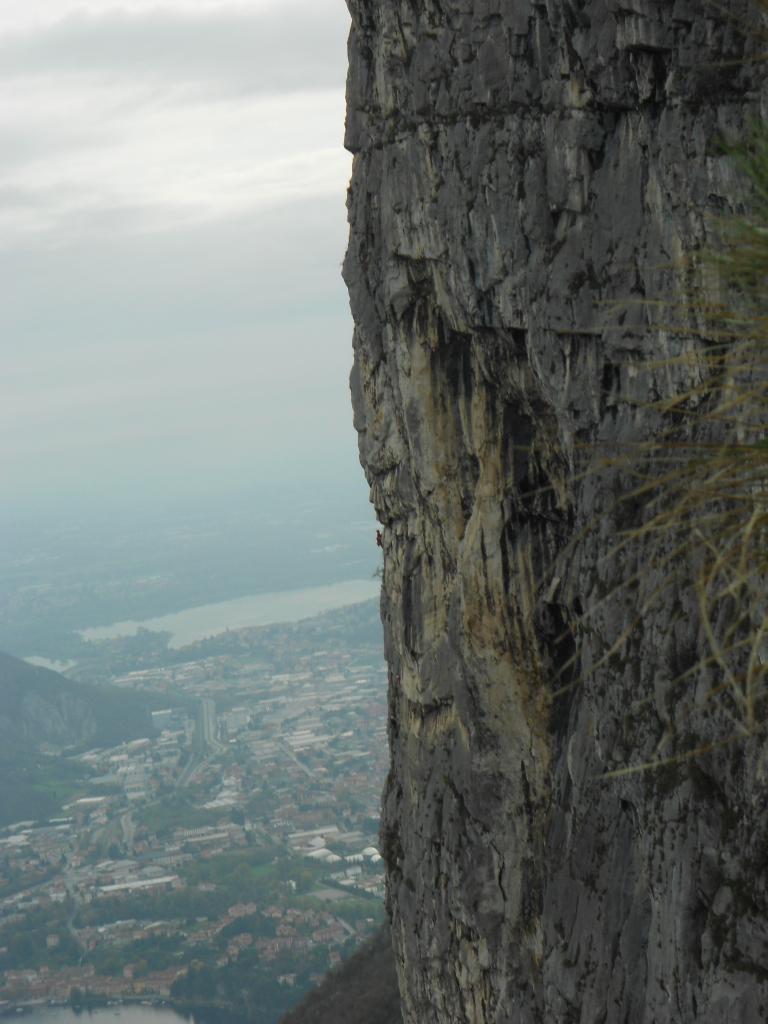 - L5: dalla sosta sotto lo strapiombo salire a sinistra (a destra parte la via Saronno 87), poi verticalmente per terreno più semplice fino alla base di una placca. Salirla (chiodo) e piegare un poco a destra per terreno più semplice. Riprendere ora verticalmente, leggermente a sinistra, e salire una specie di diedro che si segue per alcuni metri fino a che non si chiude (2 chiodi). Moschettonare a sinistra un picchetto e traversare a sinistra su placca liscia (azzerabile) fino alla sosta. Oppure, dal picchetto, traversare a sinistra in leggera discesa e risalire poi alla sosta. 5b