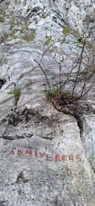 - L4: salire il diedrino alla destra della sosta (attenzione ai massi mobili), quindi attraversare a sinistra, su placca con lame (esposto) fino ad un terrazzino con sosta; questa è la sosta da dove parte la via Saronno ’87 a destra, mentre verso sinistra si prosegue sulla via dell’Anniversario. 6a