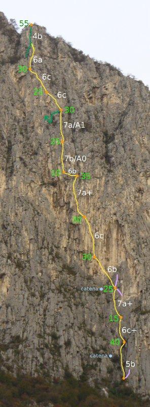 - L5 40m 5c (VARIANTE IN PLACCA): salire la bella placchetta sovrastante e quindi il muretto con fessura sopra la placchetta stessa (fittoni), quindi le difficoltà si abbassano e per facili rocce si prosegue dritti fino in sosta.
