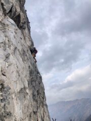 - L3 45m VII- oppure VI/A0: salire nel diedro strapiombante sopra la sosta e superarlo direttamente (strapiombino ammanigliato ma uscita delicata), poi per rocce più facili si arriva ad una sosta costituita da due fittoni non collegati (20m). Consiglio di proseguire per godersi pienamente il tiro. Dalla sosta salire dritti su rocce arrotondate e delicate, quindi entrare nel netto diedro con fessura. Salire il diedro fino ad una placca sotto ad uno strapiombino, che si supera sulla dx utilizzando la lama rovescia sul suo fondo. Dall’uscita salire poi per rocce facili alla sosta (2 fittoni non collegati). Veramente bello e faticoso.