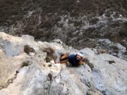 - L1 35m V: salire il diedro (fittone) per roccia unta e quindi giungere in cima al pilastro (2 fittoni nuovi di sosta non collegati).
