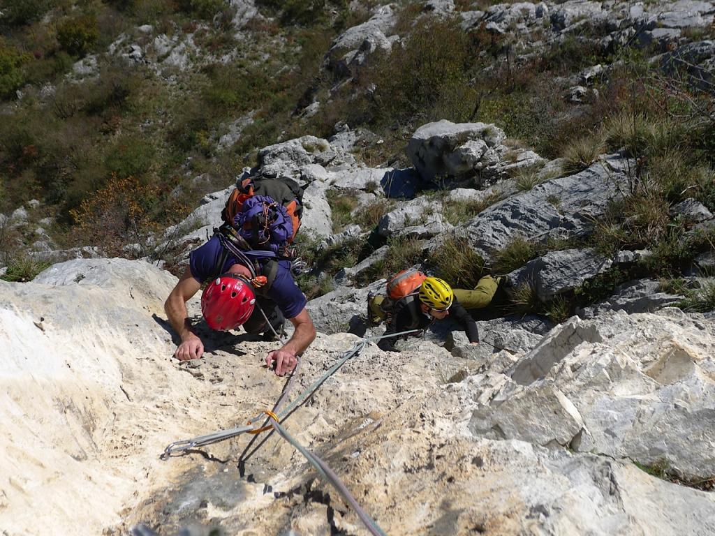 A destra, salendo l’evidente diedro fessura sprotetto (nessun chiodo, ma proteggibile a friend). Giunti in cima obliquare a destra sui resinati dell’ultima sosta della “Bonatti”.