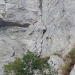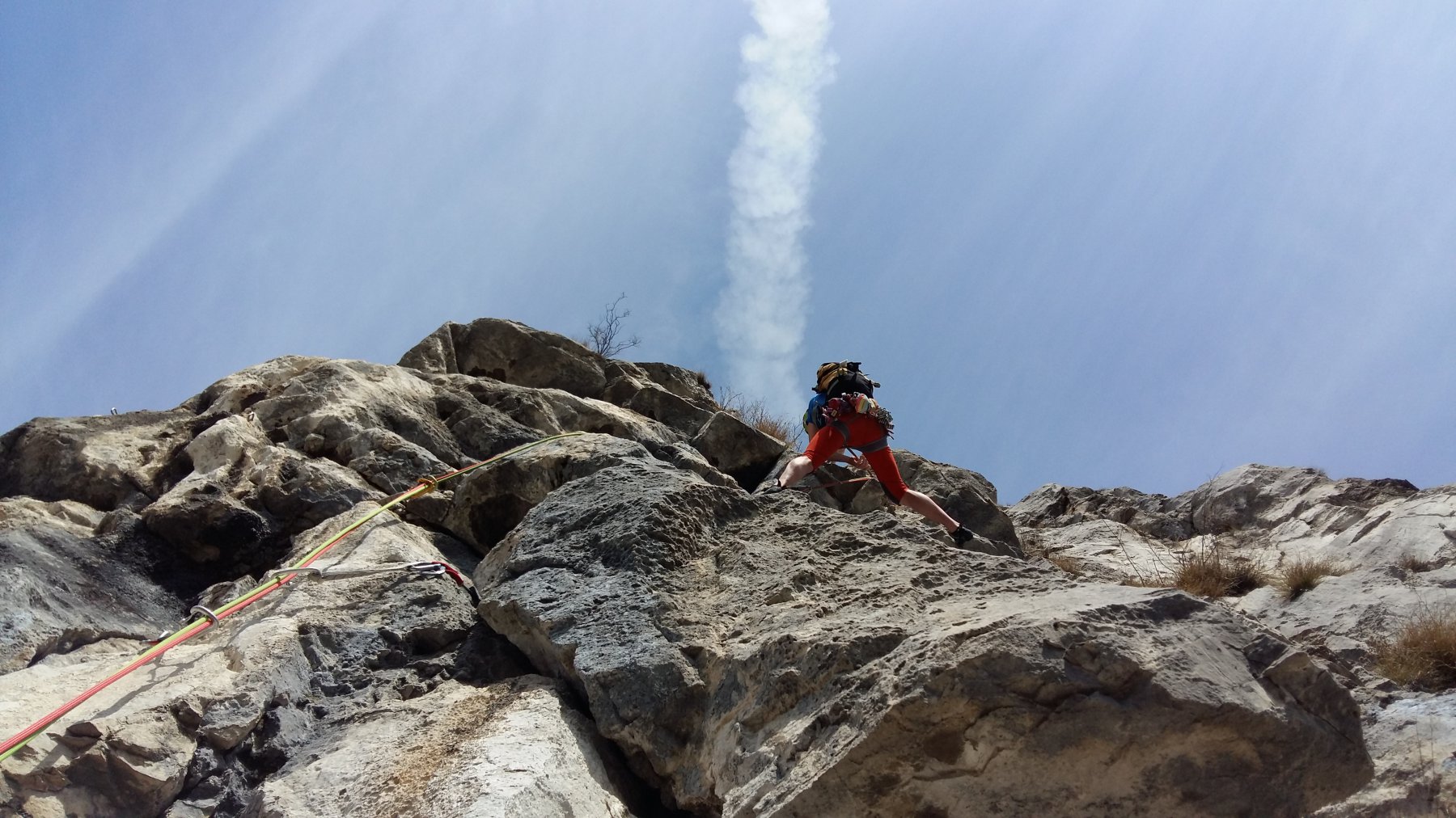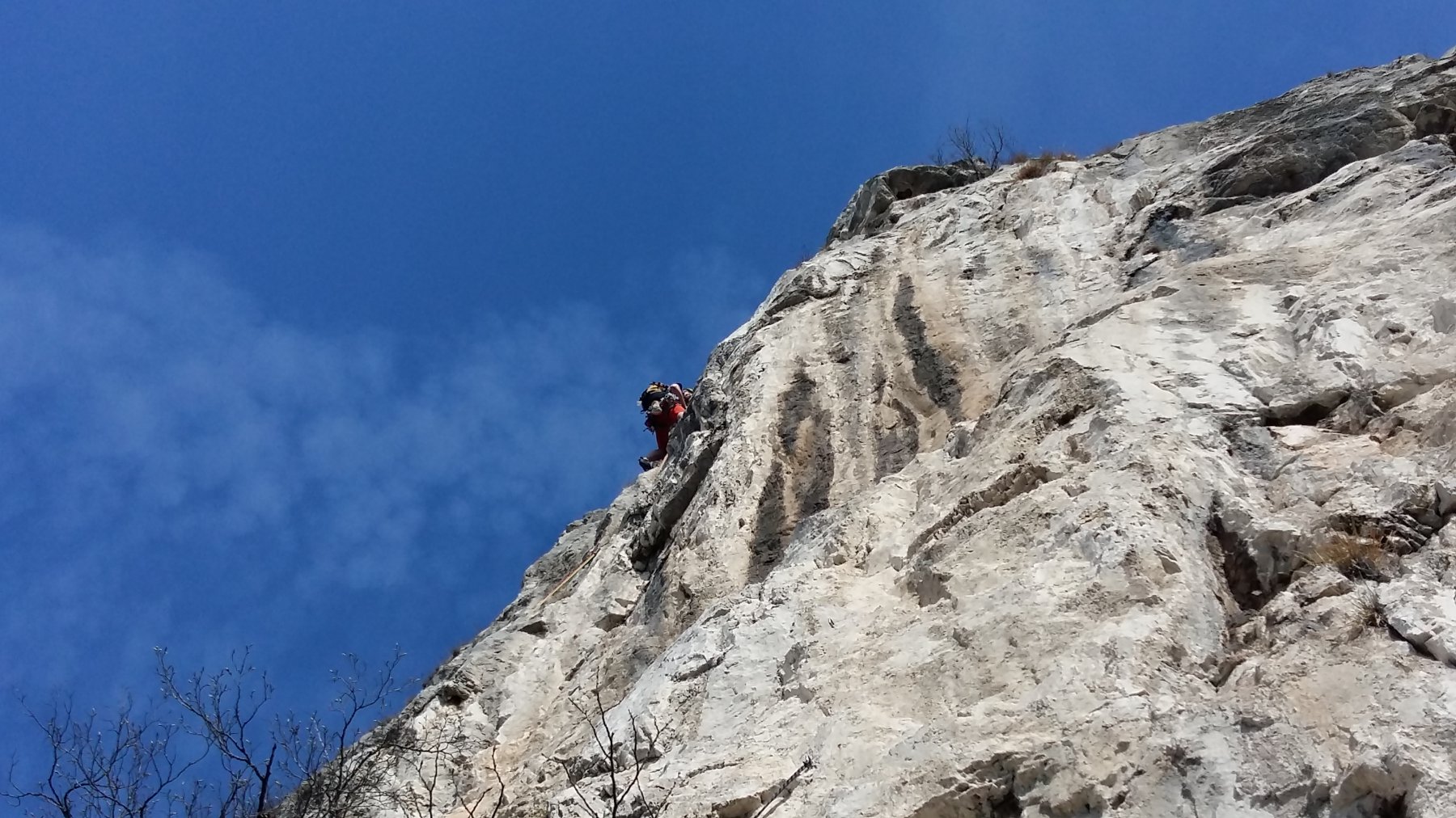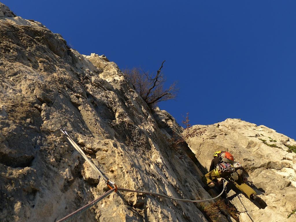 Qualche passo fin sotto il tetto, quindi traversare a sinistra e seguire i numerosi chiodi che consentono di risalire il pilastro cercando il percorso migliore (roccia piuttosto delicata con qualche blocco instabile). Dopo una trentina di metri superare un tratto aggettantre (2 chiodi), continuare per roccia rotta e poco oltre un piccolo arbusto (vecchio cordone), piegare a sinistra andando a sostare sui resinati de “Il Cammino dello Xian”. Allungare bene le protezioni per evitare fastidiosi attriti di corda. - L5 – V+, 30m