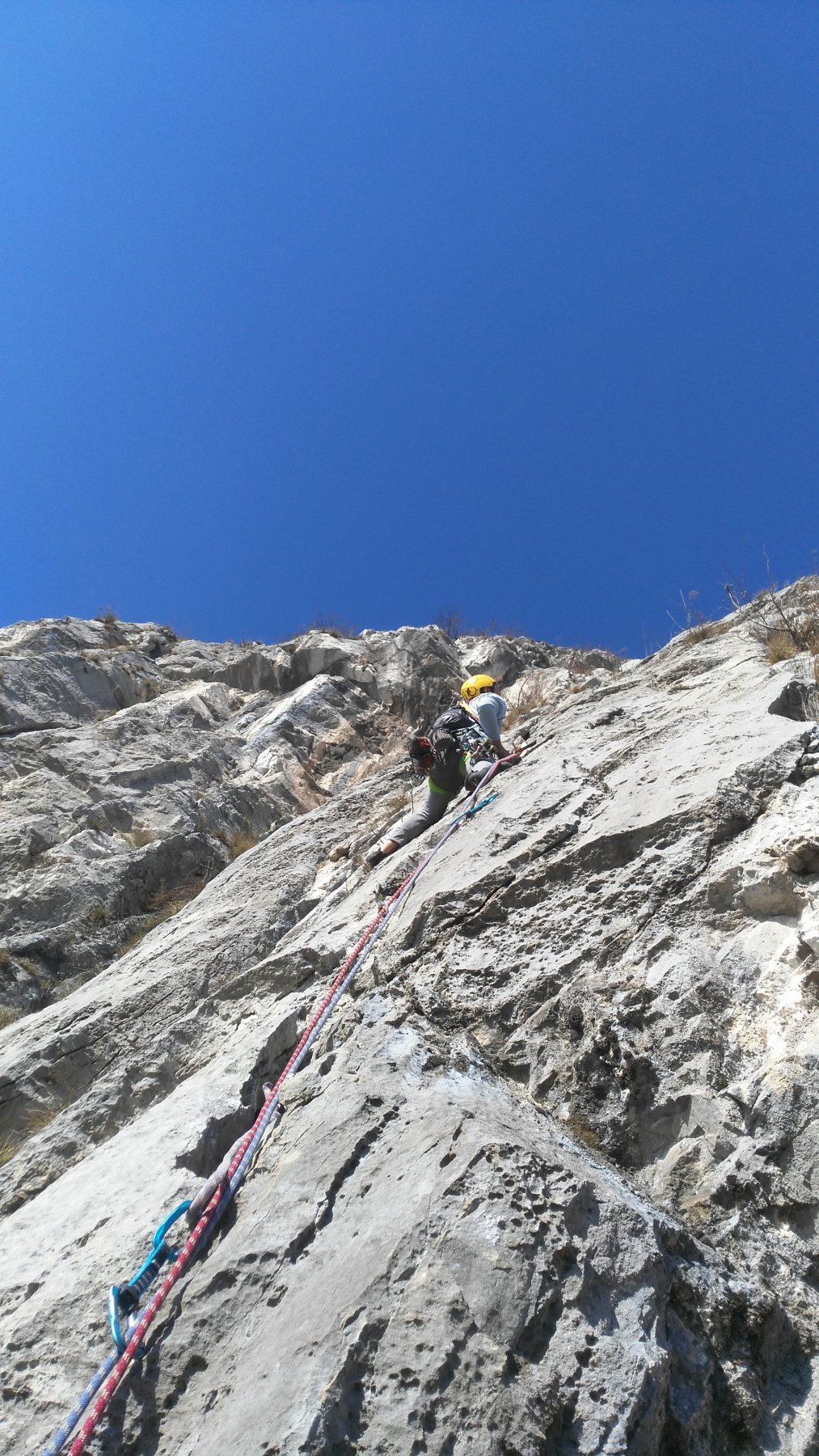 L2) Seguire chiodi, cordoni e fix per tutta la lunghezza, tiro bello e ben protetto, verticale ricco di fessurine e lamette, roccia un poco polverosa ed erbosa verso la fine. un passo di 6b+, il resto 6a+ continuo.35m