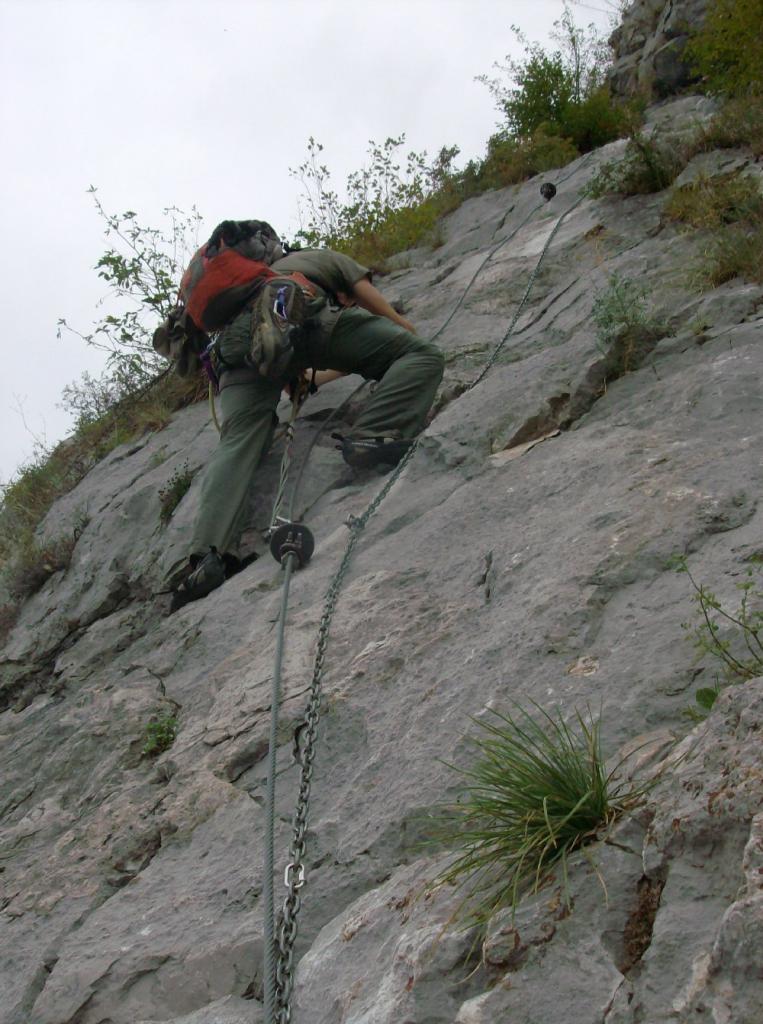 Osservando la parete dall’abitato di partenza sembra ti debba cadere addosso da un momento all’altro. Ferrata in buono stato a parte qualche trefolo sul cavo d’acciaio e vicino agli ancoraggi, qualche gradino piegato. Percorso godibile che invoglia il contatto con la roccia, ottimi appoggi e appigli, si trae massima soddisfazione usando il meno possibile la catena per la progressione. La prima parte che è la più verticale ed impegnativa, l’ho percorsa con le scarpette d’arrampicata. Sul percorso almeno una decina di persone meno allenate che ci hanno ceduto il passo. Molto caldo e ambiente secco senza fonti d’acqua. In compagnia di Andrea C. Proseguito poi verso il Corno Regismondo e gli altri rilievi e sentieri attrezzati della zona. Allenamento in vista di un percorso molto impegnativo da affrontare nelle prossime settimane. Ritengo D/D+ la prima parte, F/PD la seconda, per cui propongo D (invece di TD) come valutazione complessiva del percorso, come già fatto notare anche da chi mi ha preceduto.