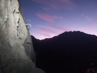 Giretto mattutino in ferrata. In questi giorni la parete prende il sole dalle 7.40 circa. Attrezzatura tutta in ordine. Discesa per il canale dell’Antimedale per fare prima, ma visto che ormai frana in continuazione non so poi quanto si risparmia effettivamente.