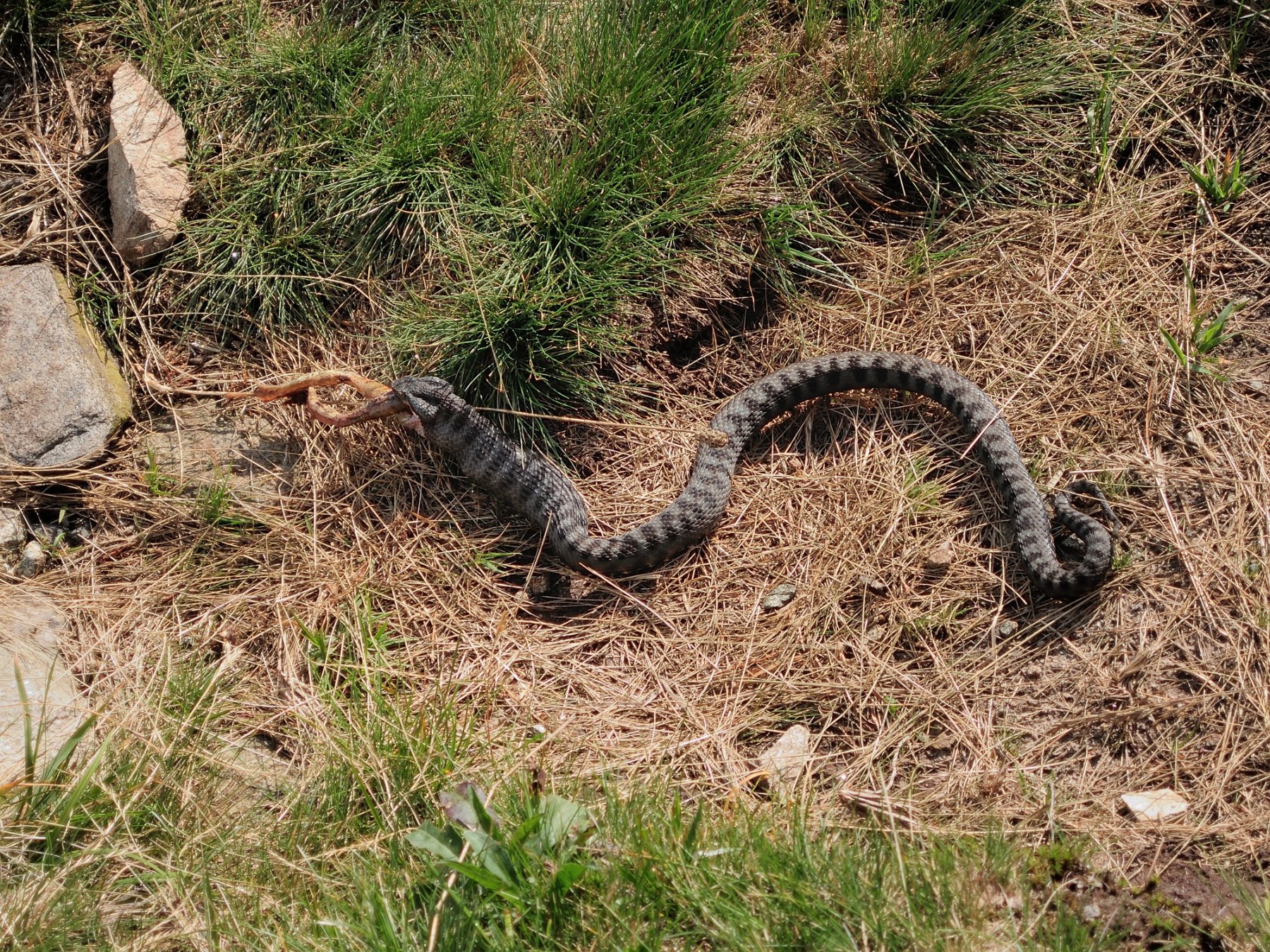 Anche oggi il meteo non è dei migliori. Nuvole sparse ovunque ma secondo le previsioni niente pioggia, per cui decidiamo di partire comunque. Percorso dell’andata: Passo di Fontanalba, Alpe Galeria, Alpe Soglio di Crana, Alpe Ragozzo, Passo dell’Omo, Bocchetta di Loccia Carneria e cima lungo la cresta Ovest o appoggiando sul pendio occidentale. Percorso evidente e segnalato fino all’Alpe Ragozzo e lungo la prima parte della salita verso il Passo dell’Omo, oltre il bivio per la Bocchetta del Ragozzo, quindi sentiero sempre meno rintracciabile man mano che si sale, comunque nessun problema di orientamento grazie a radi ometti e visibilità accettabile. In vetta nessuna traccia del noto panorama; solo qualche gioco di nuvole a dare spettacolo lungo le creste. Mancanza comunque abbondantemente ripagata dal piacere di compiere un’escursione, seppure lunga e faticosa, in un ambiente incomparabile. L’alta Valle Onsernone, preservata dalla lontananza dei centri abitati e dall’assenza di comode vie d’accesso, offre una natura veramente incontaminata dove sopravvive una residua alpicoltura portata avanti per pura passione secondo metodi e mezzi d’altri tempi. Al ritorno, medesimo percorso fino all’ Alpe Soglio di Crana, da cui salendo per i prati malridotti dai cinghiali raggiungiamo l’Alpe Soglio di Druogno (Alpe Piana sulle carte) dove facciamo scorta di formaggio. Risaliamo quindi al Lago Panelatte da cui facciamo ritorno ad Arvogno. Anche stavolta, oltre a noi cinque e agli alpigiani, solo camosci e vipere, una delle quali sorpresa durante la colazione consistente in una rana temporaria.