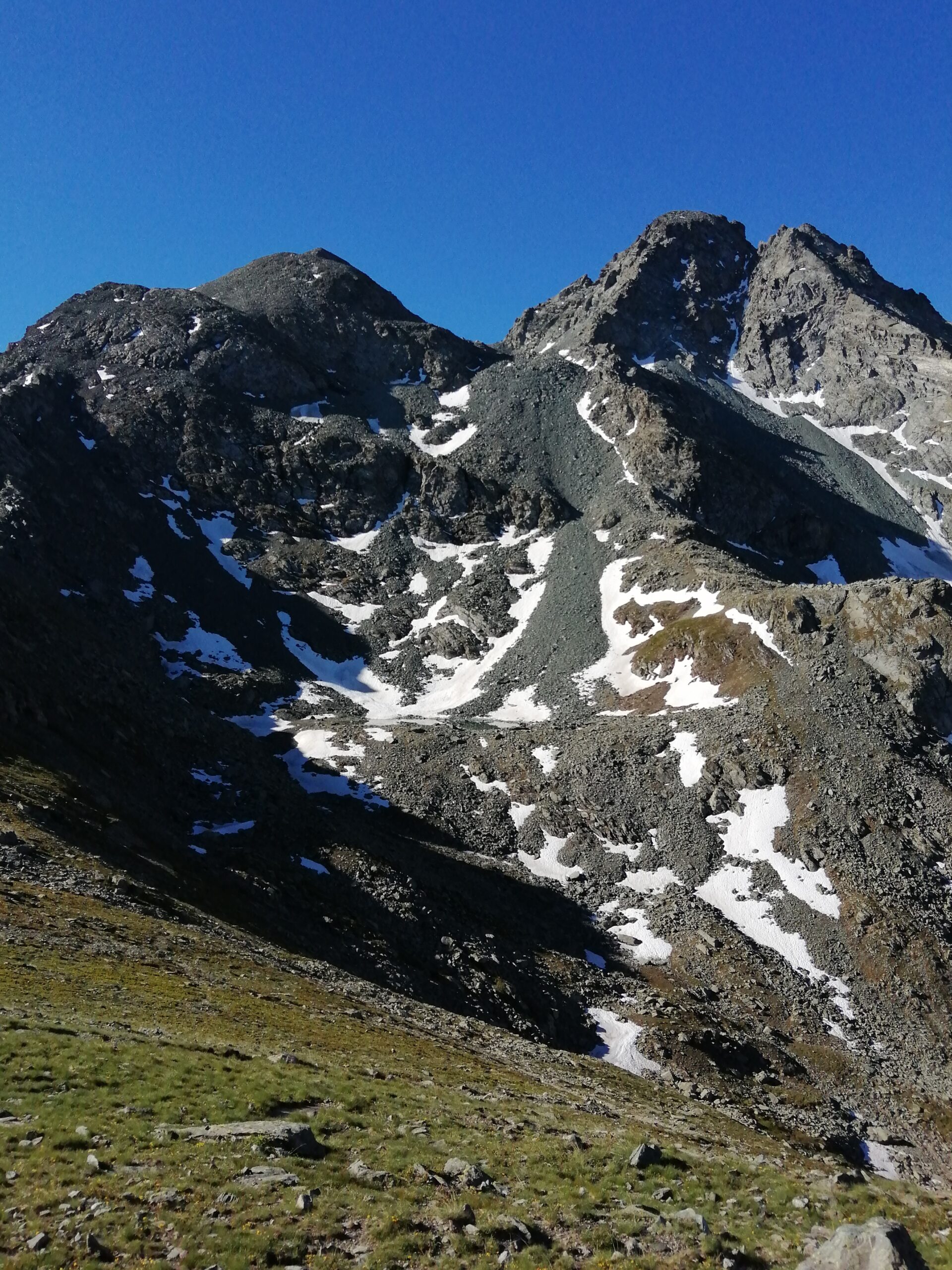 Giunti al colle, si segue la traccia che scende verso il Lago Nero e il rifugio Granero, perdendo circa 115m, per congiungersi al sentiero marcato a tacche e ometti che risale verso il lago Gelato, alla base della pietraia del canalone che sale al passo Luisàs. Di qui sono presenti tacche che indicano il percorso su pietraia, non molto evidenti in particolare se sono presenti nevai residui. Si risale faticosamente la scomoda pietraia, in alcuni punti in ghiaietto molto scivoloso, le pietre accanto muovono quasi tutte facendo attenzione a non smuovere, per arrivare al Passo Luisàs tra il monte Granero e la Meidassa, quota 3019m. Di qui si guadagna rapidamente la cima della Meidassa 3105m per comode tracce che risalgono il versante molto appoggiato.