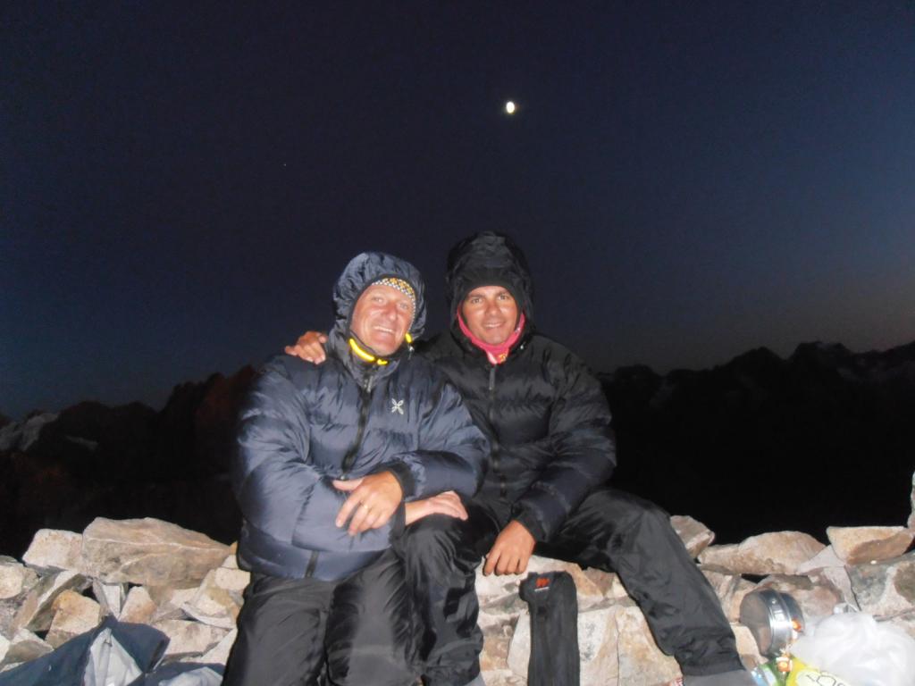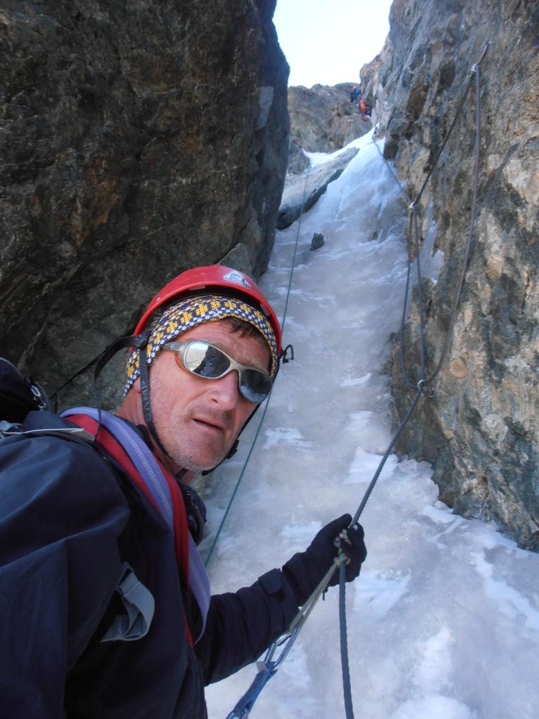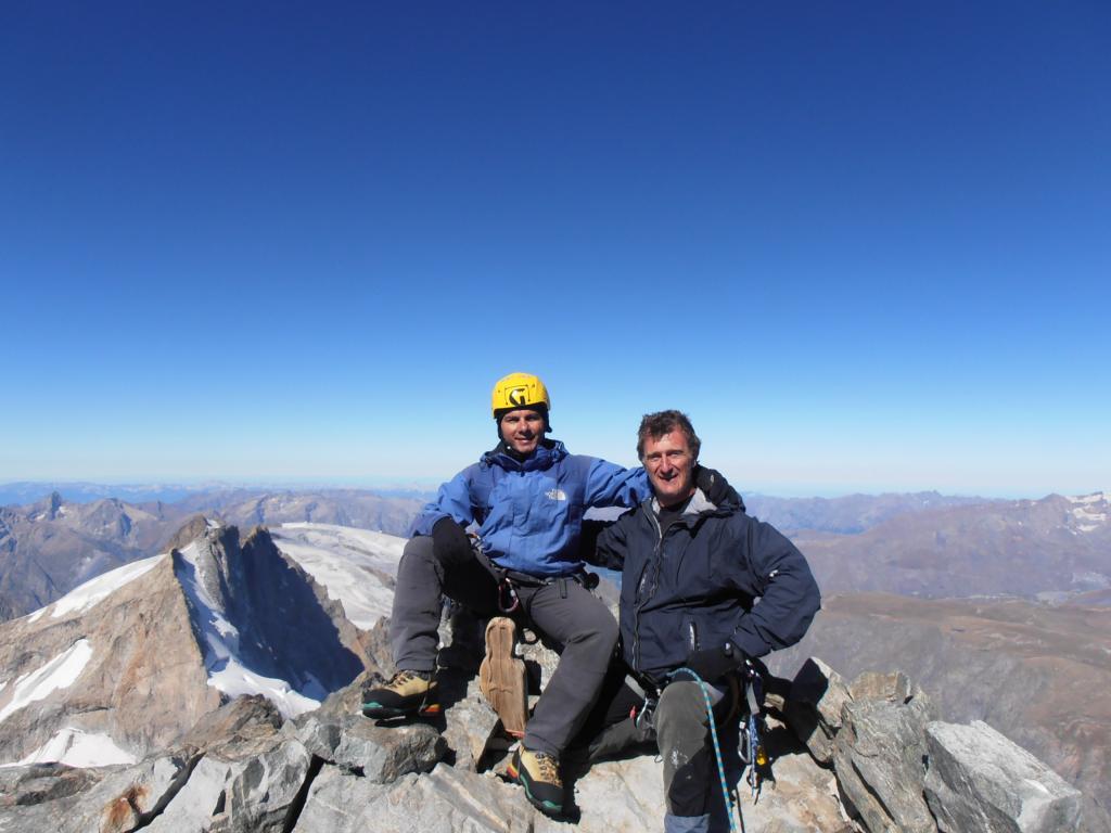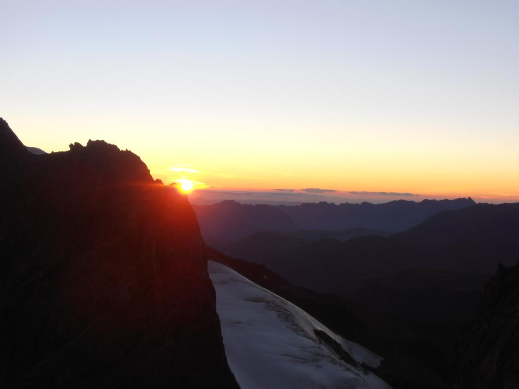 un altro bel viaggio su una delle montagne piu selvagge delle alpi francesi, incomincia arrivati alle 8.30′ al park dove teoricamente uno arriva dopo la traversata scendendo dal rif ajgle,cosa istintiva per logistica ho puntato un sig.che passeggiava nel parcheggio (piccolo camping libero),gli ho chiesto se ci portava alla grave ,x poi riportare l’auto li,!!!con il mio piemontese me la son cavata e reciproca fiducia cosi e stato ,alle 9 avevamo i biglietti fatti x il primo troncone funivia(14e)x le 10 la seconda partenza (occhio agli orari in base al periodo)preso un buon caffe colazione in compagnia del sig(GENTILUOMO)e ognuno per la sua strada.alle 10.30′ inizia un lungo cammino x l’avvicinamento al promontoire che in 5 ore raggiungiamo ,d’apprima scalando gli enfectores,sempre molto esposto, poi quel che rimane del ghiacciaio secchissimo,passaggio facile unico accesso ben visibile, visto che la maggior parte dei ponti son crollati,dopo la terminale il pendio e una roccia sgretolata terribile da calpestare.arrivati al colle , si disarrampica un po e poi due doppie (50m)danno accesso a quel che rimane del ghiacciaio ultra secco probabilmente una volta c’erano i crepi ora era tutto liscio ghiaccio,in breve siamo al rif.ci concediamo una buona pausa ,altri alpinisti an seguito il nostro itinerario. il tutto sempre con una meteo a( balla)verso le 16 decidiamo di salire fin sopra il couloir (duamel) a circa 3500m un ottimo posto da bivacco che raggiungiamo con una bella scalata su roccia calda,itinerario intuibile e mai difficile(avevamo preventivato la notte all’aperto quindi lo zaino era bello carico)in una due ore di sole aspettando il tramonto ci siam fatti un ottima cenetta e preparatoci un ottimo posto branda , stupendo tramonto e notte con luna e stelle ,-1°la temperatura di notte.(non avevamo il sacco ,ma piumino e copri pantaloni ,eravamo al limite x il fresco.).l’indomani quando la prima cordata ci a fatto sveglia ,colazione e partenza verso la 6.30′ quando le luci dell’alba oramai illuminavano le pareti.da li in su fin al ghiacciaio carre’ direi che si concentrano le maggiori difficolta ,tra l’altro io avevo una relazione di (one ice )alla perfezione.il traverso che si compie su questo e in effetti infido se e’ ghiacciato ,meglio proteggersi ,una scivolata è fatale.,raggiunta la brecè si torna ad arrampicare più facilmente ma le cengette avevano un pò di neve della pertuba temporalesca di sabato,salendo si incontra l’ultima difficoltà (cavallo rosso)e da li in breve si è in cima al gran pic (10.30′)bello 360° panoramicissimo zero vento .tutta la traversata si e scalato sempre bene ovvio che l’expo e notevole ,sali scendi ecc,tutta senza ramponi tranne il (carrè,e il traverso dela zgismondi) l’unica parte facilitata se si vuol dire e il lungo traverso ascendente che si compie sul lato nord dopo le calate dal gran pic,(cavi metallici x proteggersi e facilitare la progressione,sempre fonte di discussioni etica e non)(allo stato attuale si presenta come fosse una goulotte),alle 17.30′ eravamo all’aigle.nota bene le doppie oramai qua e la c’e ne di tutte le misure però con quelle da trenta si fanno tutte le calate,tranne l’ultima che ti porta fuori dalla terminale va oltre 50m,a seconda dell’innevamento. da li in un attimo si è al rifugio su traccia dei vari passaggi e zona di crepaccioni evidenti su tre bei ponti che mettevano un pò d’angoscia ,ghiacciaio anchesso ridotto male, piccola sosta al rif. e poi in 2’30′(ore 21)all’auto che fedelmente il sig. mi ha riparcheggiato al suo posto.un saluto a dario.