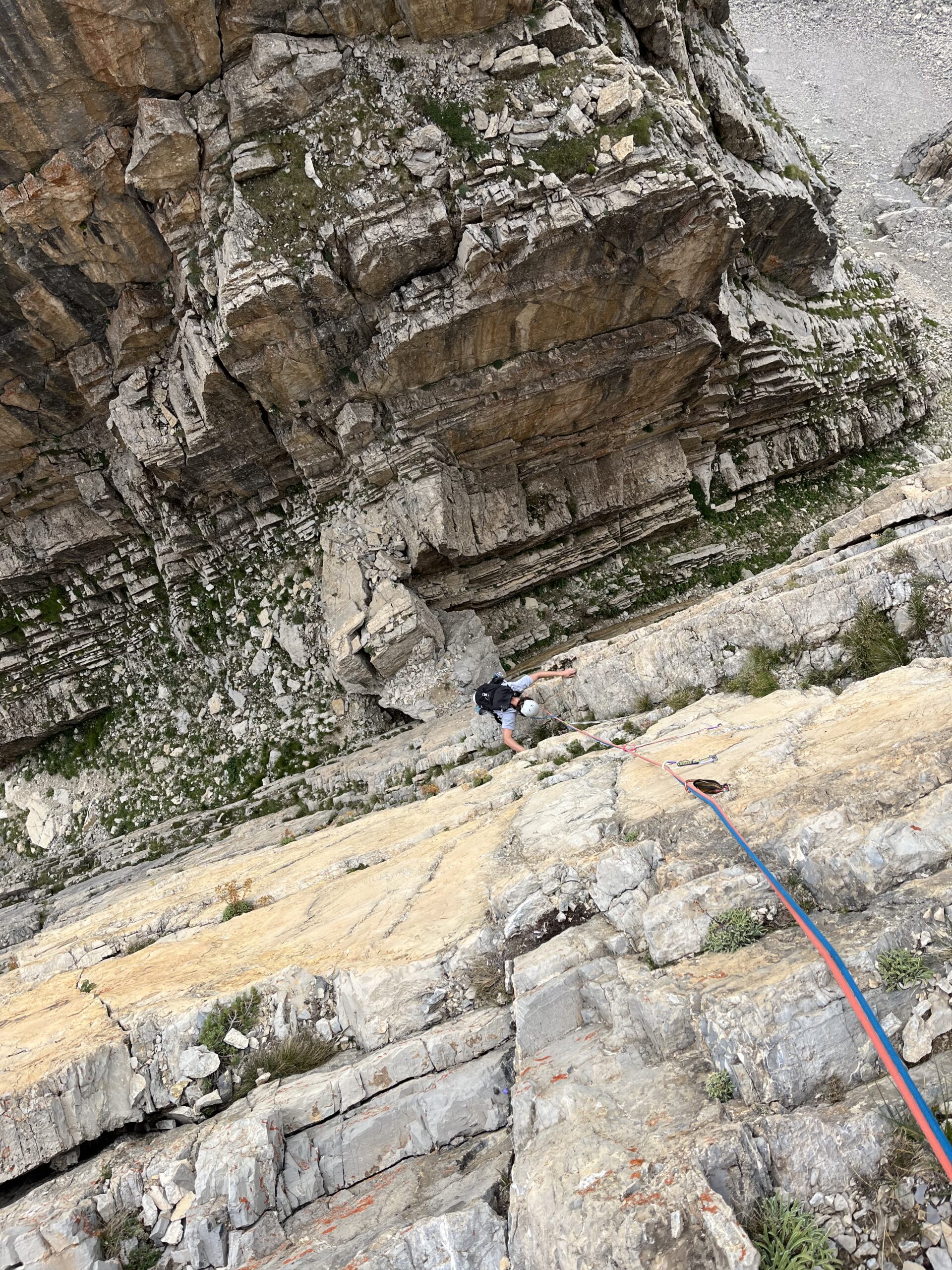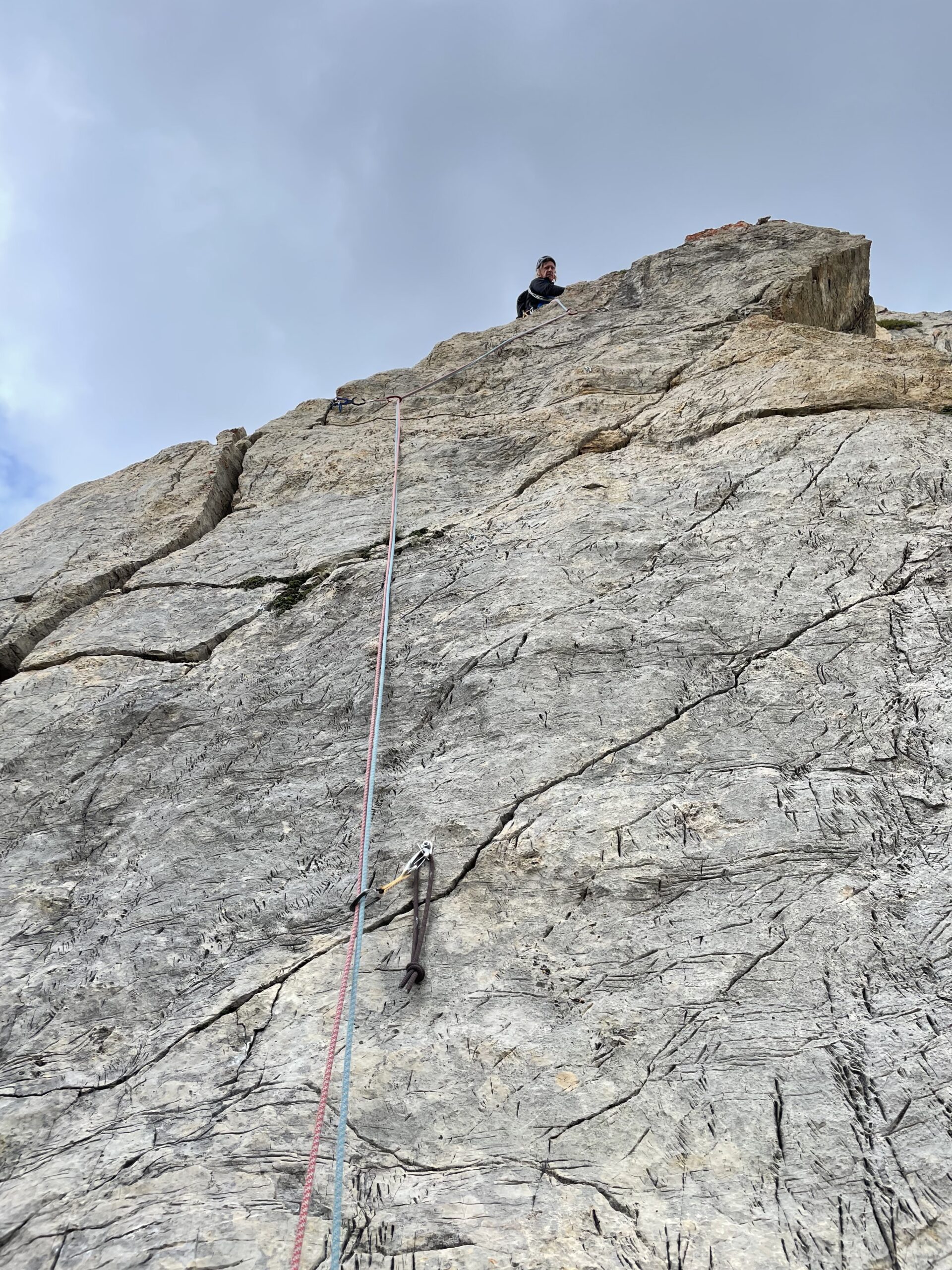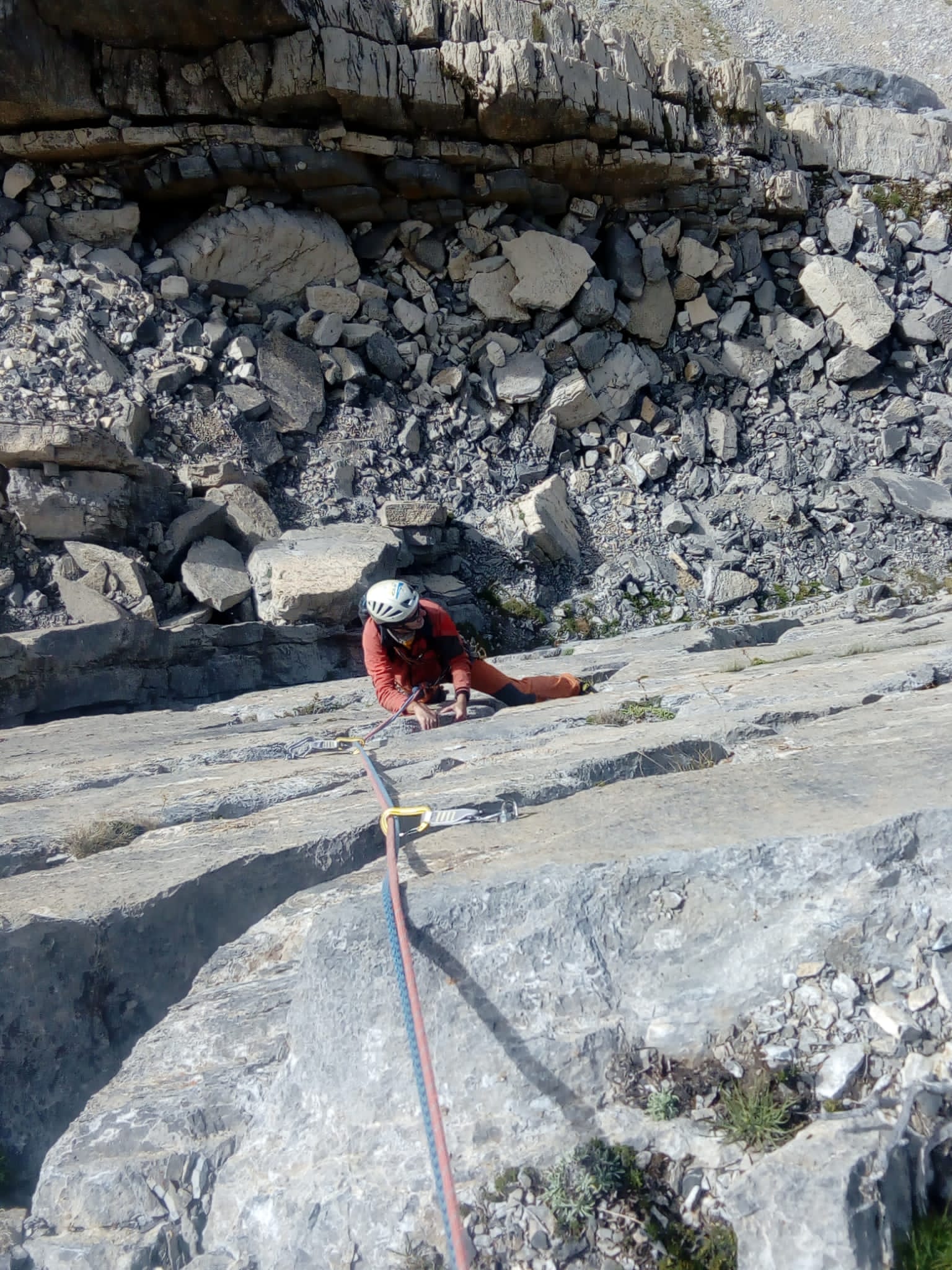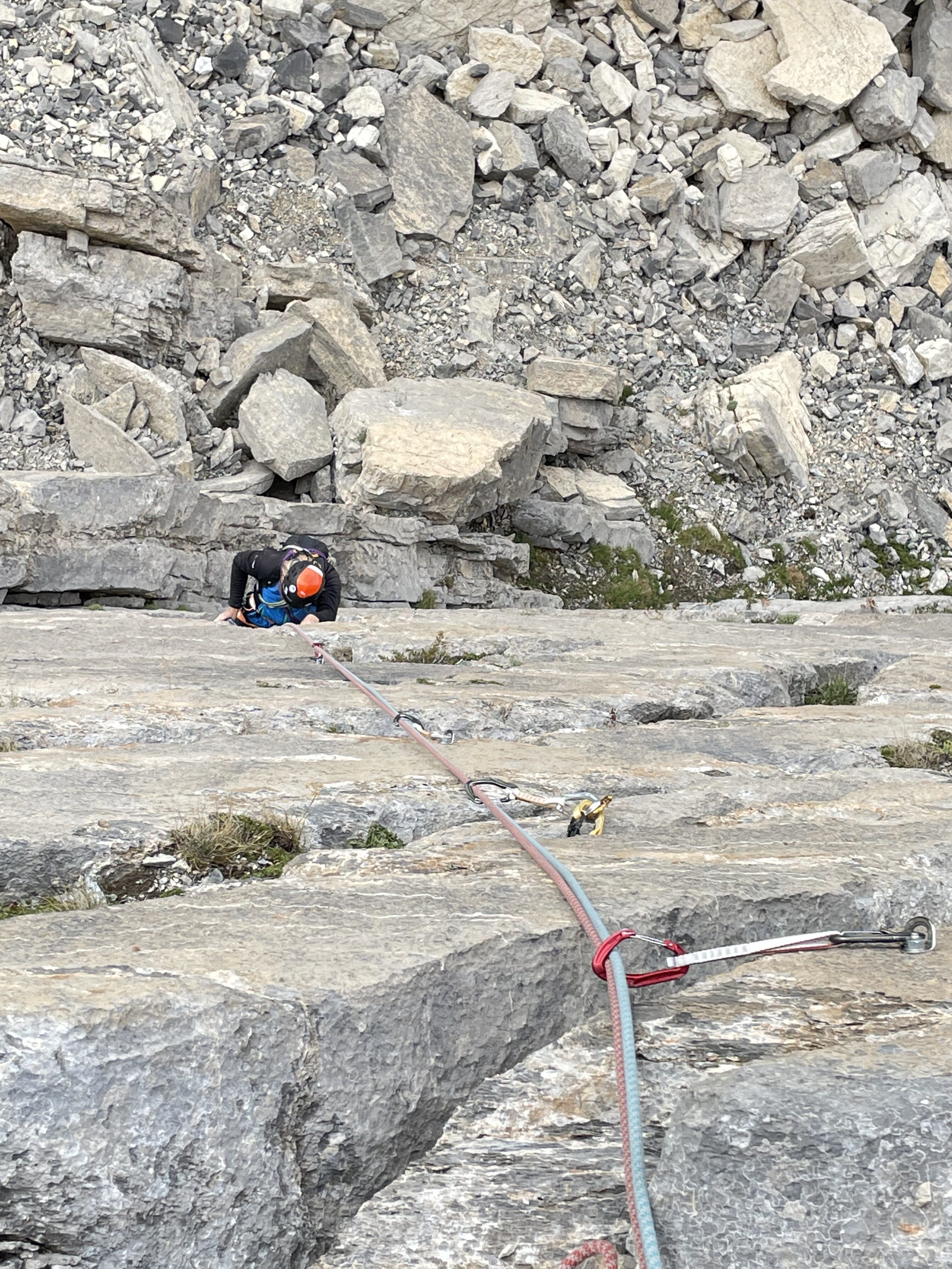- 11° Tiro Salire a dx. la placca spigolo arioso 35 mt. Sosta Catena