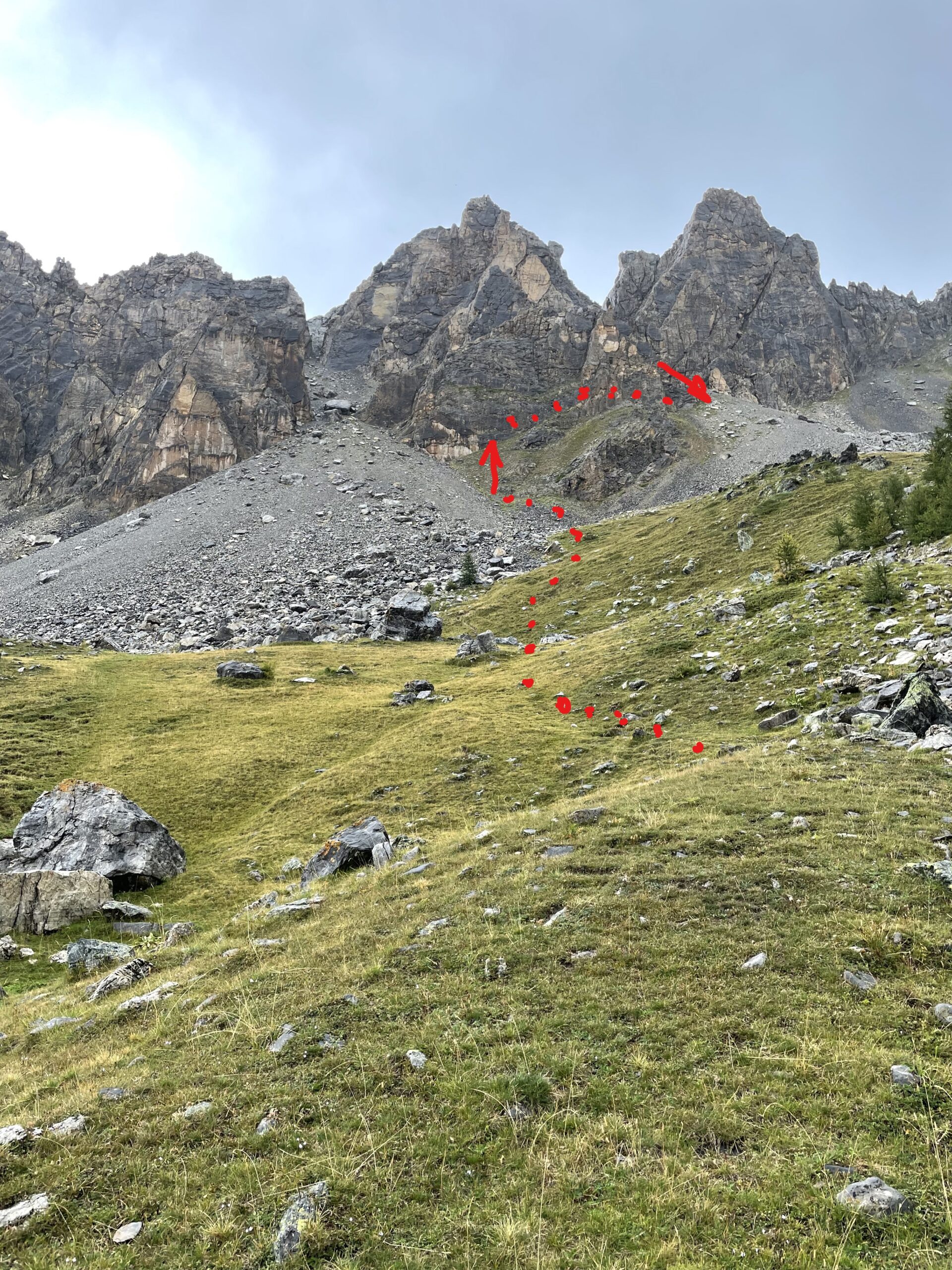 Discesa: dalla cima N° 1 doppia a dx. (Consigliata) poi a piedi nell’evidente canale oppure 3 doppie sulla via