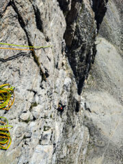Il primo tiro è una bella sveglia. Placche stupende! Giornata nuvolosa , senza pioggia per fortuna.