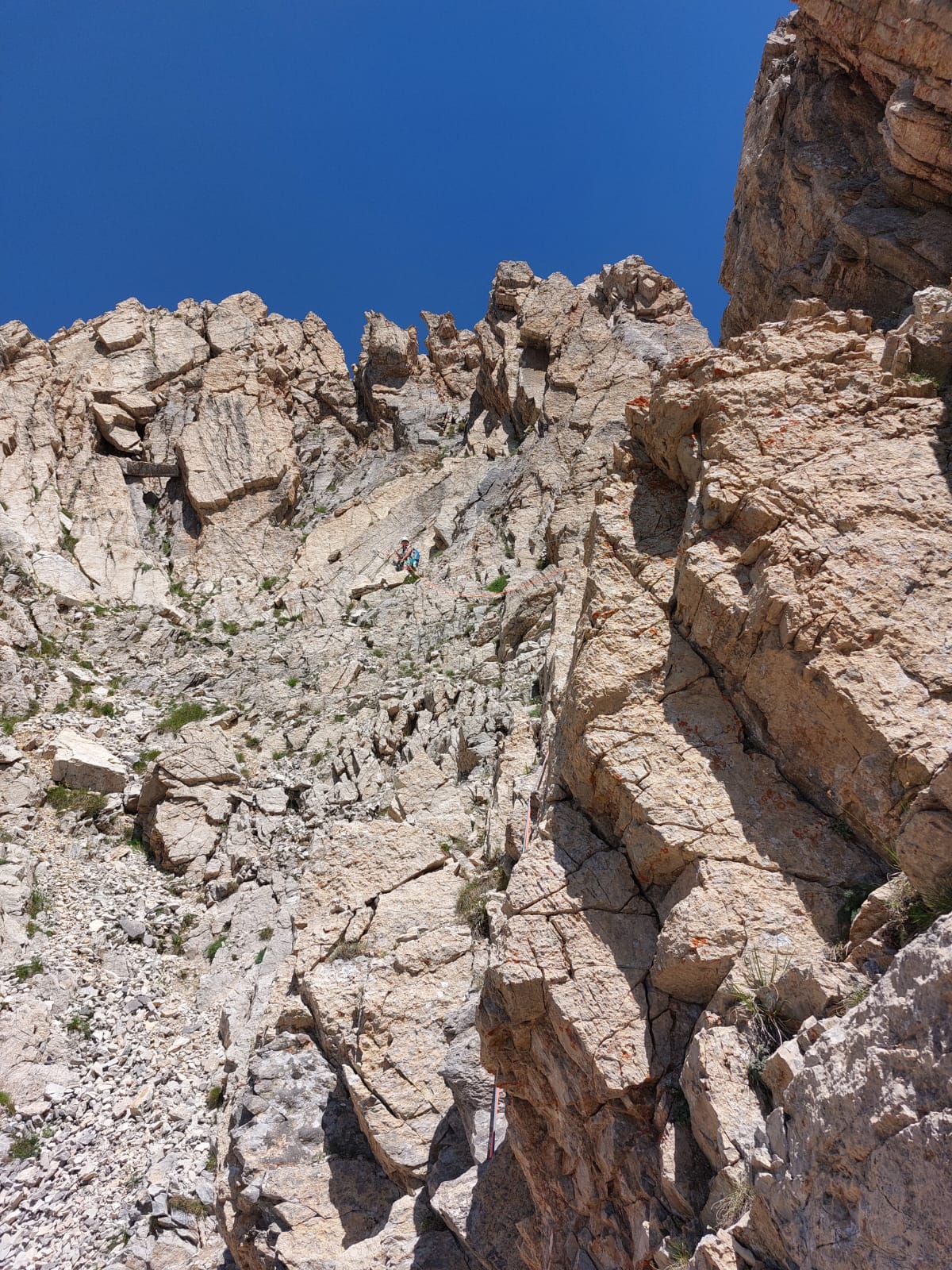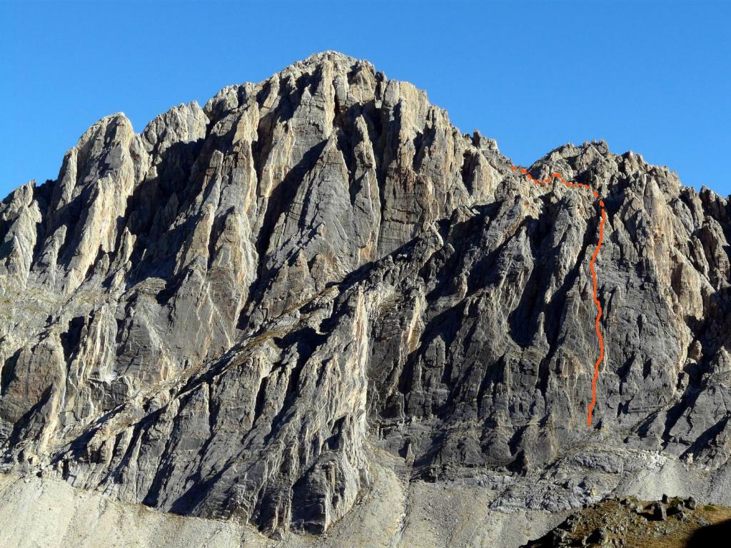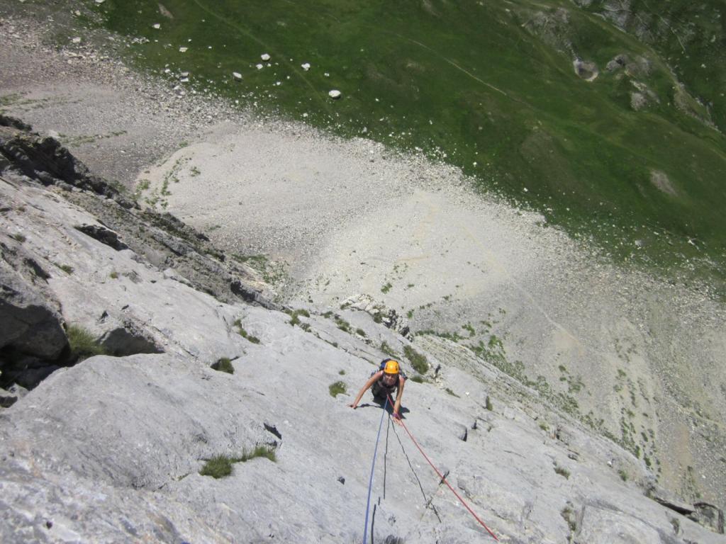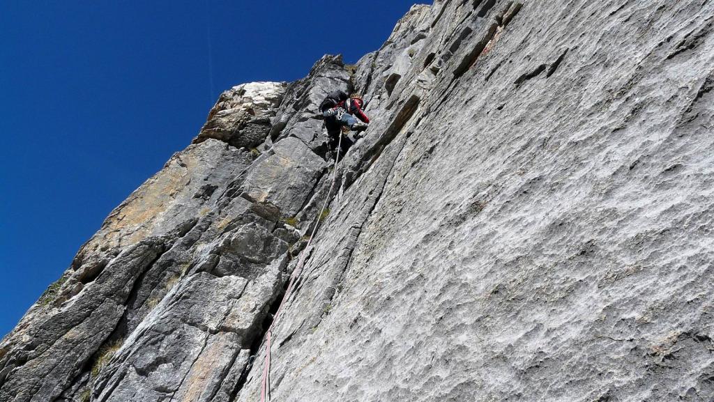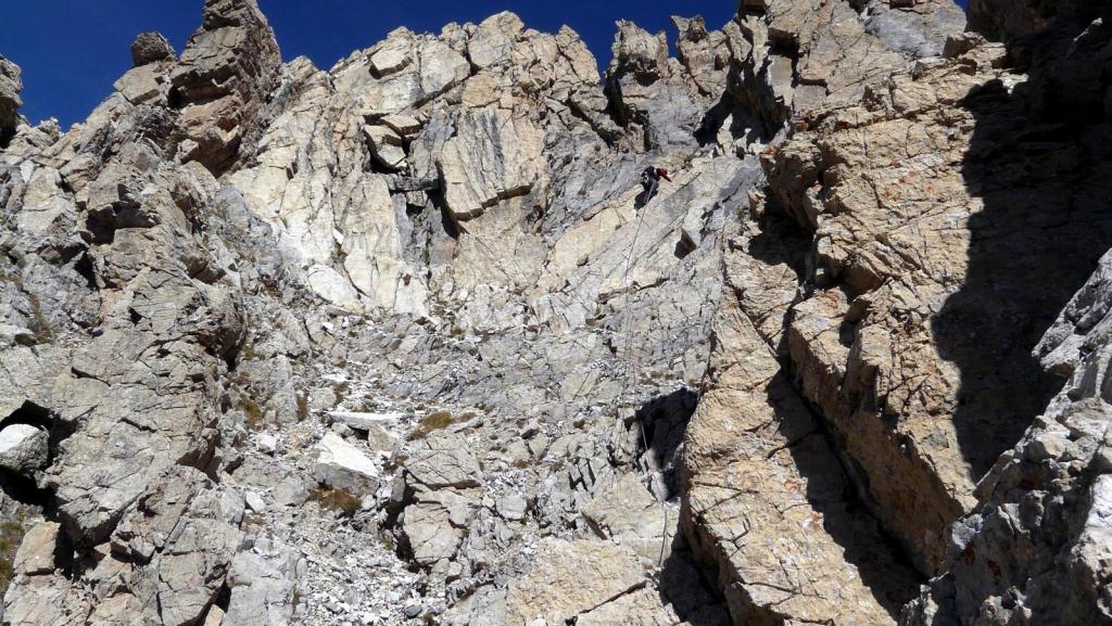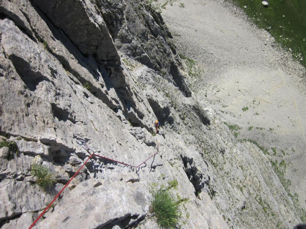 - L5: si prosegue seguendo lo spigolo (3b), poi un diedro (4b), infine la cresta (passi di 3°) fino alla vetta del torrione (1 chiodo, 1 spit, 1 chiodo con cordone di sosta, ATTENZIONE! roccia instabile e possibile incastro di corde, 30 m)