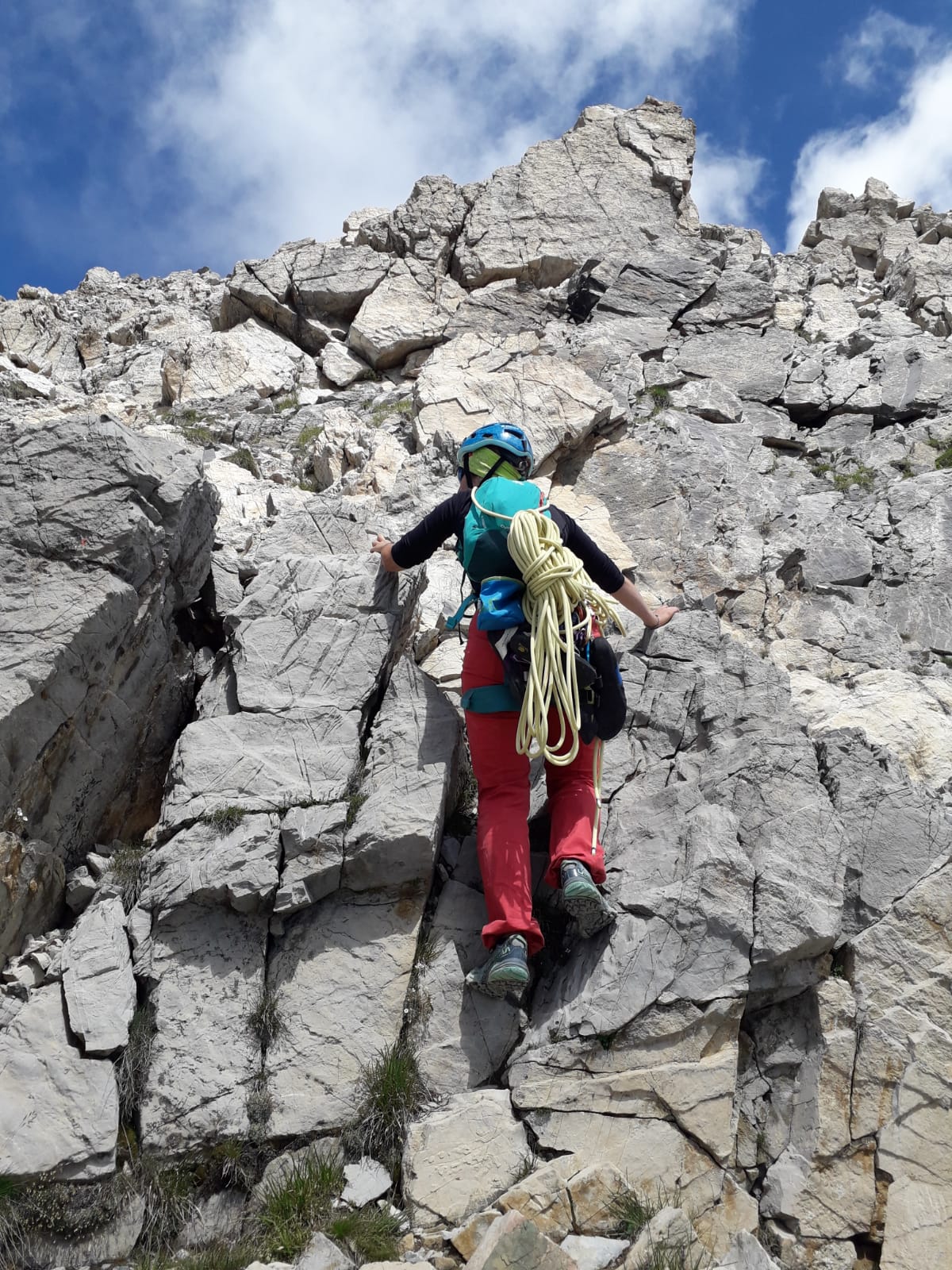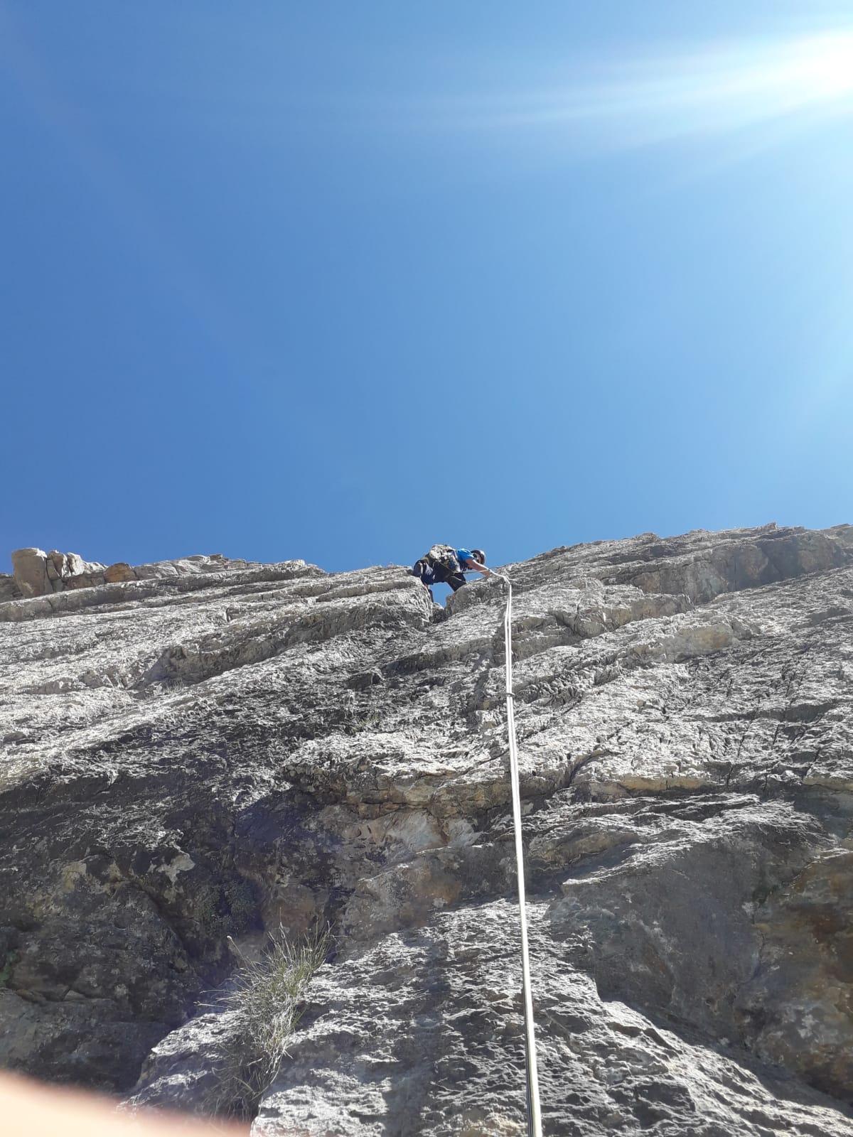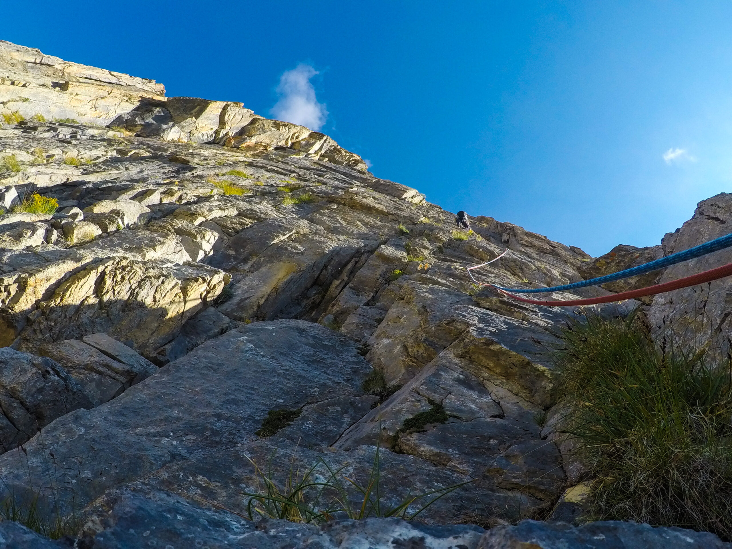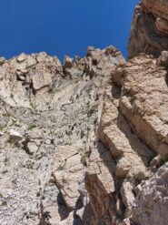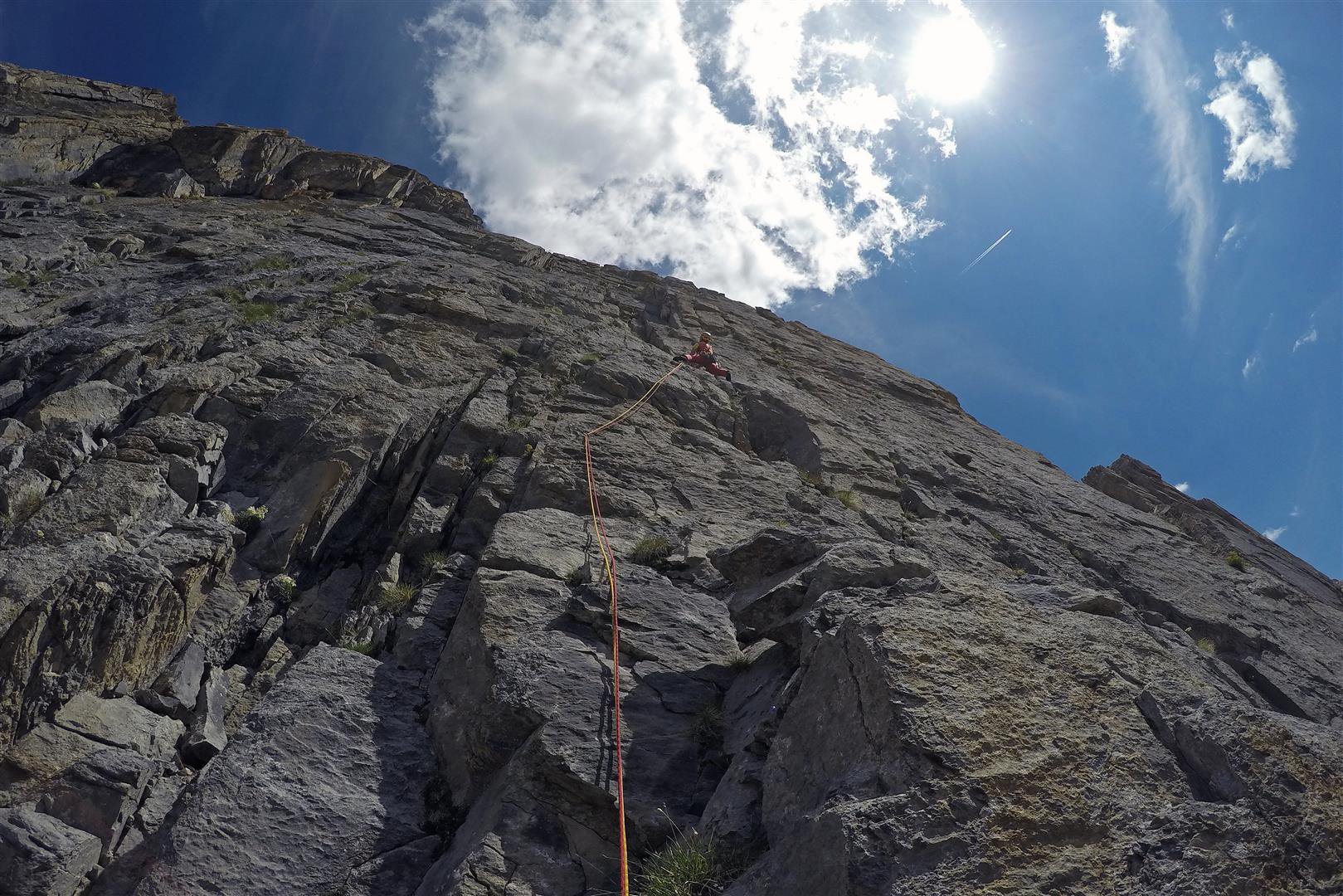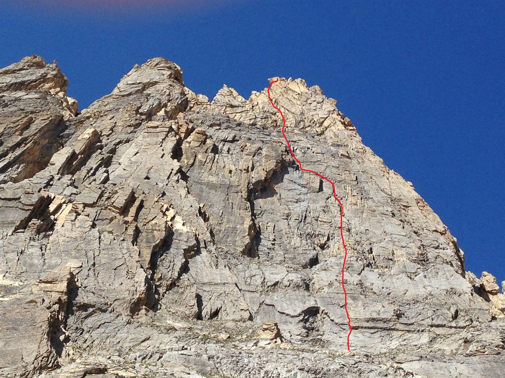 - L5: si prosegue seguendo lo spigolo (3b), poi un diedro (4b), infine la cresta (passi di 3°) fino alla vetta del torrione (1 chiodo, 1 spit, 1 chiodo con cordone di sosta, ATTENZIONE! roccia instabile e possibile incastro di corde, 30 m)