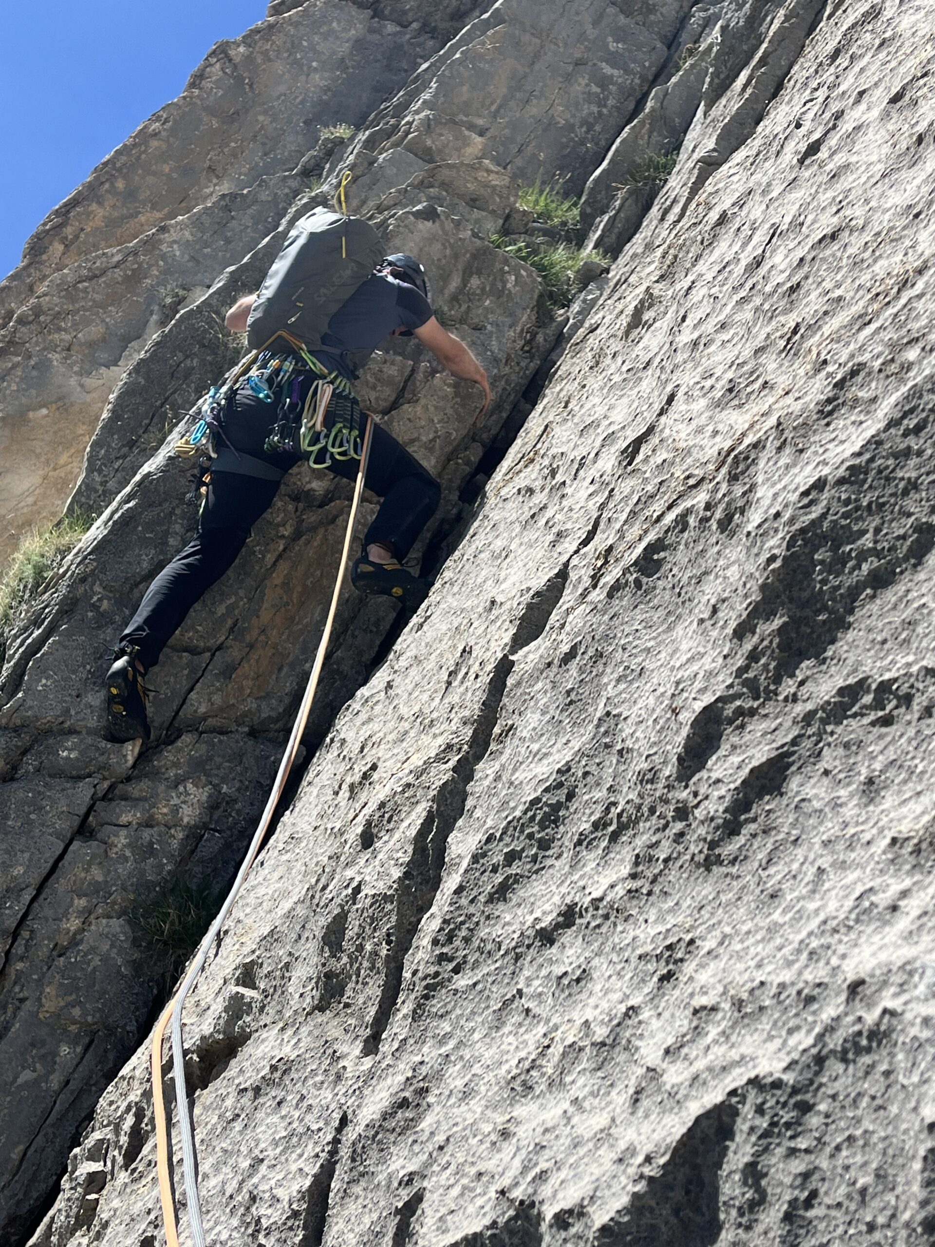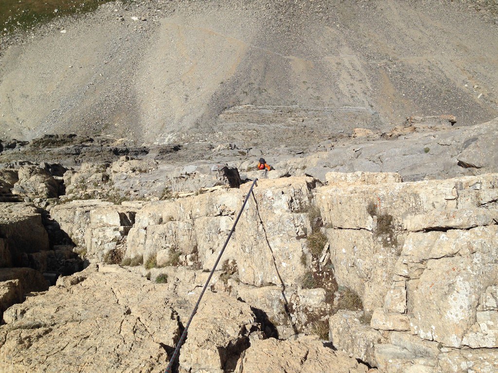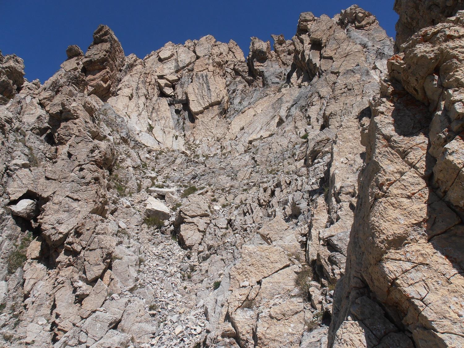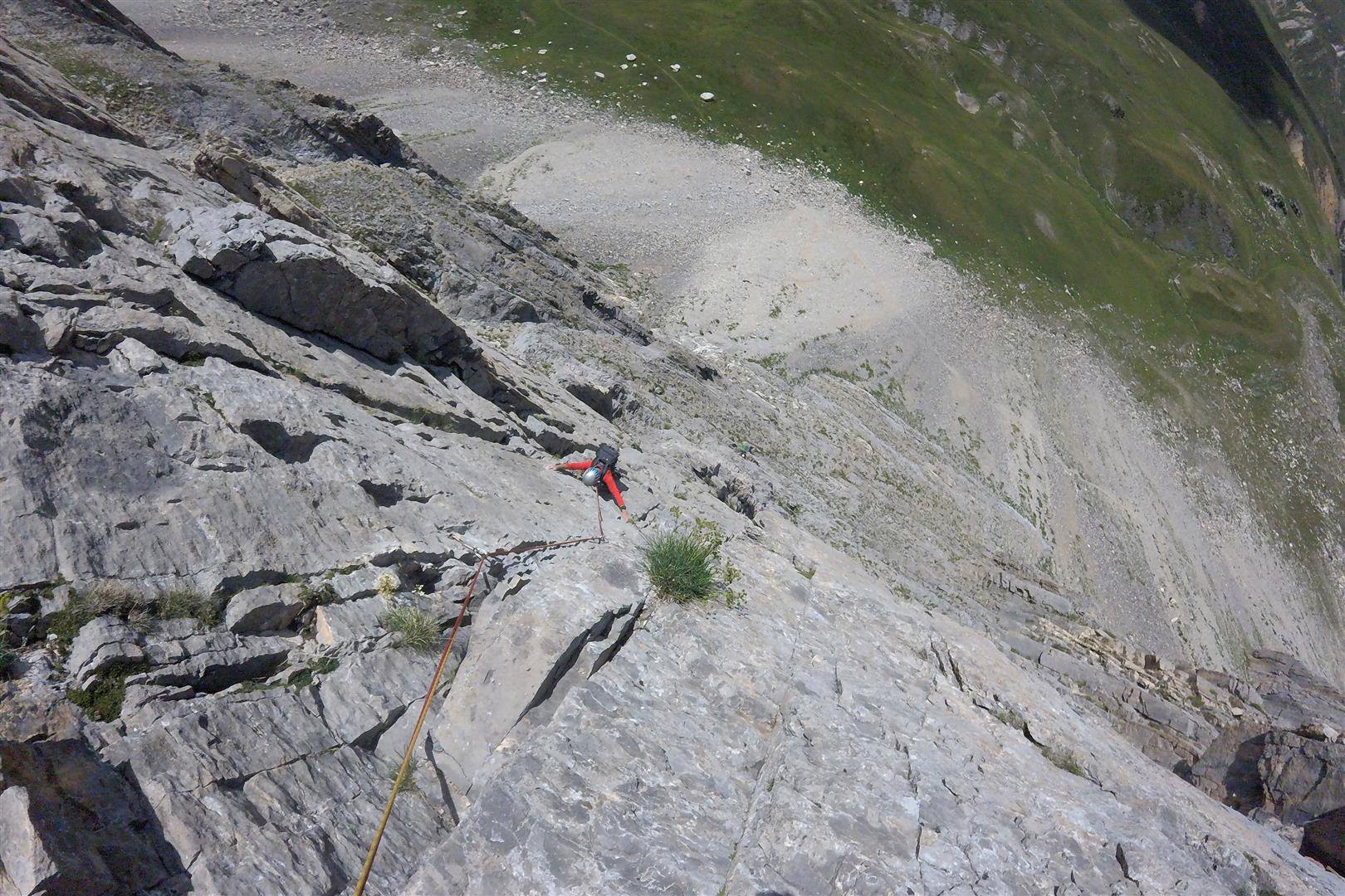 - L5: si prosegue seguendo lo spigolo (3b), poi un diedro (4b), infine la cresta (passi di 3°) fino alla vetta del torrione (1 chiodo, 1 spit, 1 chiodo con cordone di sosta, ATTENZIONE! roccia instabile e possibile incastro di corde, 30 m)