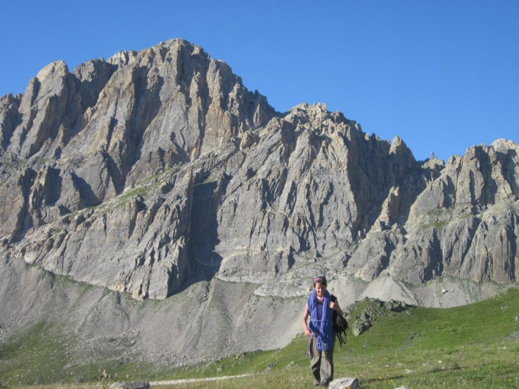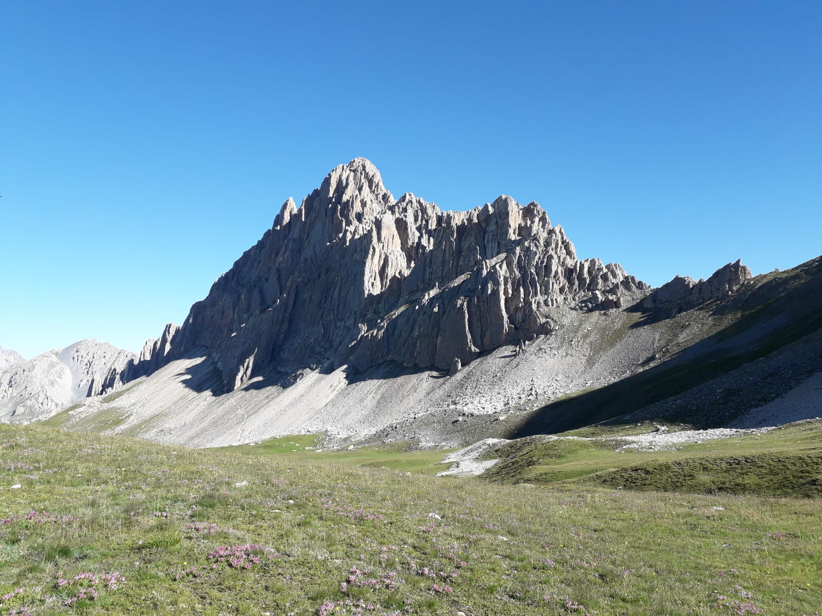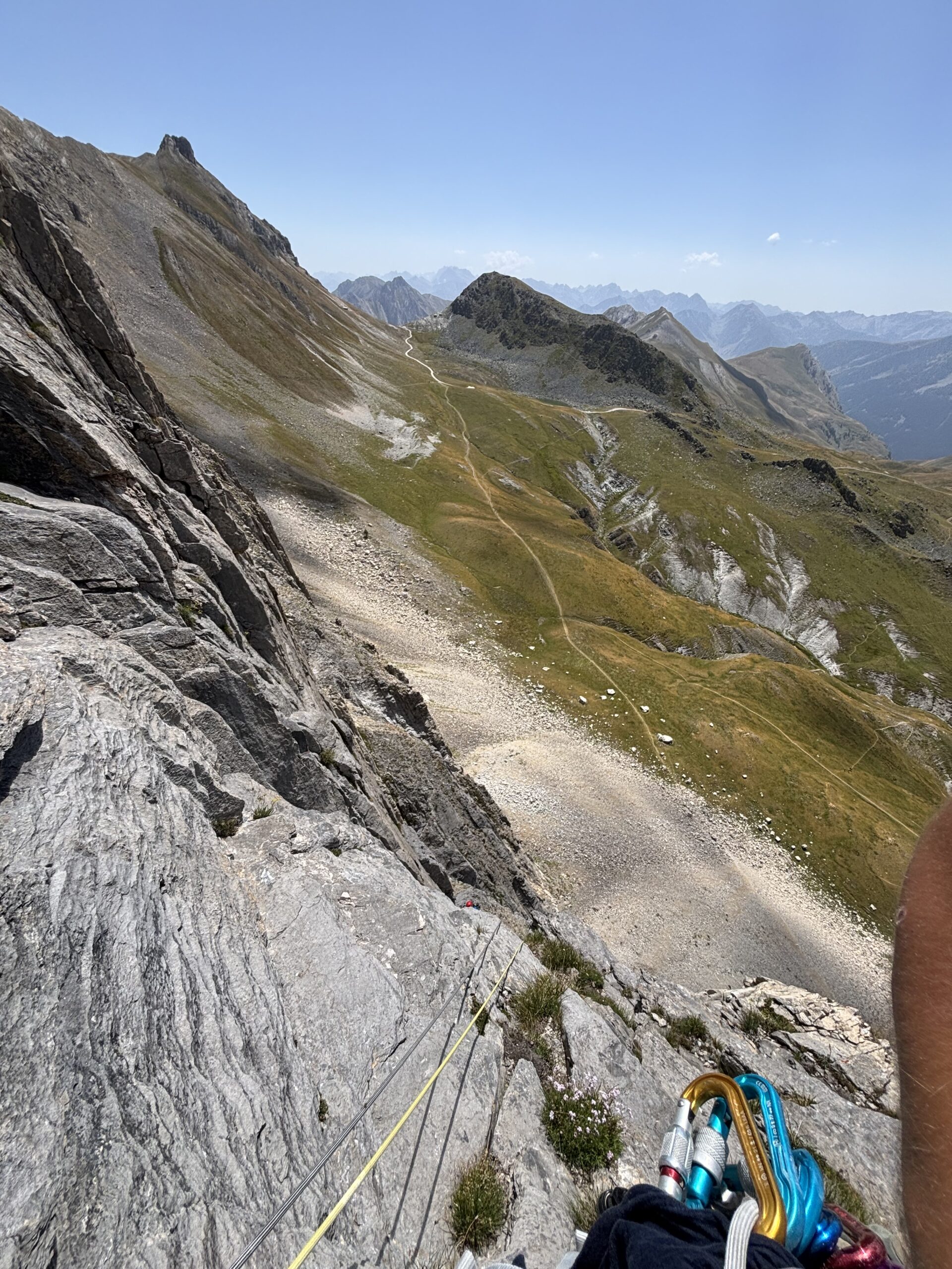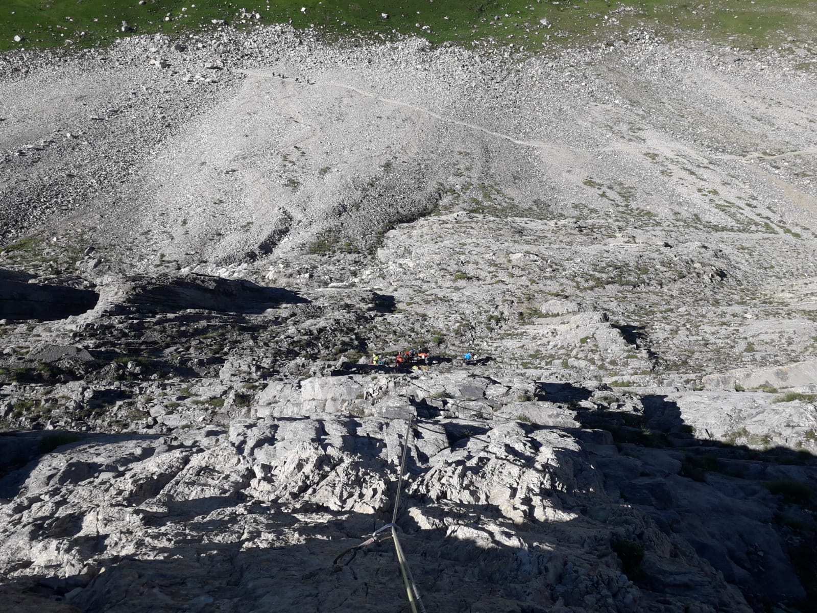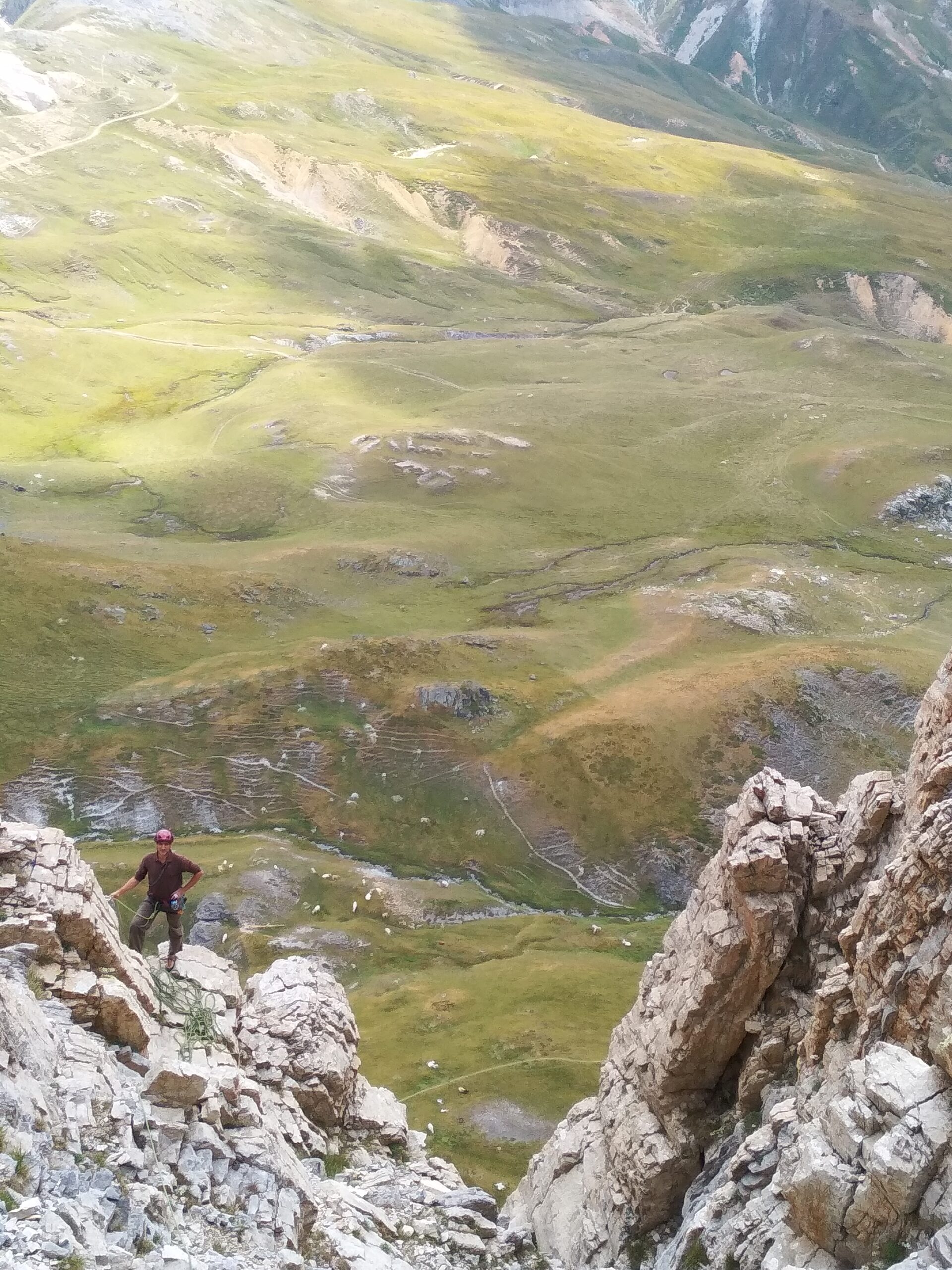 - L5: si prosegue seguendo lo spigolo (3b), poi un diedro (4b), infine la cresta (passi di 3°) fino alla vetta del torrione (1 chiodo, 1 spit, 1 chiodo con cordone di sosta, ATTENZIONE! roccia instabile e possibile incastro di corde, 30 m)