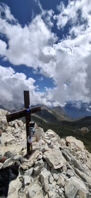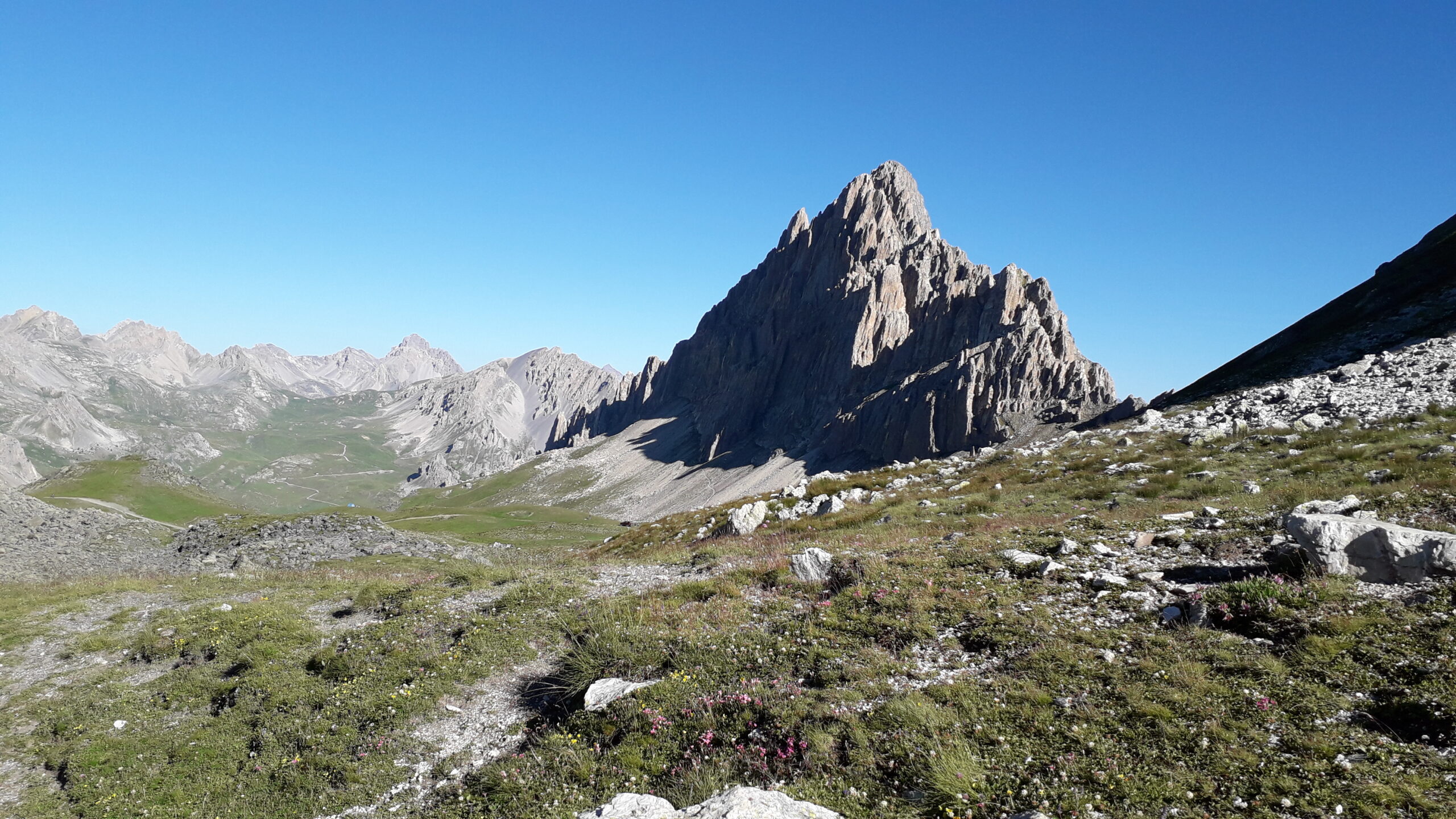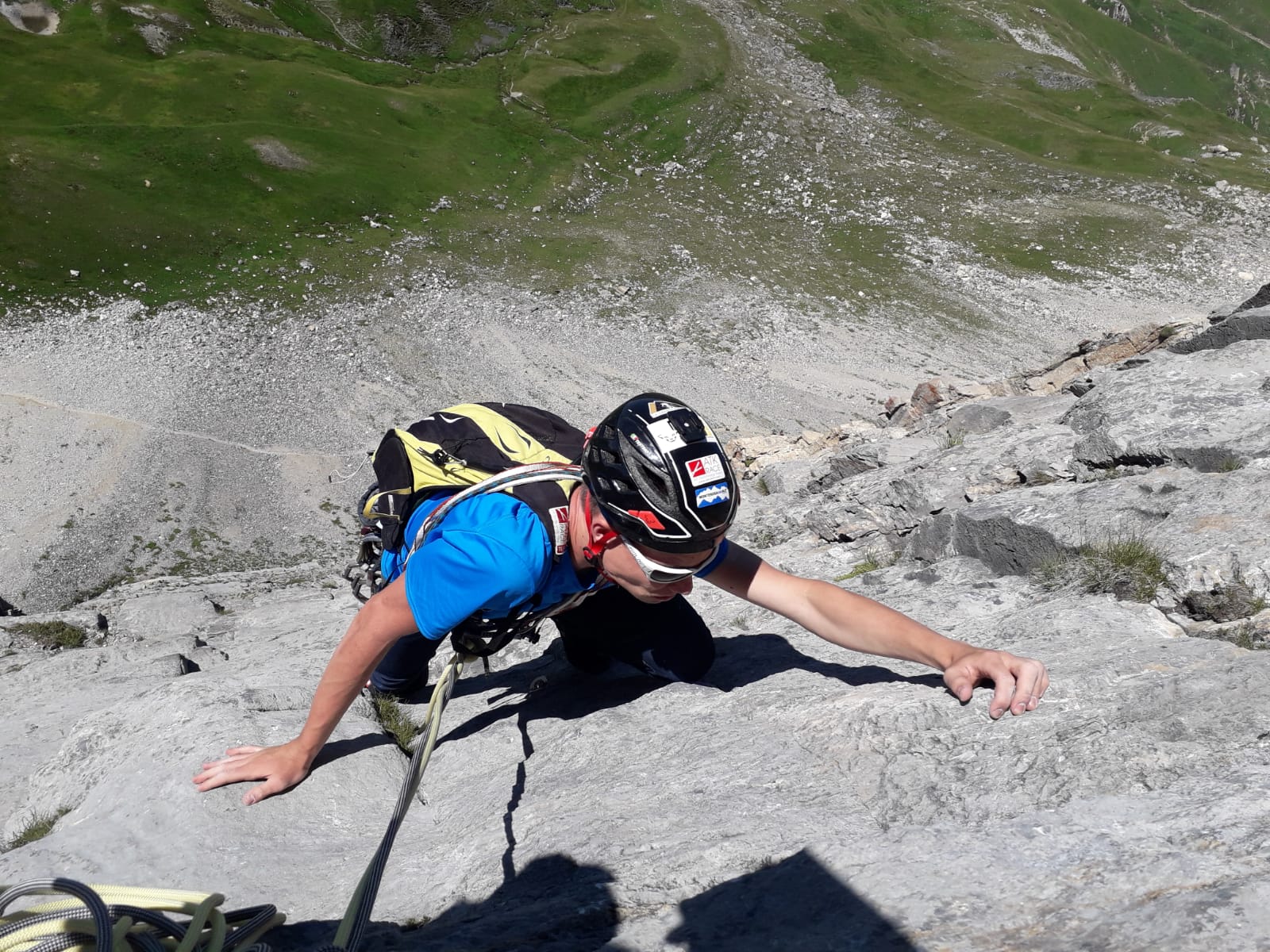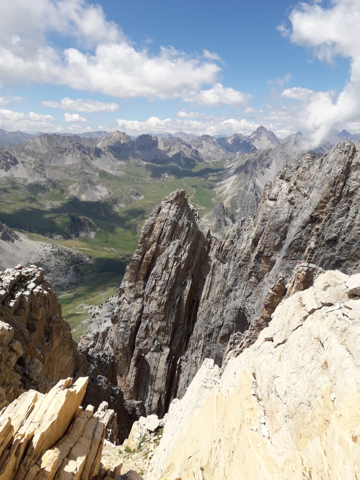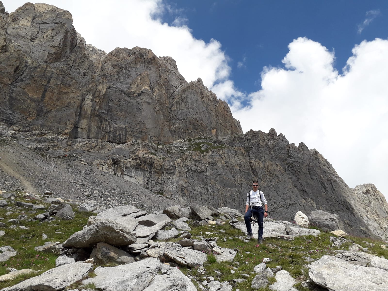 - L5: si prosegue seguendo lo spigolo (3b), poi un diedro (4b), infine la cresta (passi di 3°) fino alla vetta del torrione (1 chiodo, 1 spit, 1 chiodo con cordone di sosta, ATTENZIONE! roccia instabile e possibile incastro di corde, 30 m)
