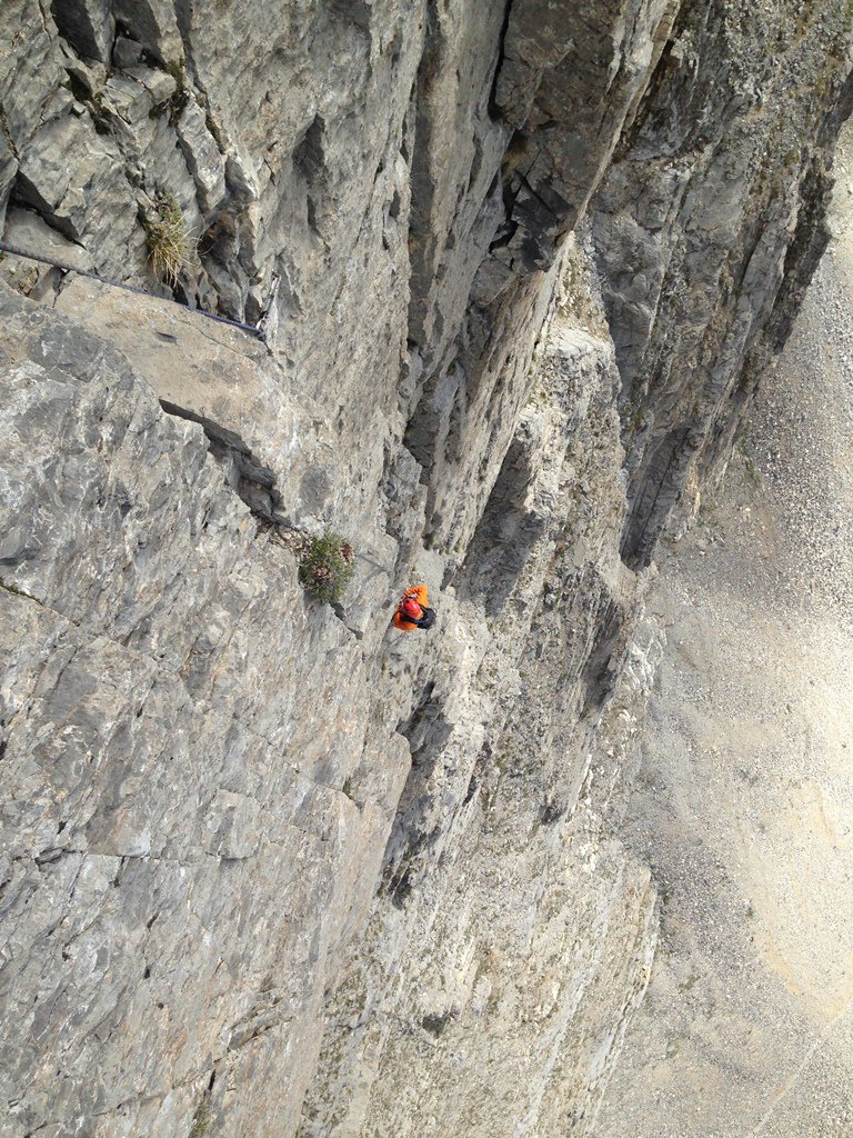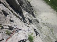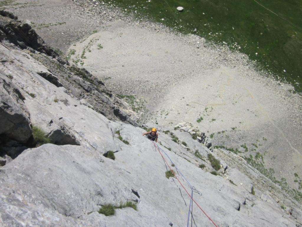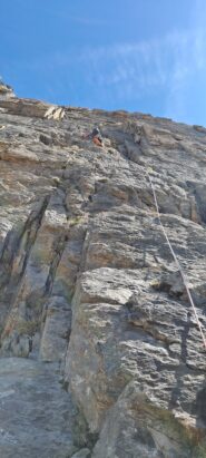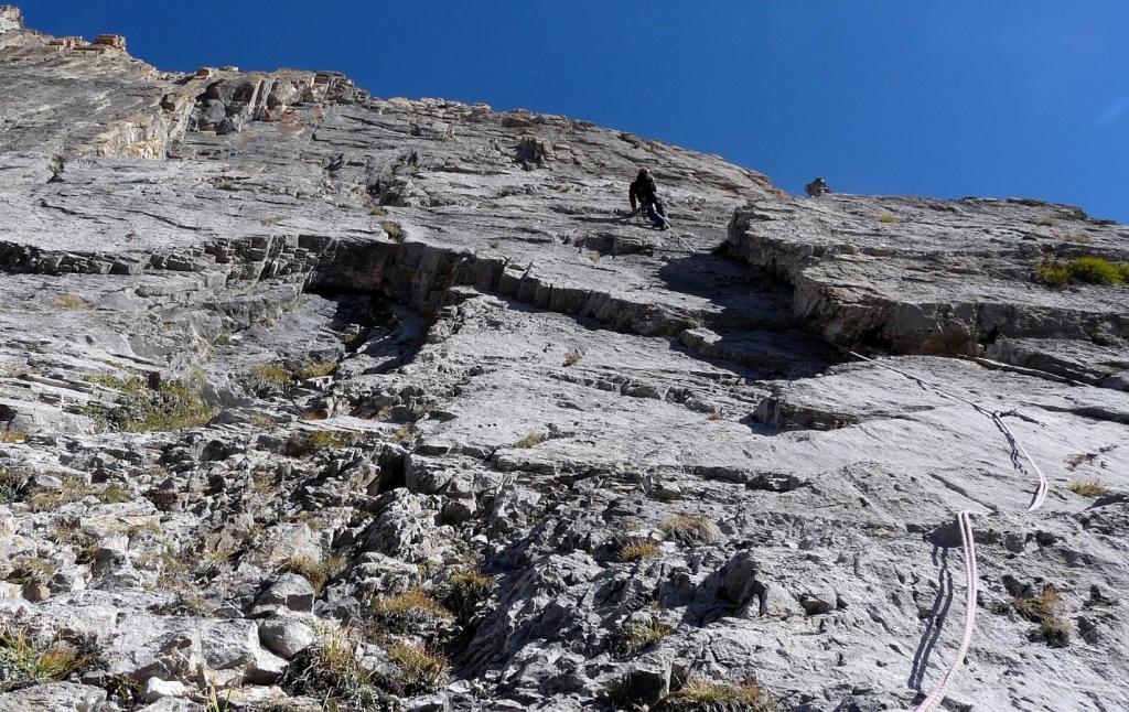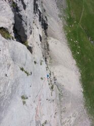 - L4: si sale il muro (5c) uscendo su una cengia, si prosegue superando una bella fessura (5b), segue una placca verticale fino alla sosta su un terrazzo alla base di uno spigolo (8 spit + 2 spit di sosta, 45 m)
