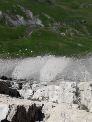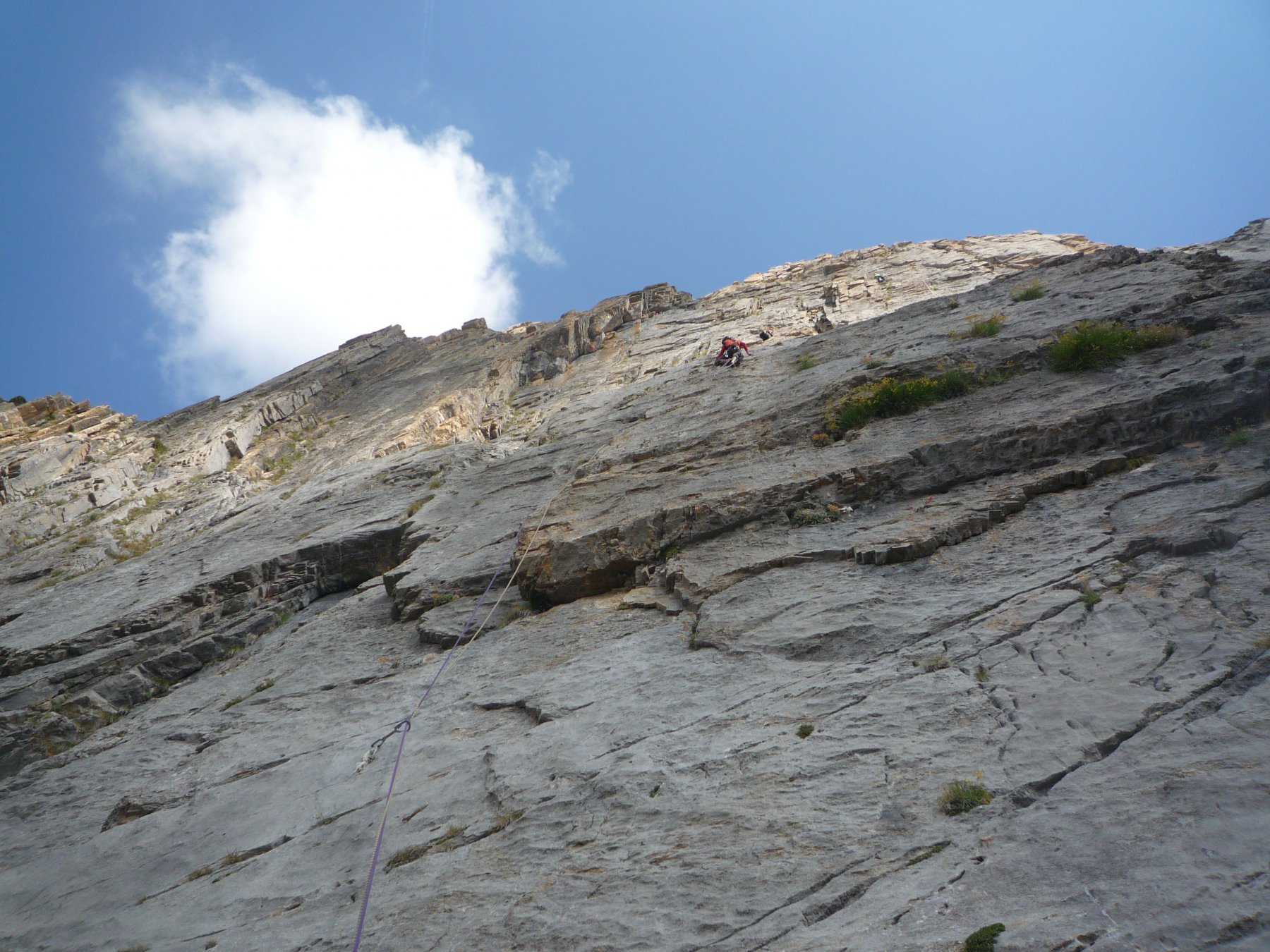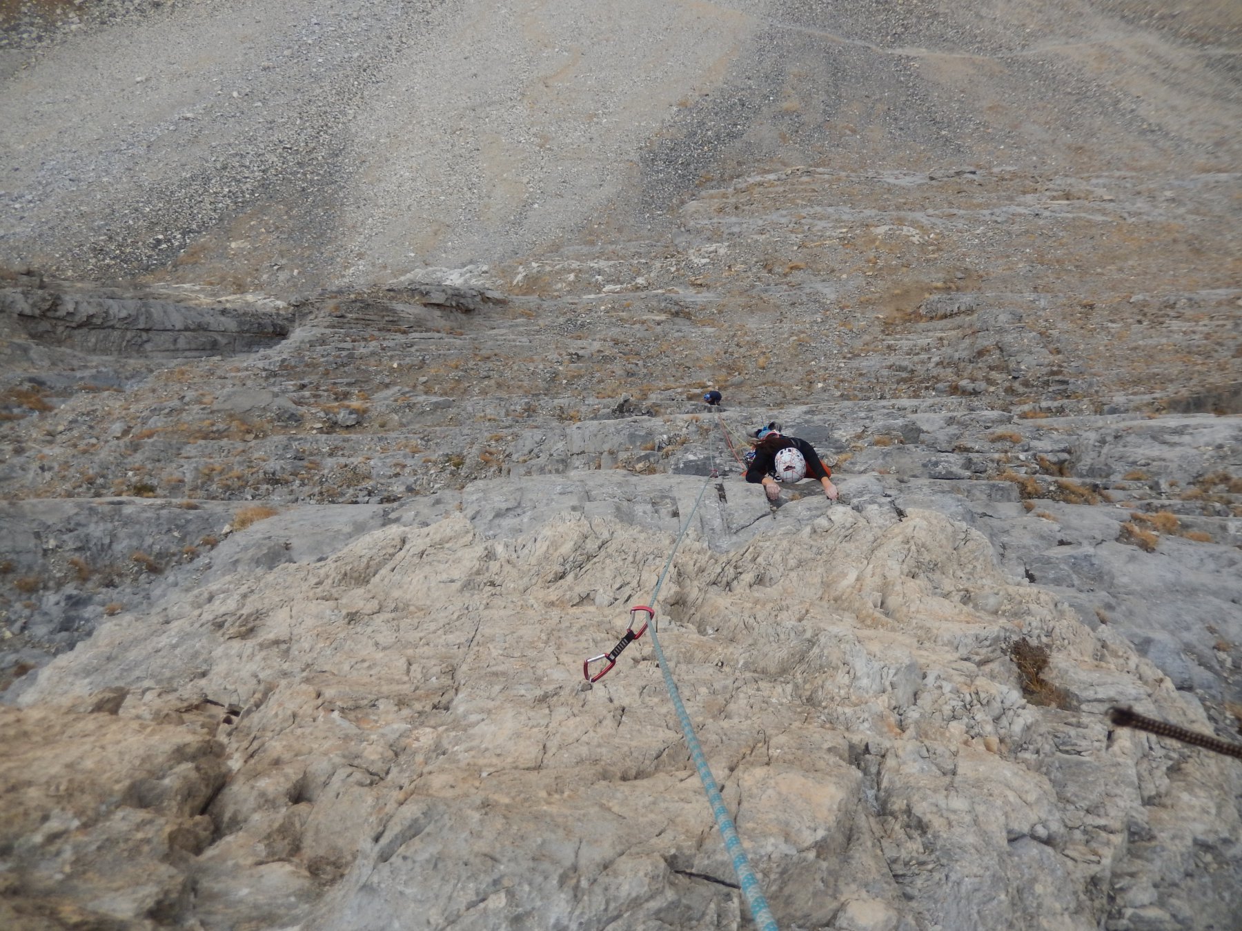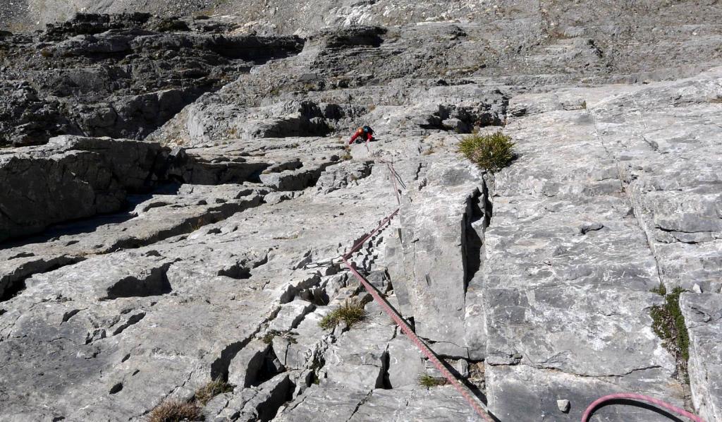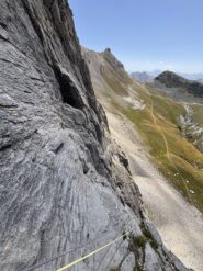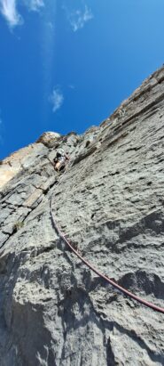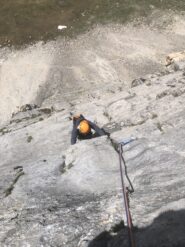 - L3: si traversa facilmente a sinistra e si risale un diedro (4b), si esce a sinistra e poi su placche più abbattute salendo sempre verso sinistra (passo di 5b) fino alla sosta sotto un muro verticale (7 spit + 2 spit di sosta, 45 m)