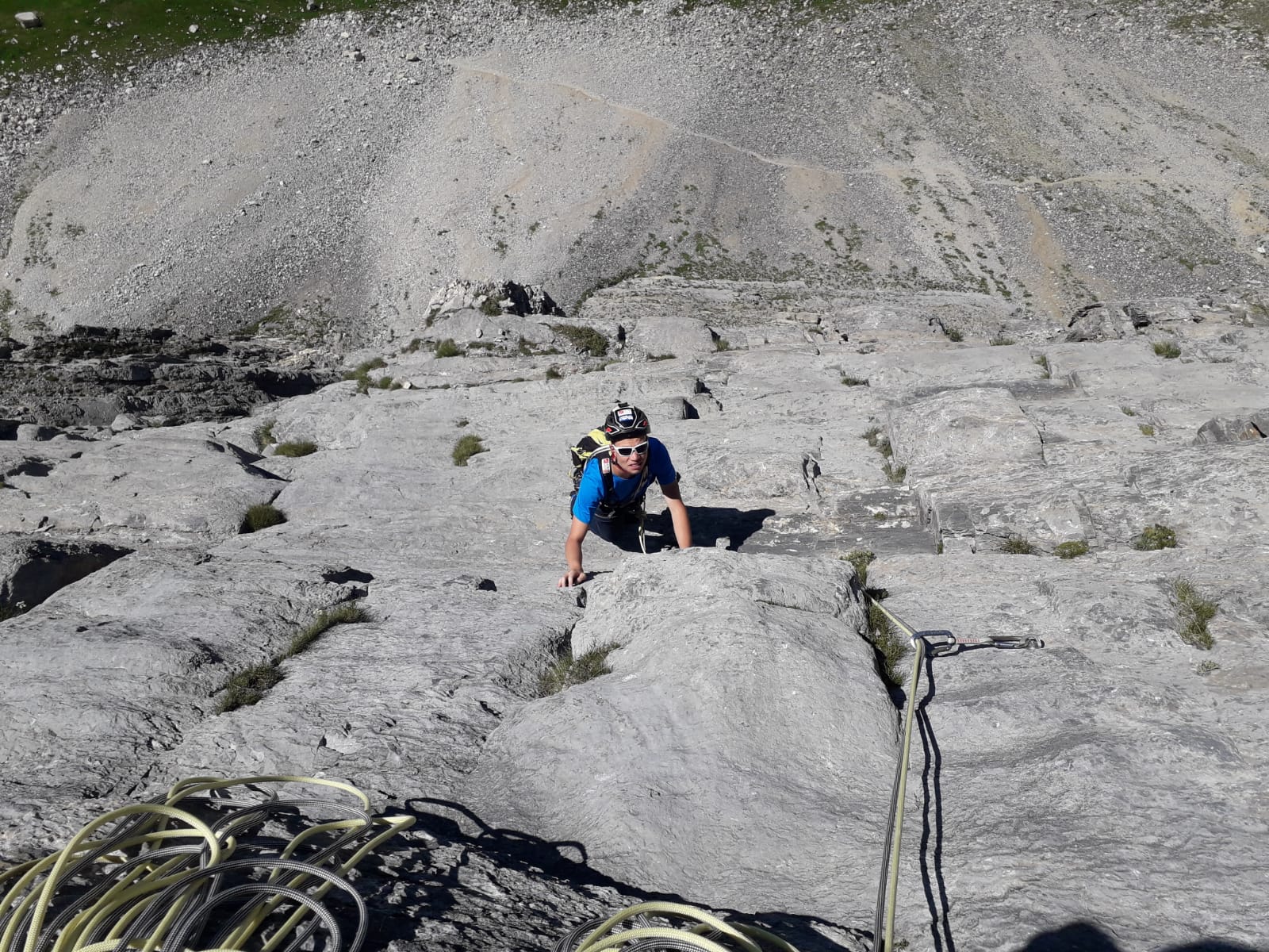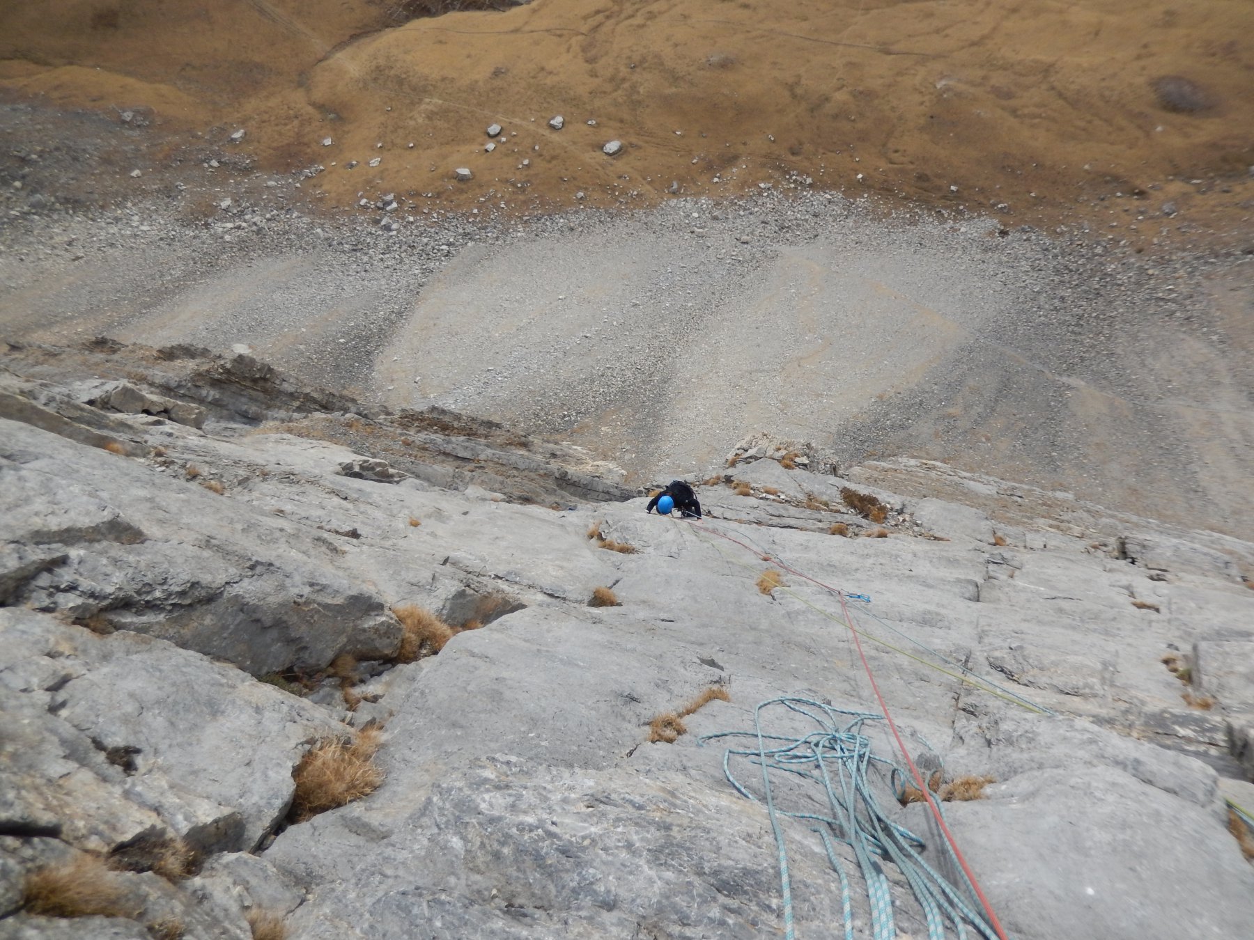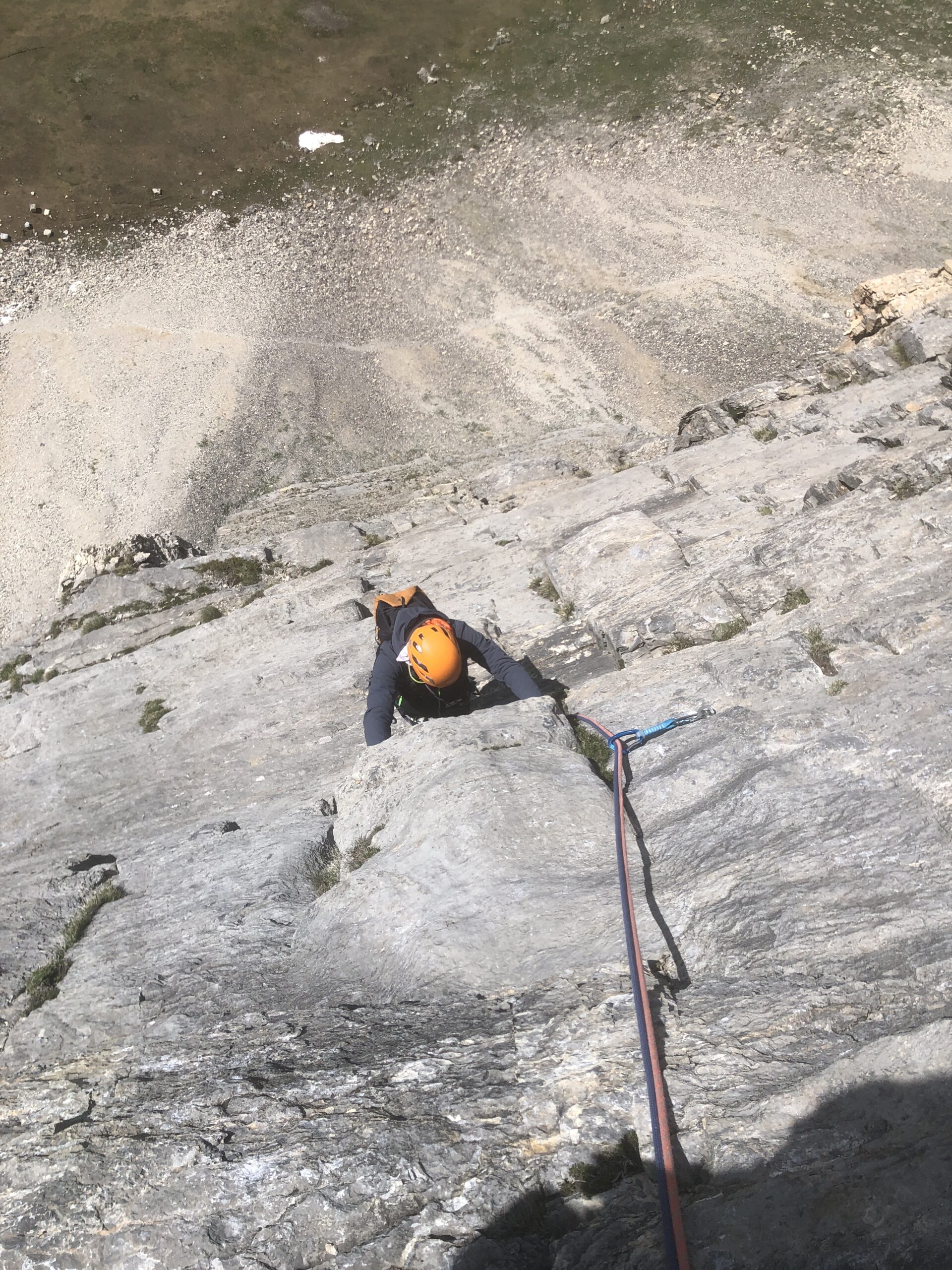 - L3: si traversa facilmente a sinistra e si risale un diedro (4b), si esce a sinistra e poi su placche più abbattute salendo sempre verso sinistra (passo di 5b) fino alla sosta sotto un muro verticale (7 spit + 2 spit di sosta, 45 m)