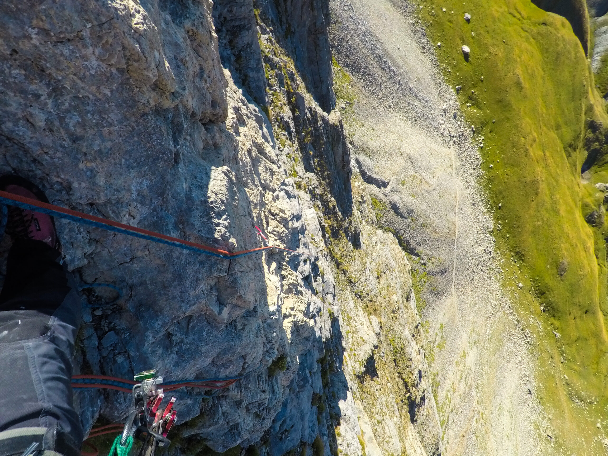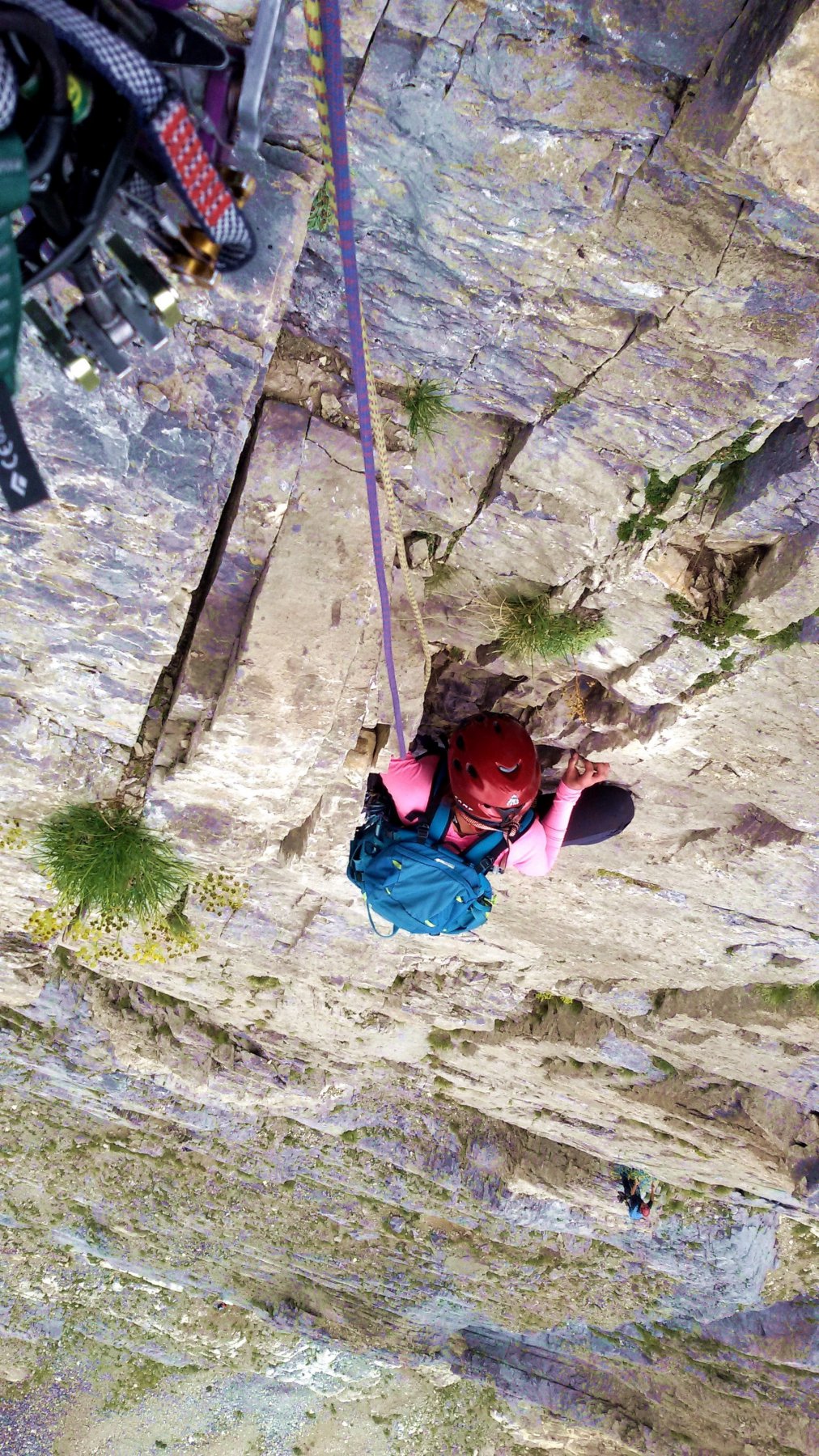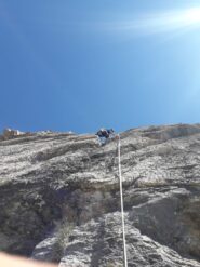 Oppure con una doppia da 30 m dalla sosta 4 fino a una sosta attrezzata fuori via, poi con altre 3 doppie da 40 m sulle soste della via.