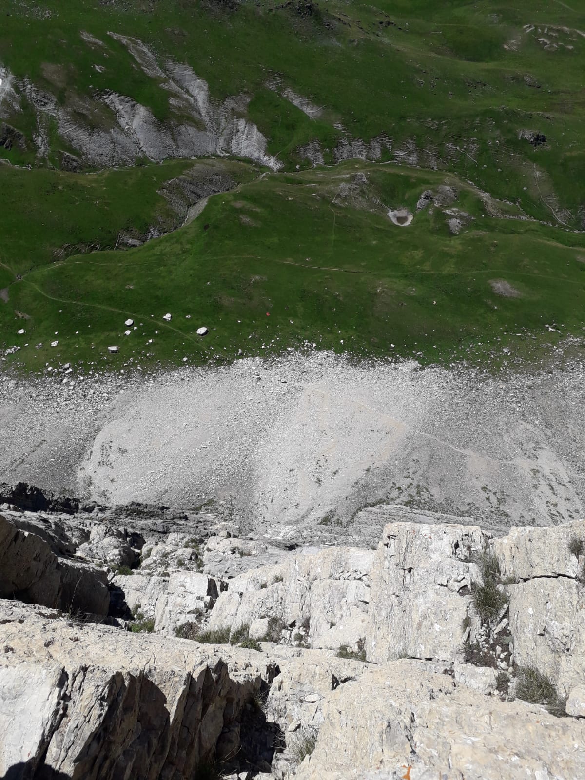dalla sosta 4 oppure dalla vetta del torrione è possibile traversare a sinistra facilmente per pietraie fino alla cengia della via normale, la si segue in discesa e si ritorna alla base della via (25/30 minuti).