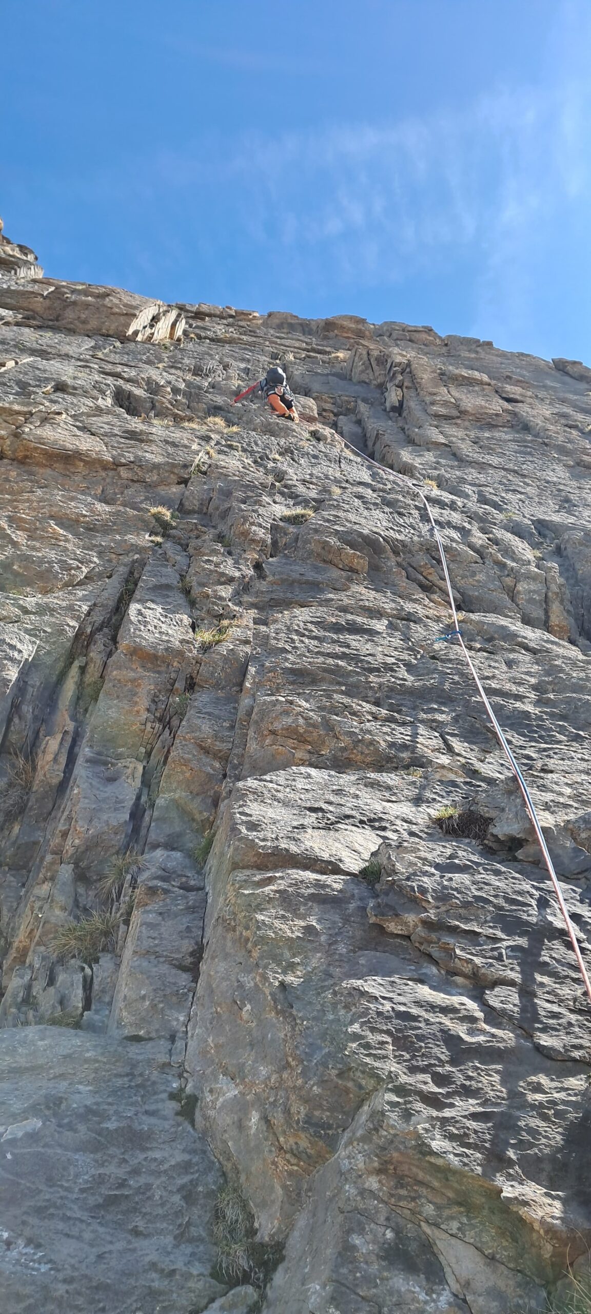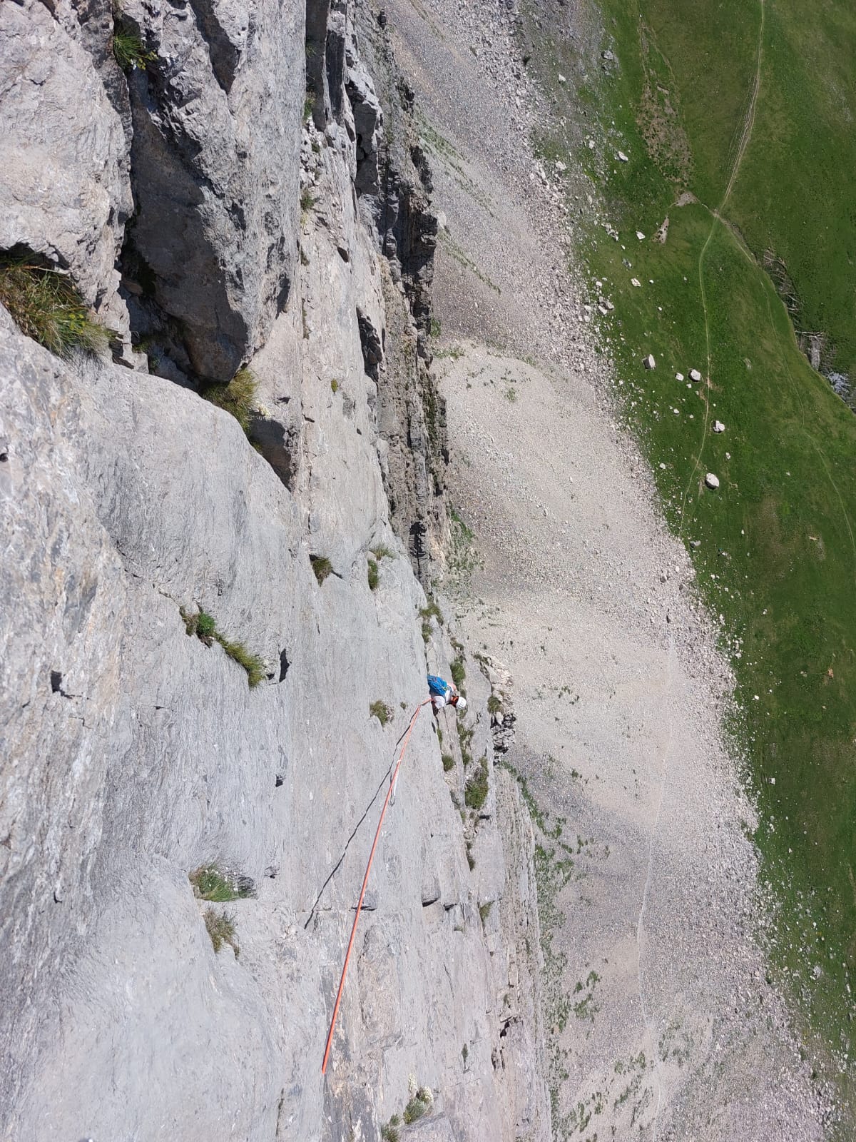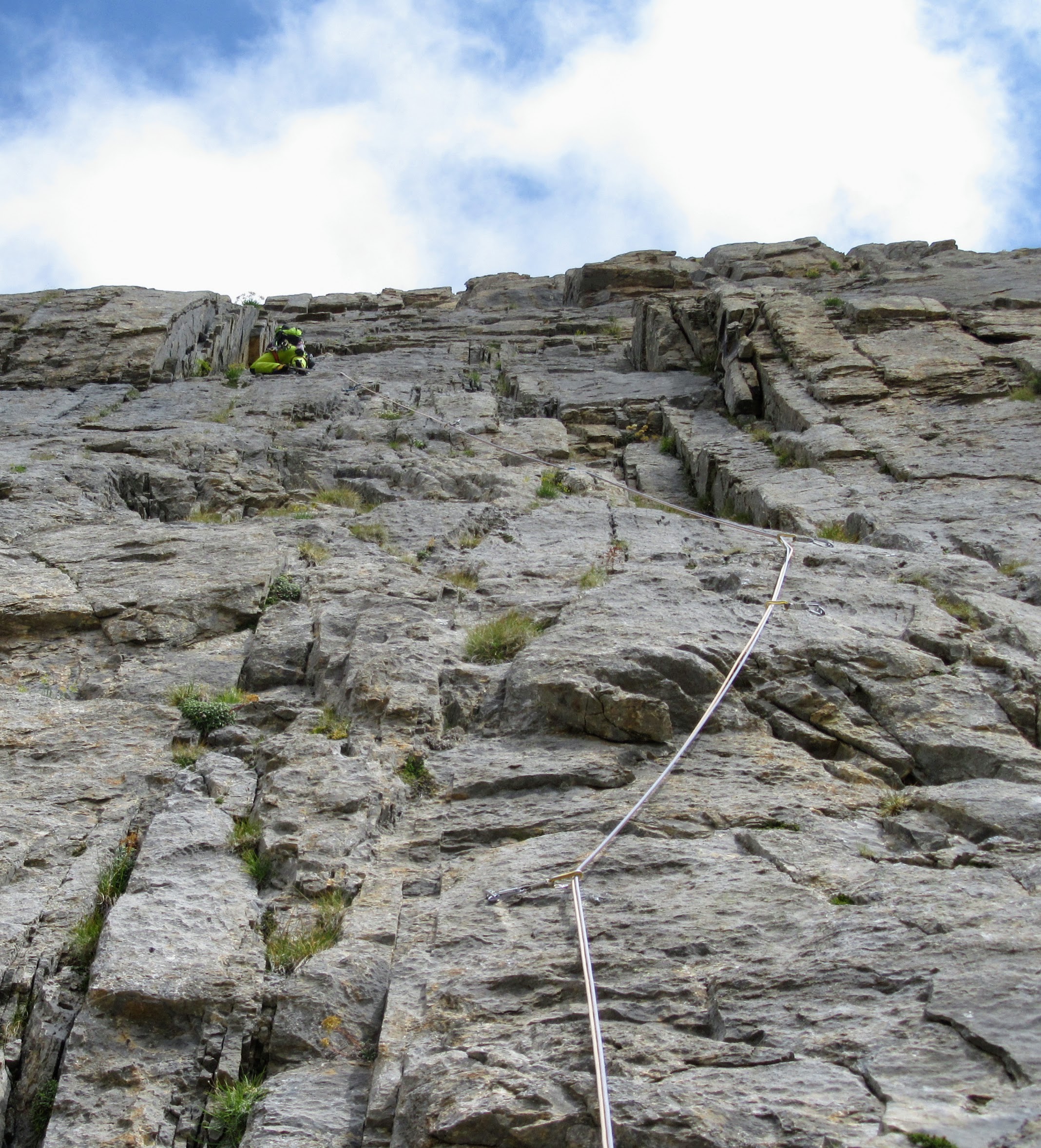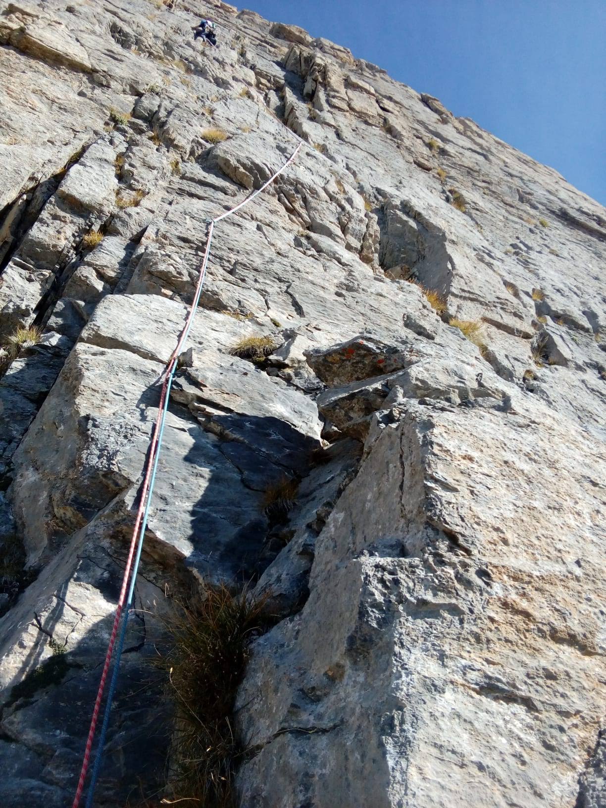 - L2: si sale un muro verso destra (5b), poi si obliqua a sinistra fino ad un diedro, si sale la placca destra del diedro (5b continuo) per poi uscire a sinistra e sostare su una comoda cengia (8 spit + 2 spit di sosta, 40 m)