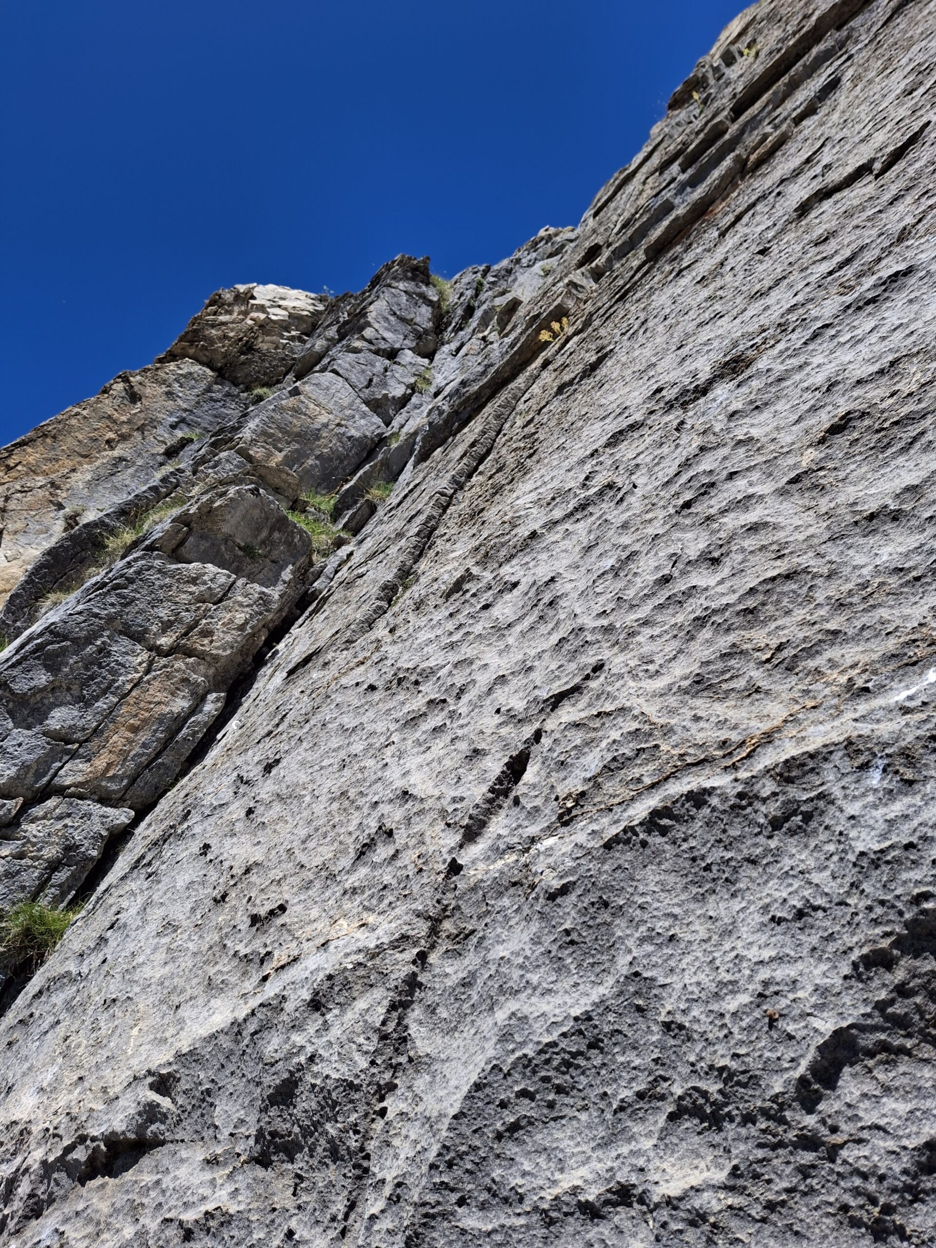- L1: si sale la placca (5b), la fessura-diedro (4b), poi una placca verticale (5b), infine per placche facili (3b) fino alla sosta su una piccola cengia (7 spit + 2 spit di sosta, 50 m)