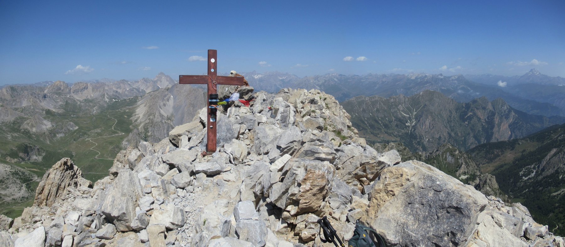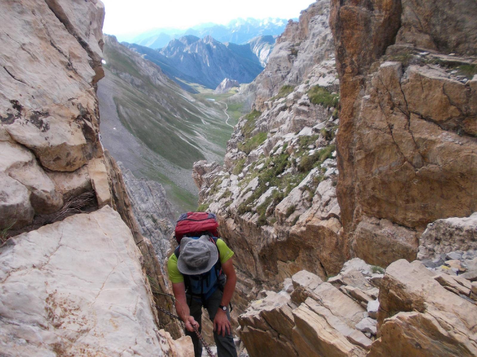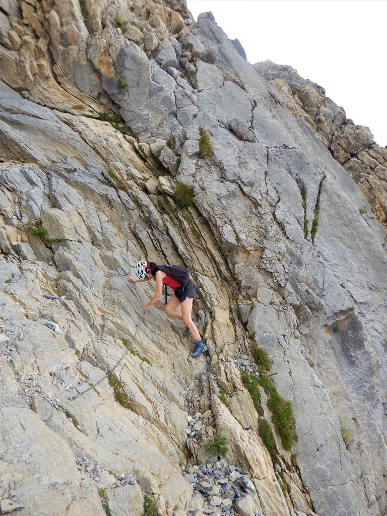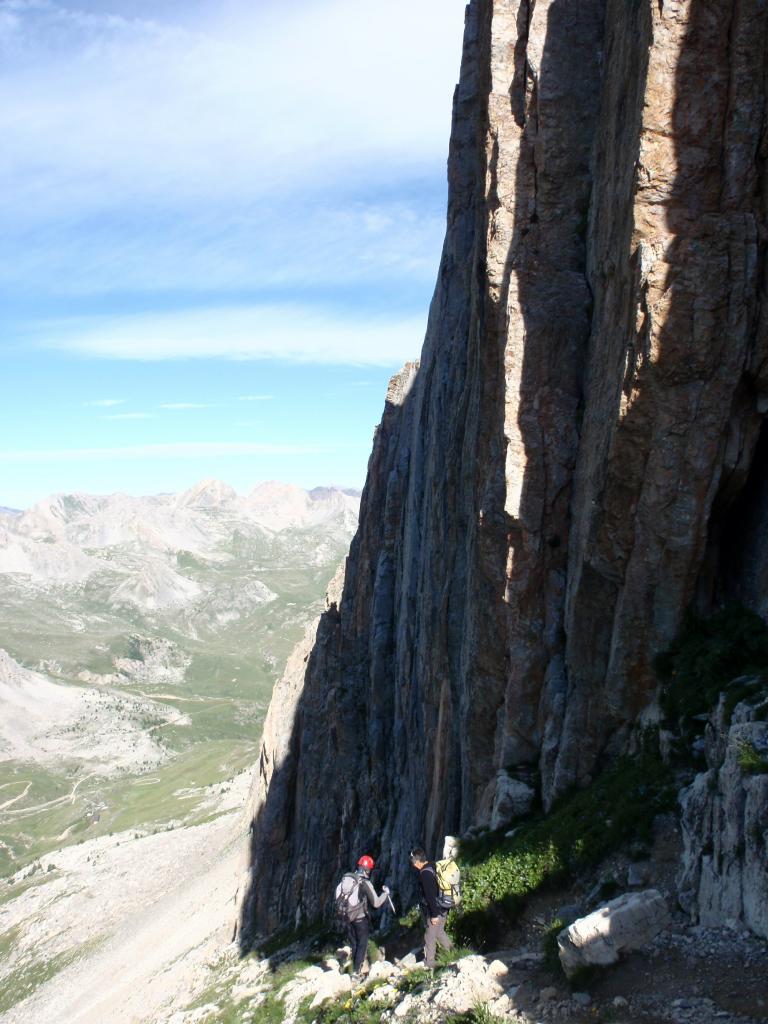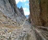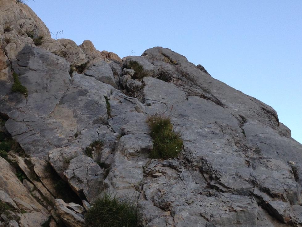 costeggiare due piccoli laghi, dal colle si gode ottima vista sulla Meja, che compare in tutta la sua imponenza, proseguire su tracce di sentiero fino alla base della stessa,superare un tratto di parete caratterizzato da un enorme diedro, continuare sino ad evidente canalone di sfasciumi a destra, risalirlo (madonnina bianca dopo qualche decina di metri) sino in cima, girare a sinistra e poi proseguire su altro canalino evidente che termina con un passaggio di II attrezzato con catena, poi si continua sul canale di fronte, terminato il quale si prosegue a destra fino a raggiungere la cima, due ore circa dalla macchina.