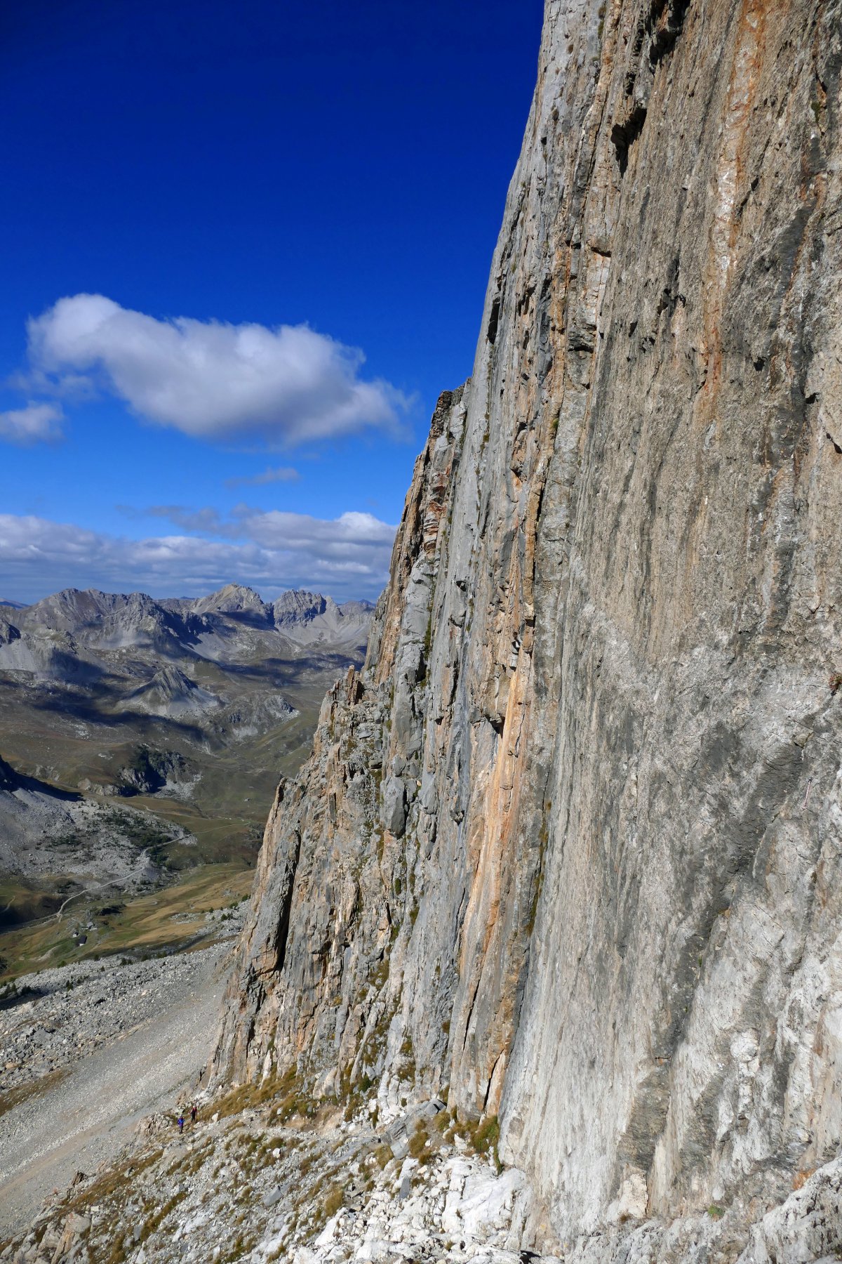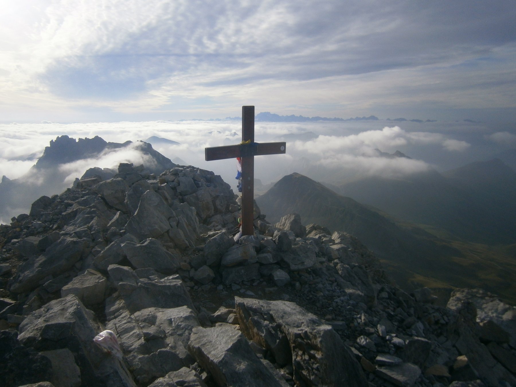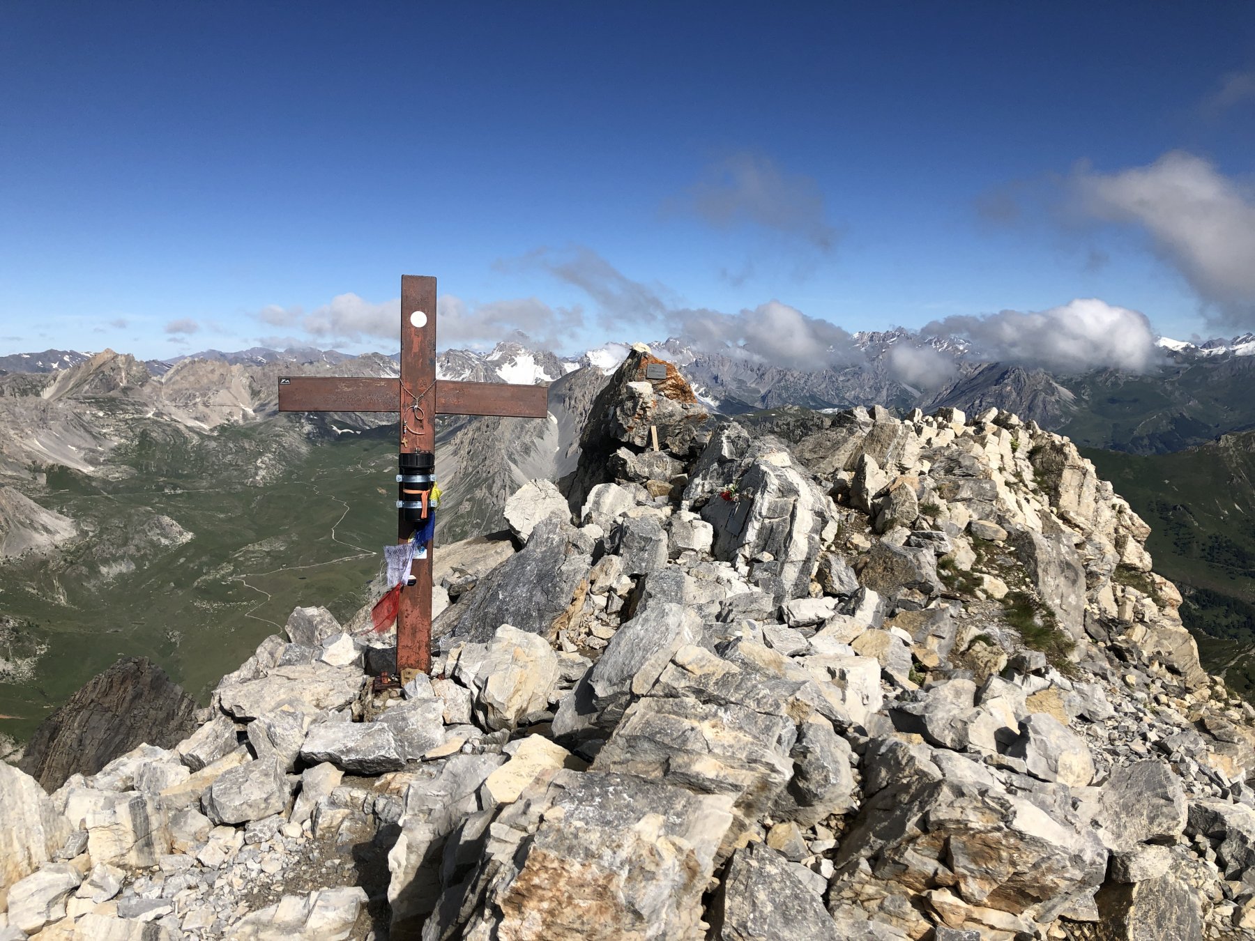 costeggiare due piccoli laghi, dal colle si gode ottima vista sulla Meja, che compare in tutta la sua imponenza, proseguire su tracce di sentiero fino alla base della stessa,superare un tratto di parete caratterizzato da un enorme diedro, continuare sino ad evidente canalone di sfasciumi a destra, risalirlo (madonnina bianca dopo qualche decina di metri) sino in cima, girare a sinistra e poi proseguire su altro canalino evidente che termina con un passaggio di II attrezzato con catena, poi si continua sul canale di fronte, terminato il quale si prosegue a destra fino a raggiungere la cima, due ore circa dalla macchina.