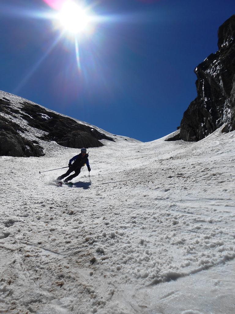 Saliti per il pendio-canale alla destra del classico canale NW, abbiamo optato per la discesa del versante nord est del Mercantour in quanto la neve a nord ovest si presenta alquanto irregolare e butterata. Discesa NE assai frequentata in questi giorni: dopo il breve traverso in partenza occorre togliere gli sci per superare facilmente alcune roccette emergenti, poi pendio liscio con neve cotta a puntino.