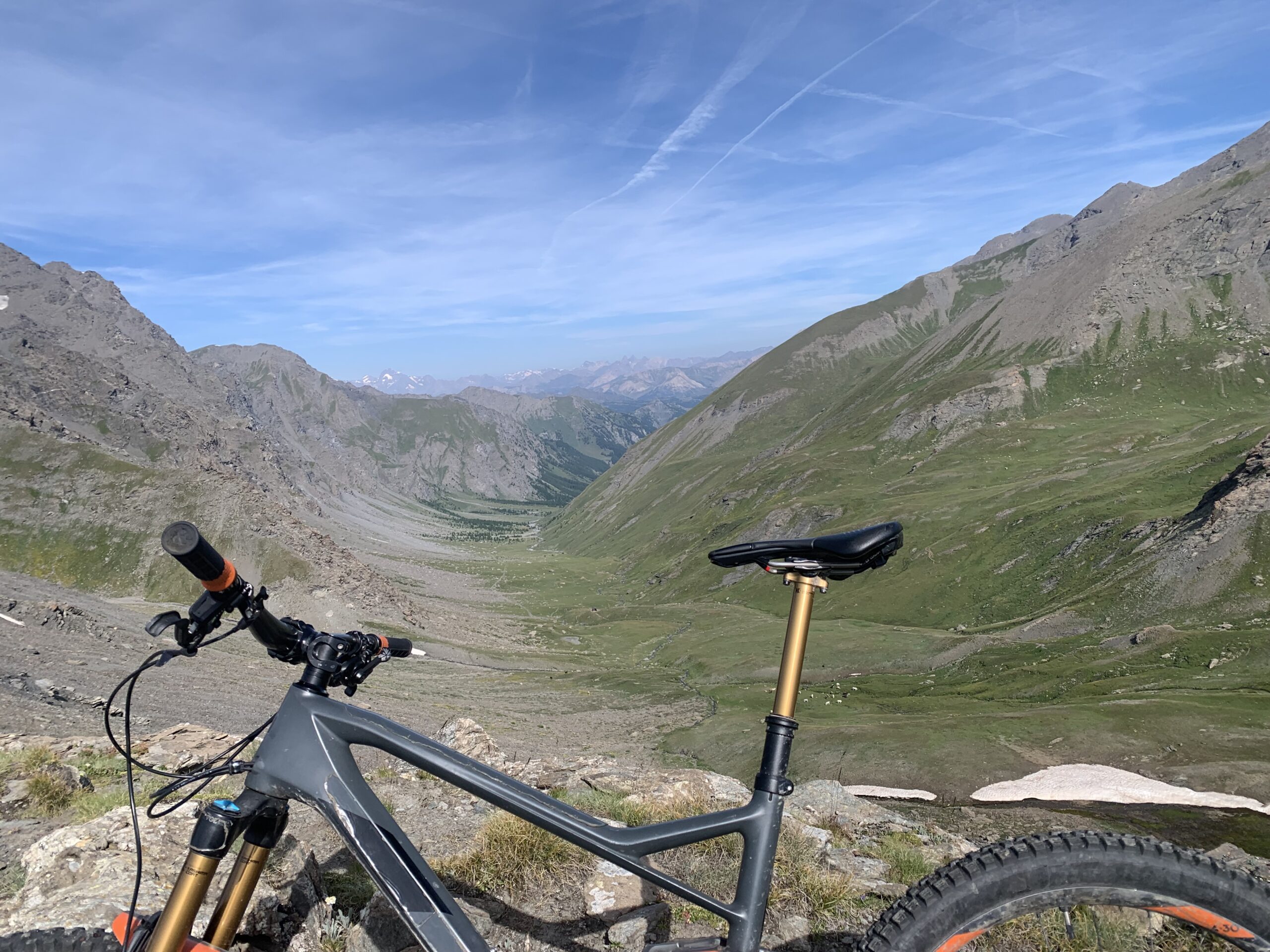 Discesa: tornare sulla traccia di salita e proseguire sino al col Marlif; qui svoltare a destra e seguire il bellissimo sentiero che scende, tra tratti flow tipici del Queyras e passaggi più tecnici, nel vallone di Les Fonts. Proseguire (consigliato in sx orografica per evitare l’asfalto) sino a 1880 circa ove si svolta a destra e, passando per Le Clots, risalire per sterrata/sentiero (molto ripidi – spintage 250 d+) verso il Col Bourget e poi Col Bousson. Da qui scendere verso capanna Mautino e poi a Bousson sempre su single track molto divertente.