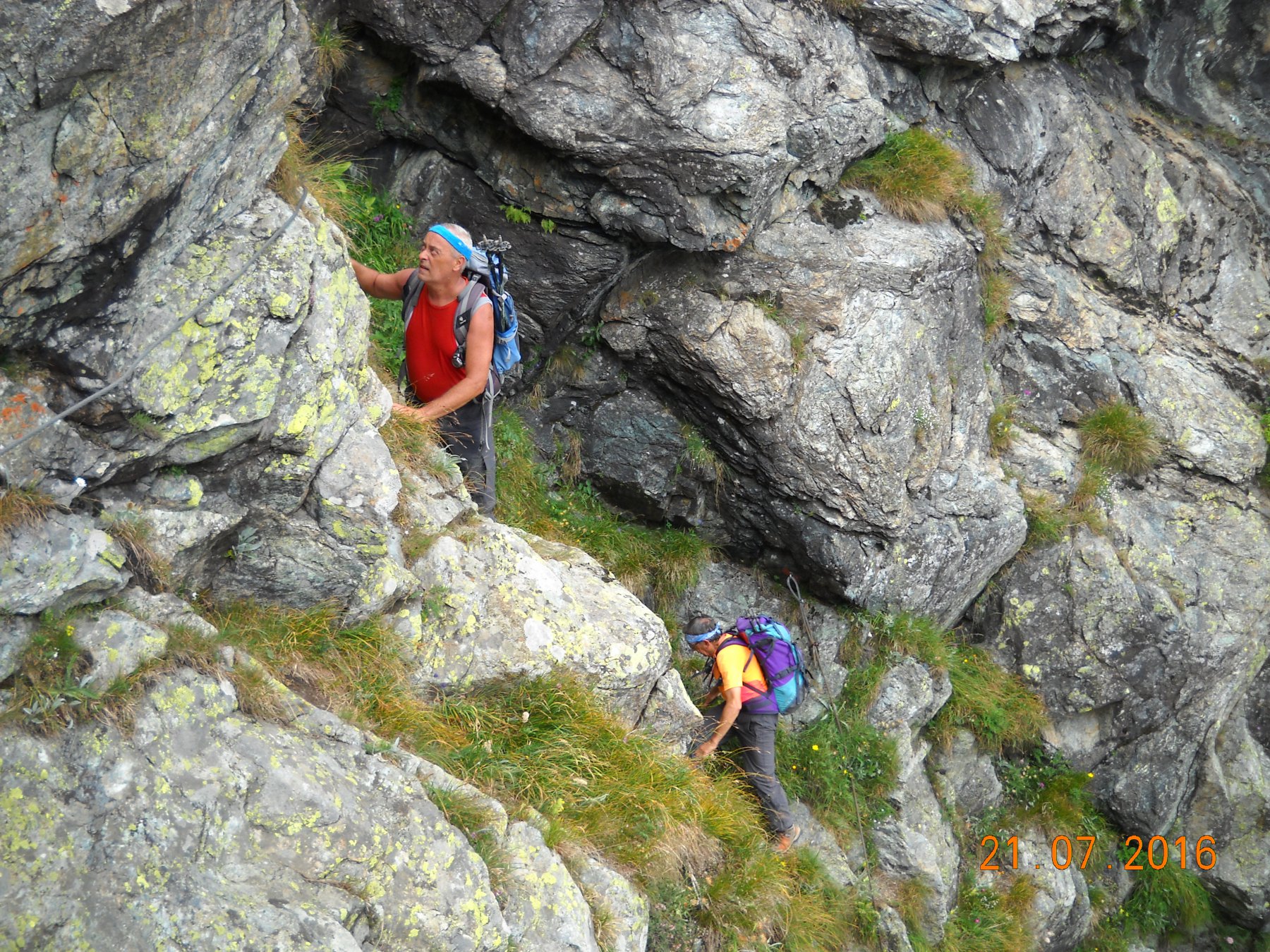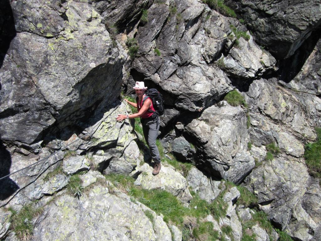 Al termine di questa proseguire su un’altra cengia sempre in salita in direzione Ovest-Est fino ad infilarsi in un canalone che via via si restringe (corde metalliche fisse).