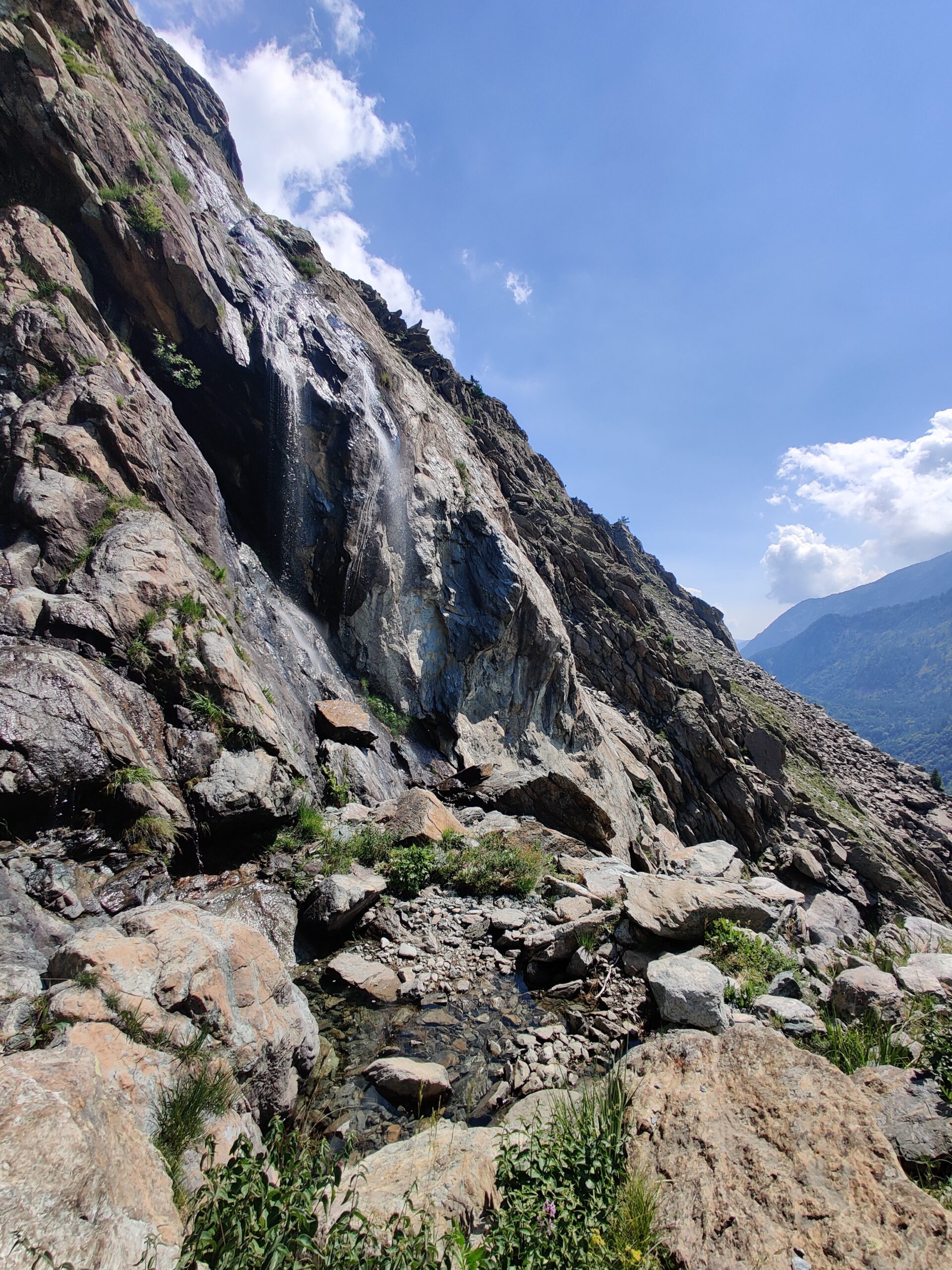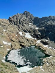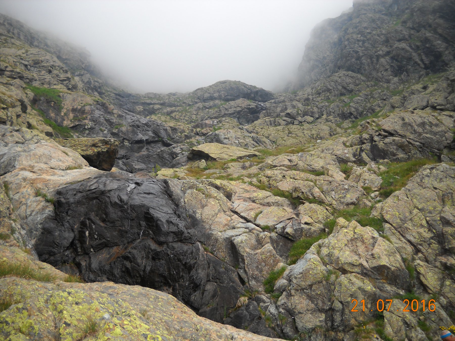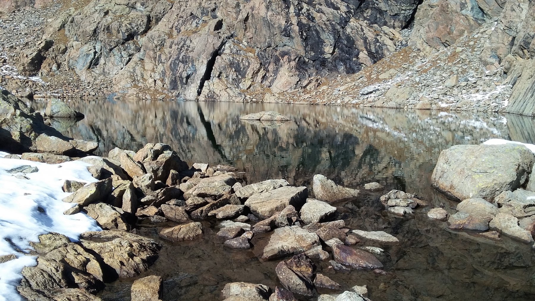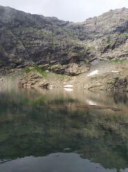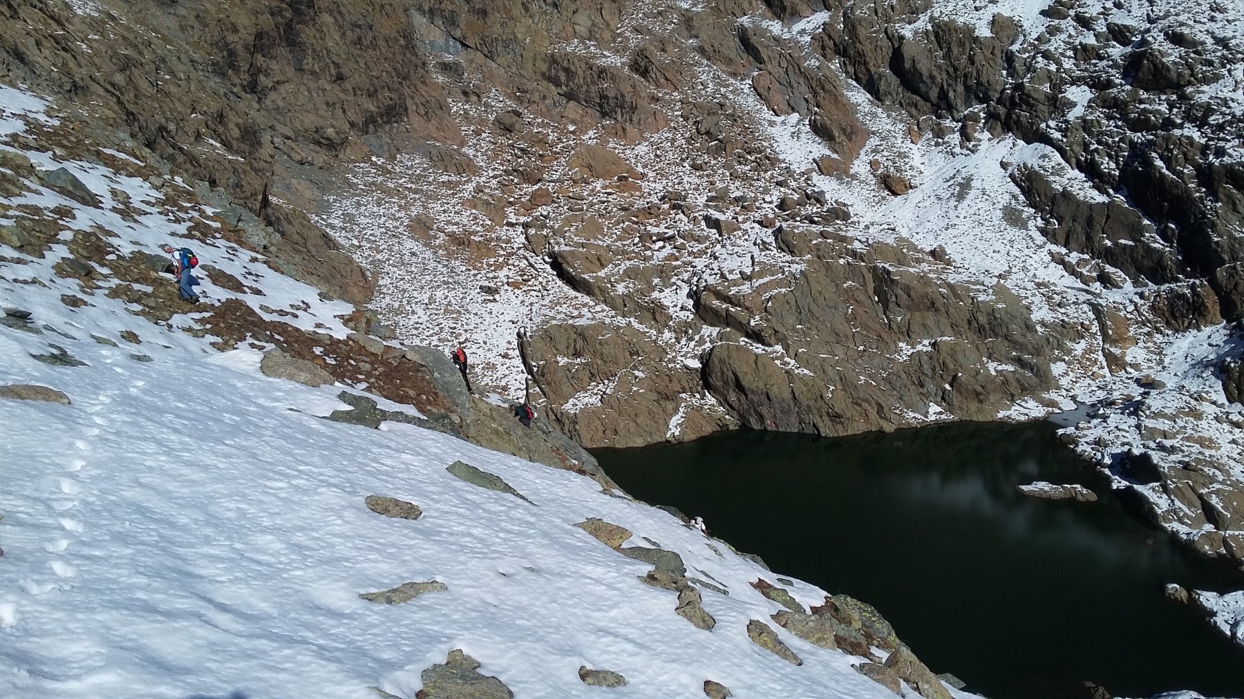 Di qui si prosegue con un lungo traverso verso Est (bolli rossi sbiaditi) e dopo una breve discesa e risalita, per balze rocciose si giunge al lago Mercurin.