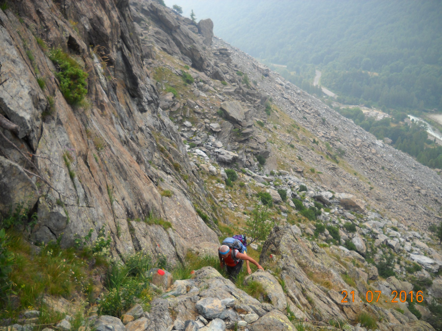 Dall’Albergo Camussot imboccare il sentiero che parte alla sua destra. Proseguire fino ad un bivio e tralasciare il sentiero di sx (Lago Mercurin “normale” – Palestra del Genevrè) e proseguire verso destra con un lungo traverso sui canaloni detritici che scendono dalla parete che si sta per salire (al momento della stesura della descizione invaso da alberi caduti). Seguendo sempre le moltissime tacche rosse sbiadite salire in direzione della parete fino all’imbocco di una prima cengia in salita che si percorre interamente in direzione Est-Ovest superando alcuni facili saltini rocciosi.