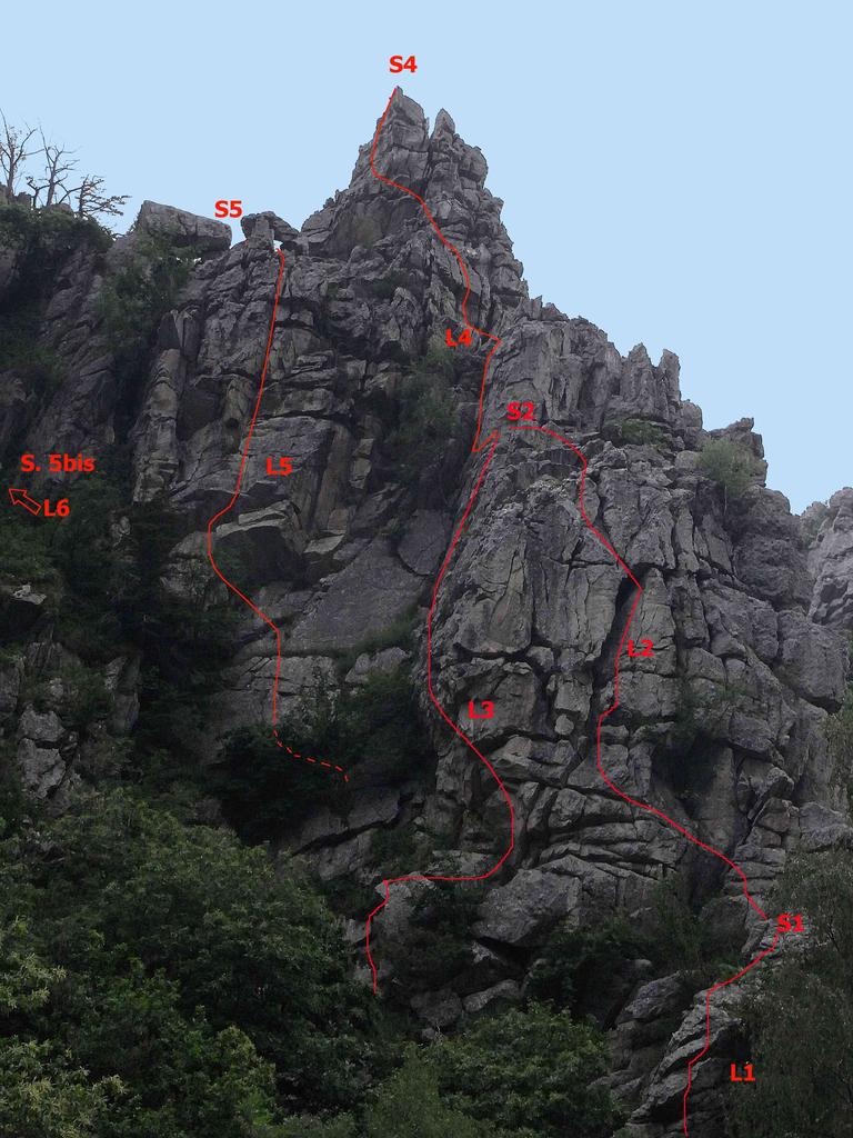 1) Kyè, 60m, 3 lunghezze (L1: 5c+, 2om. L2: 4c, 18m. L3: 5b, 35m.). Chiodatura rivista.