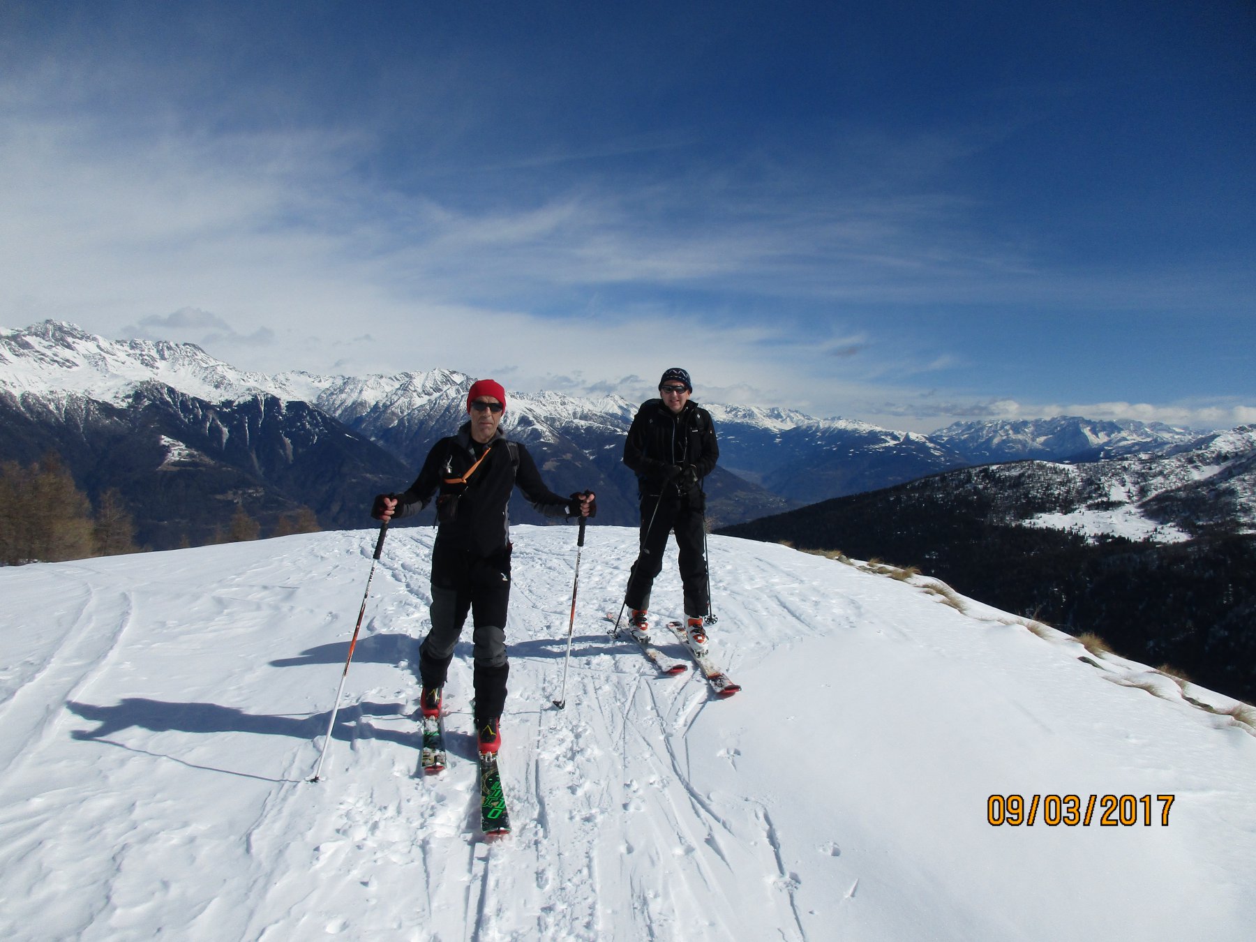 Si arriva in macchina fino a Campei: la strada è ghiacciata solo negli ultimi cento metri. Cielo sereno con qualche velatura, caldo, niento vento qui, ma vento forte sulle retiche. Salita su buona traccia fino in cima e discesa su neve bagnata spacca-gambe fino al punto di partenza.