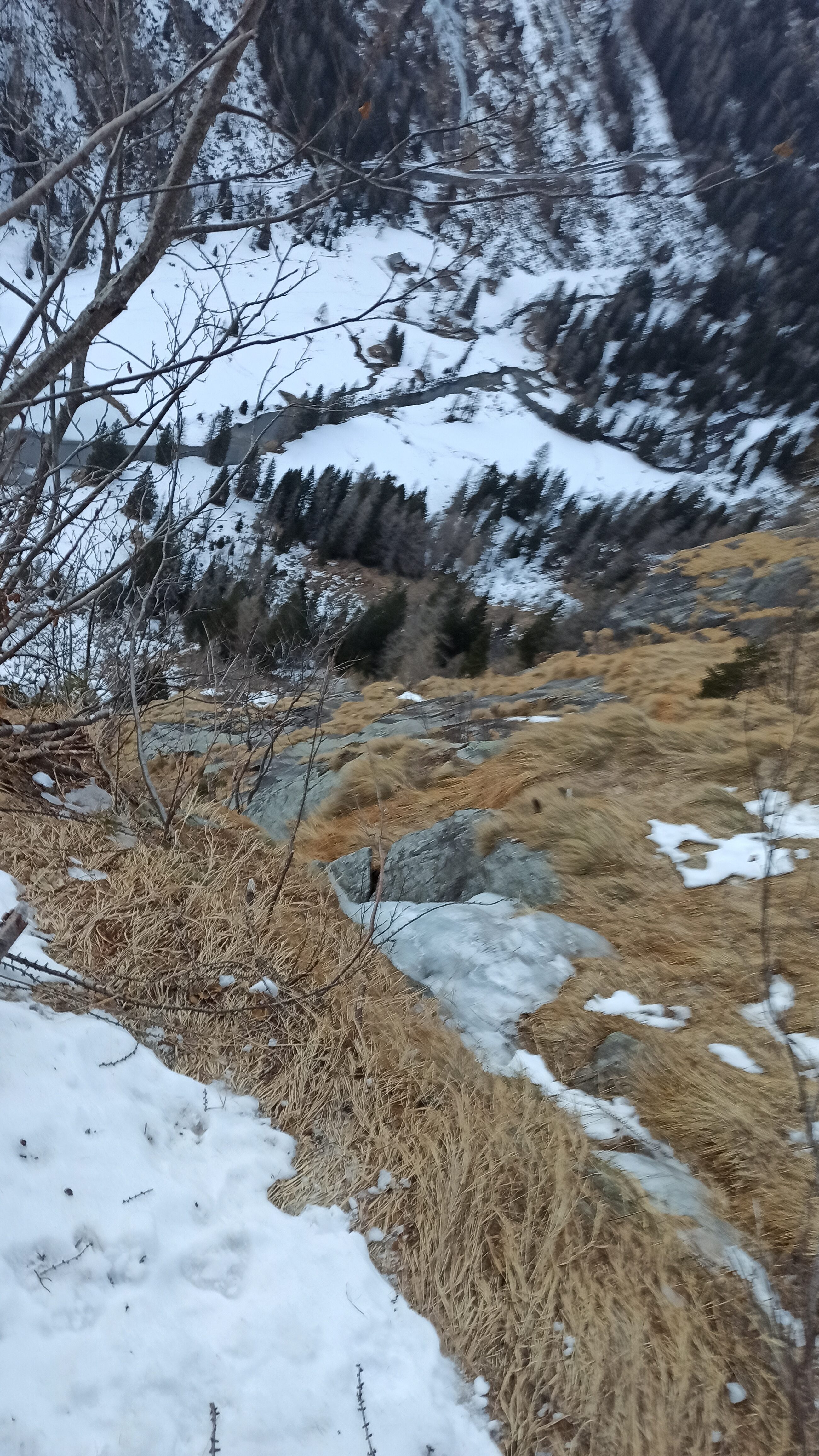 Free solo partendo alle 12.30 da casa. Sole e caldo, si stava con i guanti leggeri da misto. Discesa ripida nel bosco con qualche piccolo tratto da disarrampicare fra gli alberi.
