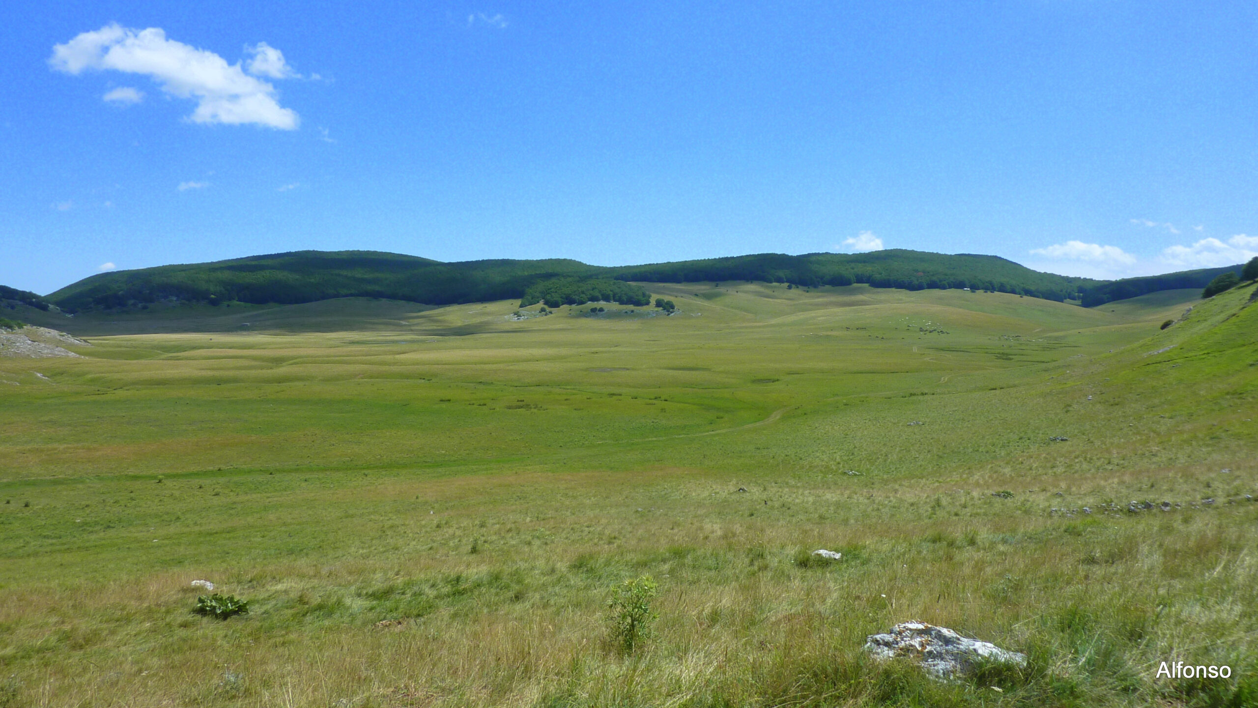 Da Castel del Monte si sale su strada asfaltata fino al Valico di Capo la Serra (1.600), oltrepassato il quale, dopo alcuni tornanti in discesa si incontra a quota 1.517 mt la deviazione per il rifugio Ricotta. Si pedala sulla carrareccia che parte davanti al casolare diroccato, un tempo ricovero di pastori e che scende ad un fontanile anch’esso diroccato, sull’altopiano del Pacino, da dove è già visibile l’aguzza vetta rocciosa (la seconda in lontananza). Raggiunto un bivio si va a sinistra (indicazioni per Valle Caterina e Malepasso) in salita sempre su carrareccia e dopo una curva a sin. a circa 1.520 mt. si lascia la strada e con la bici in spalla si piega a destra per prati e tracce ripide di sentiero fino a raggiungere la dorsale del monte Meta, dove proseguiamo senza via obbligata tra arbusti e alberelli; man mano che si sale la cresta diventa più definita e si incontra qualche ometto fino a raggiungere l’anticima (mt. 1.766). Per tutto questo tratto conviene portare la bici in spalla, anche lo spintage è faticoso tra gli arbusti. (sono circa 250 mt.). Oltre alla stupenda vista sul Corno Grande, il Prena e il Camicia ci appare la Majella, il Sirente e l’altopiano del Voltigno, dietro il quale, senza foschia, è possibile scorgere il Mare Adriatico. Mantenendosi sul lato sinistro della cresta si scende bici al fianco alla larga sella a q. 1715 da dove un’ultima salita più ripida porta in vetta (1.784). Sulla cima c’è un cumulo di rocce, una croce costruita con due rami e una scritta poco leggibile, ma il panorama, sebbene si sia a quota contenuta, certamente ripaga dello sforzo. Soltanto all’ultimo passo si vede anche il borgo di Castel del Monte! Se abbiamo portato la bici in vetta in discesa si riesce a stare in sella. Dalla Sella si inizia a scendere nel bosco, ma i primi 100 metri circa di dislivello si fanno a piedi causa sottobosco molto sporco con rami rotti e detriti vari. Senza sentiero ben definito (qualche paletto nel bosco) si punta alla grossa costruzione della Fonte della Cornacchia. Se si è riusciti a seguire il percorso logico si sarà passati anche da una piccola sorgente (Fonte della Cornacchiella), ma non è così importante. Giunti alla Fonte (1.400) e passando a fianco di una grossa stalla si segue la strada inerbita pedalando nella bellissima prateria carsica del Voltigno, dirigendosi vs Sud Est. Ad un bivio sempre su traccia inerbita ci dirigiamo vs Nord fino nei pressi dei Laghetti Sfondo dove spesso si abbeverano cavalli e altri animali al pascolo. Pedaliamo seguendo dei paletti di legno e tracce sull’erba fino al Vado di Focina (1.383) dove arriva la strada che proviene da Villa Celiera (parcheggio). Dalla Punta del Monte Meta o dalla Sella è bene guardarsi questi obiettivi (Fonte, Laghetti e Parcheggio), tutti ben visibili per evitare errori quando si pedalerà nella prateria e avere la direzione di marcia. Dal Vado di Focina (parcheggio con pannello e cartelli, si pedala in salita sul sentiero 279 (indicazioni per Rif. Ricotta). Inizia un tratto molto bello e suggestivo all’interno dell’antica foresta e delle fitte e fresche faggete di Valle Caterina; tra sali e scendi si passa per Mastrorocco (1.374), Valle Caterina (1.474), Malepasso (1.510), fino a raggiungere il bivio dove all’andata abbiamo abbandonato la strada per salire sulla cresta del Meta. In breve raggiungiamo il Rif. Ricotta e dopo una breve risalita su asfalto fino a Capo la Serra, reperiamo nei pressi di un curvone a destra (scendendo) il vecchio sentiero di Sant’Angelo (BC, con brevissimi passaggi OC) tecnico e divertente che ci porta direttamente a Castel del Monte evitando la strada asfaltata pedalata all’inizio dell’escursione.