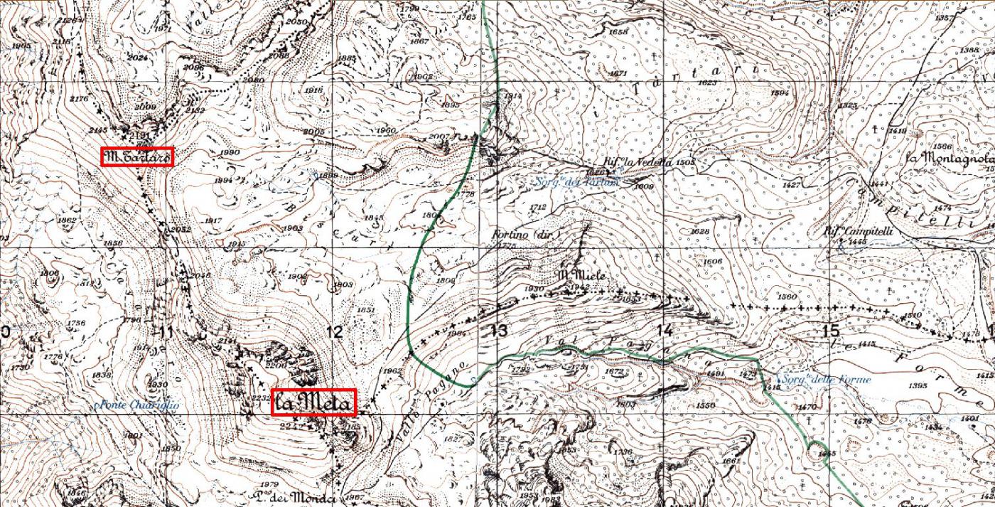 Dal Piano Le Forme si segue il fondo della Val Pagana fino al Passo dei Monaci (1967).Passati sul versante Sud si risale il sostenuto pendio sommitale della Meta fino in vetta (2242).