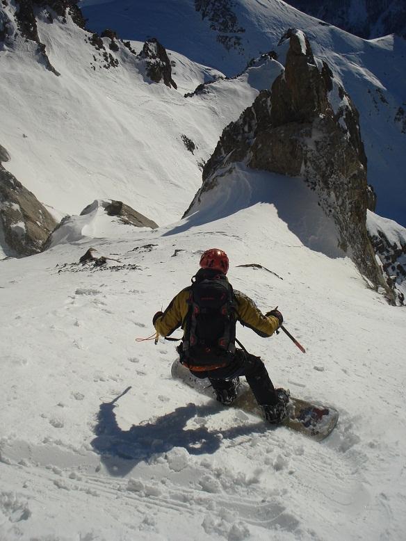 Scendiamo la parete in pieno sole. Breve passaggio di dry ski( io a piedi) e siamo nella cengia. Neve dura. Raggiunto il “masso incastrato” e superato a piedi siamo nel canale. primi cento metri farina morbida poi dove il canale piega a SW ritroviamo la “betonite” che purtroppo non ha mollato, come noi invece avevamo sperato che accadesse. Lamine calde.